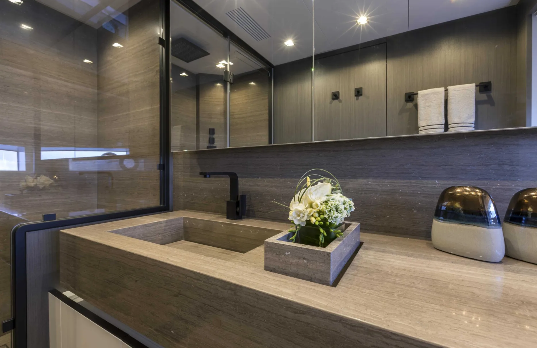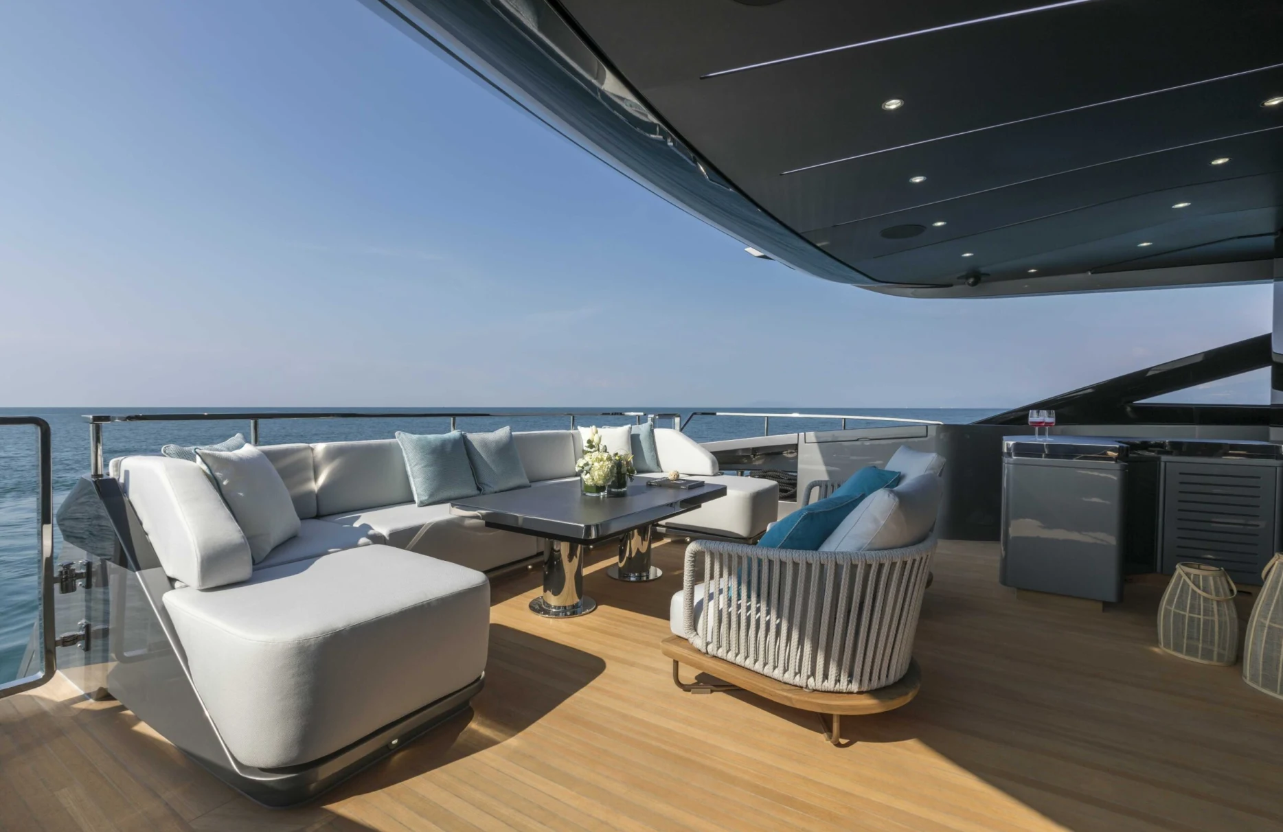 Crazy Too gracefully hosts up to 10 guests in five impeccably designed cabins. Each room, whether it be the master suite or one of the two VIP cabins, exudes a sense of tranquility and sophistication, providing a haven at sea. The cabins’ thoughtful design ensures that waking up each morning feels like a gentle embrace from the Mediterranean sun, with expansive windows flooding the space with natural light and offering ever-changing views of the horizon.