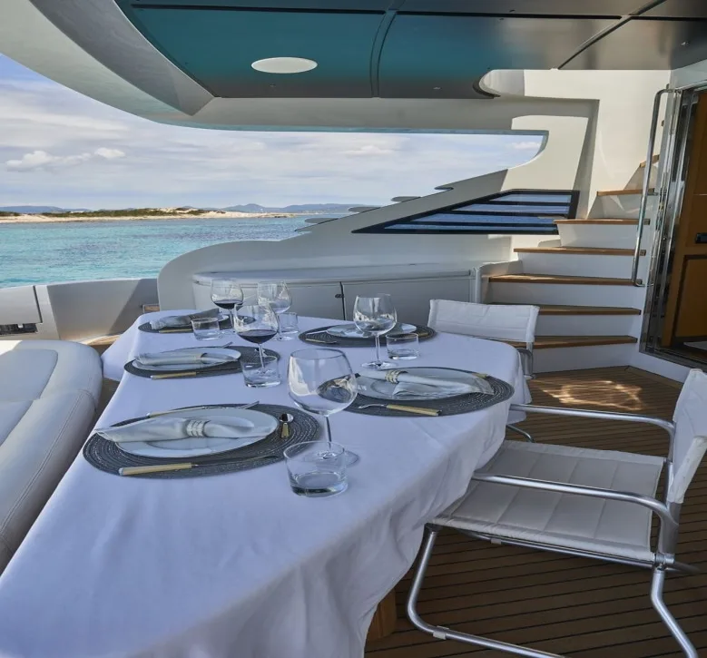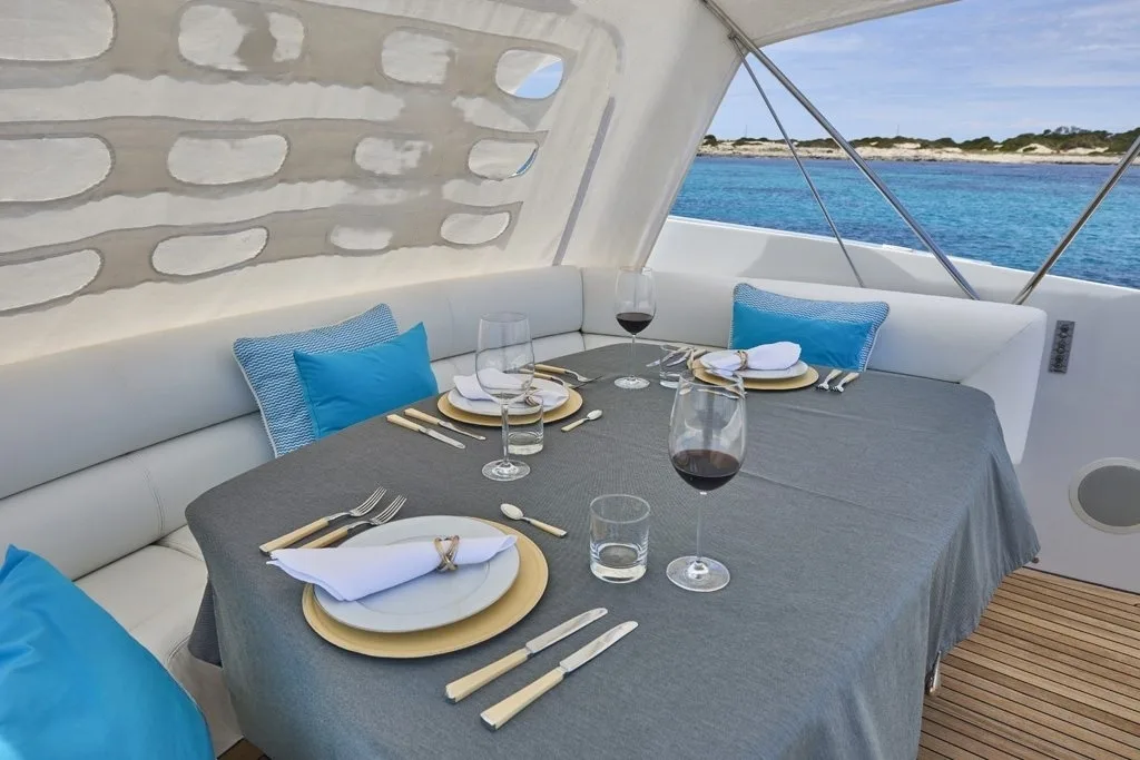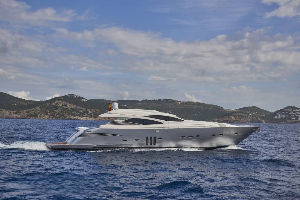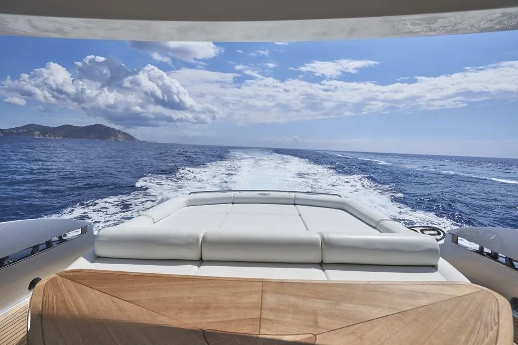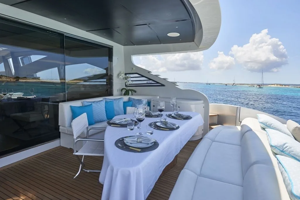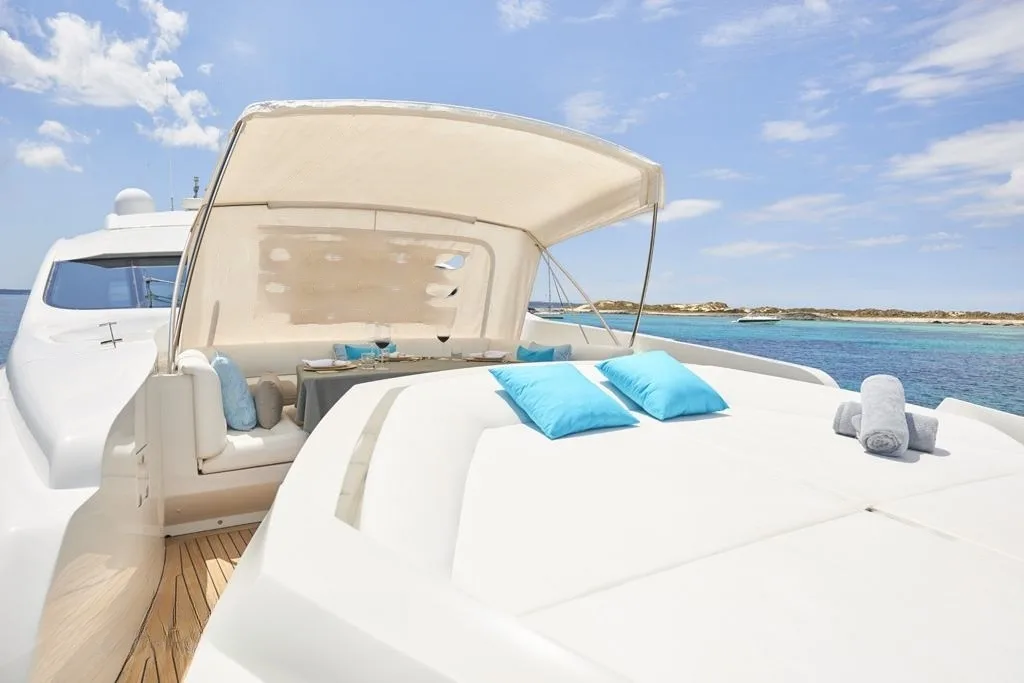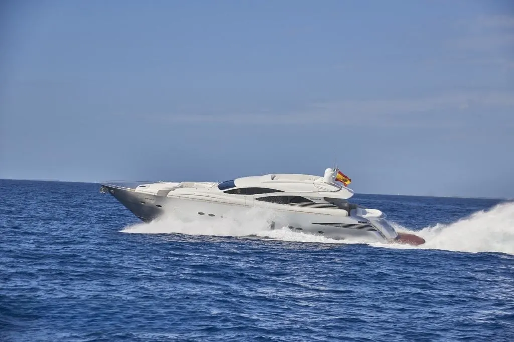 Chartering the Danzas offers an exhilarating blend of speed and style as you traverse the Mediterranean’s azure waters. With her sleek design and robust performance, this Pershing-built marvel is akin to a finely tuned sports car, ready to whisk you away on a journey of discovery. Imagine days spent exploring hidden coves and nights stargazing from her expansive decks. Her ability to reach speeds up to 44 knots means both adventure and serenity are at your fingertips, whether you’re anchored in a secluded bay or cruising alongside the vibrant coastlines of Ibiza and the Balearics.
