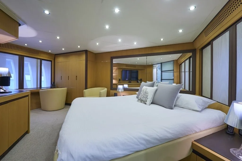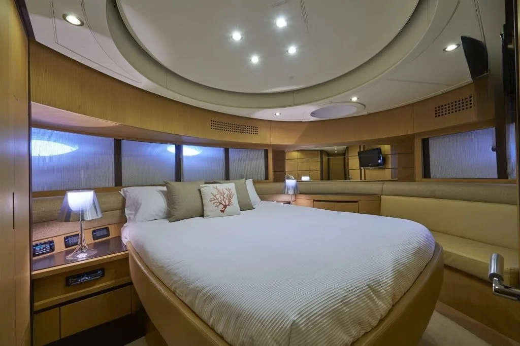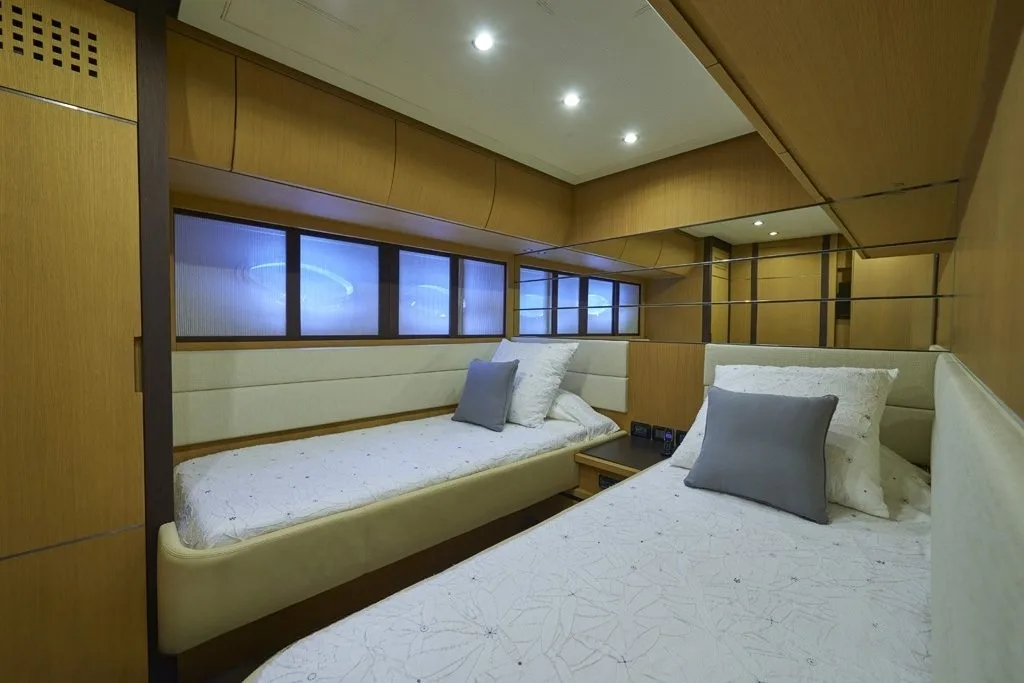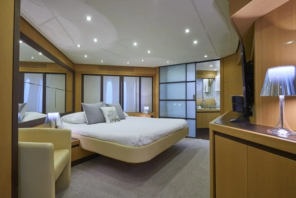 Danzas comfortably accommodates up to eight guests across four luxurious cabins, ensuring a restful and refined stay. Each room is designed with a keen eye for detail, offering a harmonious blend of comfort and elegance. Imagine waking to the soft lull of the sea in one of the master or VIP suites, where panoramic windows frame the morning sun and azure waters. Twin cabins provide additional flexibility for families or friends, enveloping guests in a serene ambiance that makes every night aboard a delight.