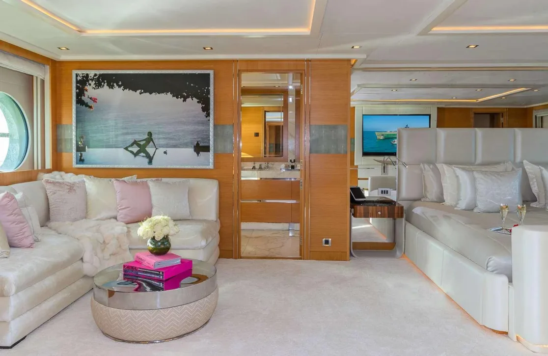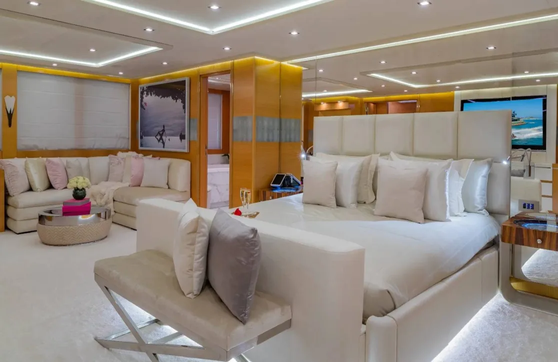 The DB9 invites you to experience life at sea with unparalleled comfort. Whether basking on sumptuous sunpads or enjoying the refreshing embrace of the deck jacuzzi, each moment is crafted for your delight. The yacht’s outdoor cinema offers a unique entertainment experience under the stars, while the air-conditioned interiors provide a cool retreat. At-anchor stabilizers ensure a smooth experience, allowing you to focus on the serene surroundings while sipping a cocktail from the exterior bar.