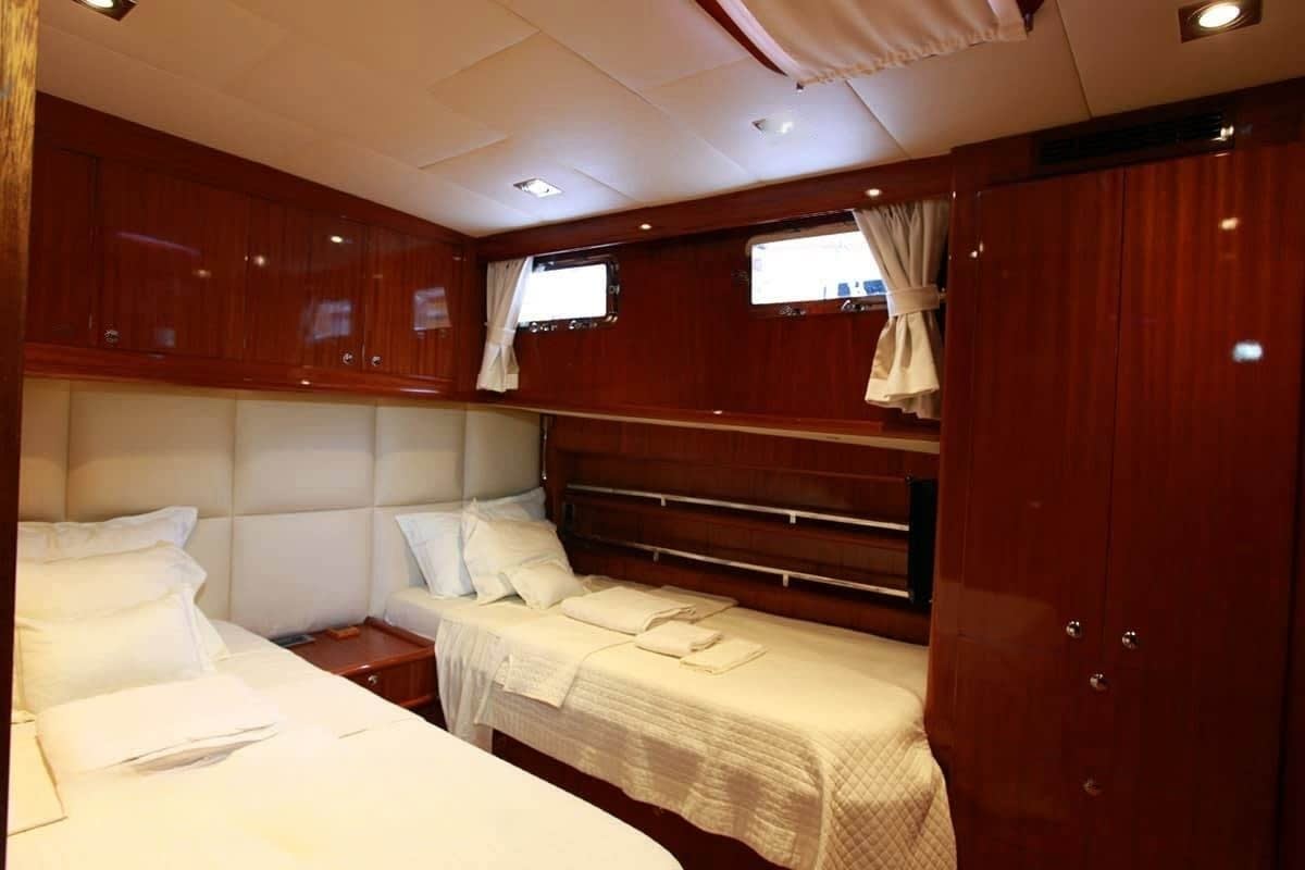 The accommodations aboard Didi are nothing short of inviting, with four well-appointed cabins including a master suite, two double cabins, and a twin cabin. As you retreat to your quarters each night, the gentle sway of the sea lulls you into a restful slumber. Wake up to the soft glow of dawn filtering through your cabin windows, ready to embrace another day of discovery. With space for up to eight guests, each room offers a sanctuary of privacy and comfort, ensuring a serene and personalized retreat throughout your voyage.