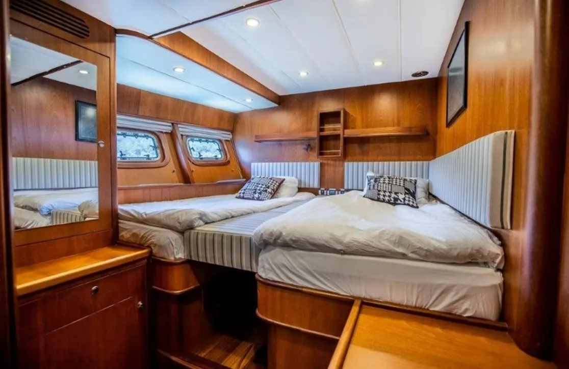 Dilnisin welcomes up to six guests in three beautifully appointed cabins, each designed to evoke a sense of tranquility and comfort. Wake up to the gentle sway of the sea in the master suite, or retreat to one of the two twin cabins, where every detail has been considered for your utmost relaxation. From the soft linens to the elegant furnishings, the accommodations aboard Dilnisin provide a serene escape, offering the perfect respite after a day of Mediterranean exploration.