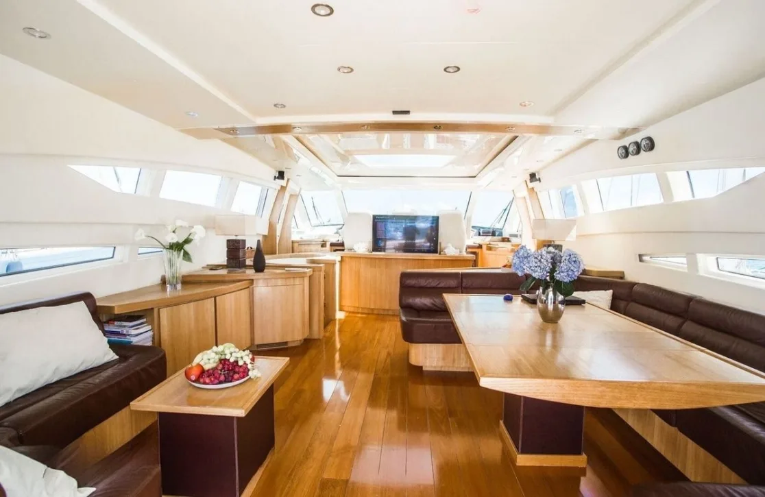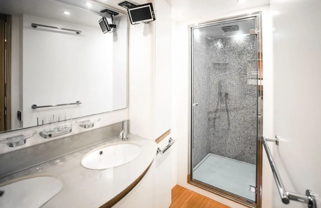 Double D offers a sanctuary for up to nine guests within her four elegantly appointed cabins. Each room is a haven of comfort and style, where waking up to the gentle sway of the sea is a daily delight. The attentive service of a professional crew ensures that every need is met, allowing guests to fully immerse themselves in the serenity of their surroundings. These cabins provide a personal retreat, where the subtle elegance of the design enhances the pleasure of a restful night’s sleep.