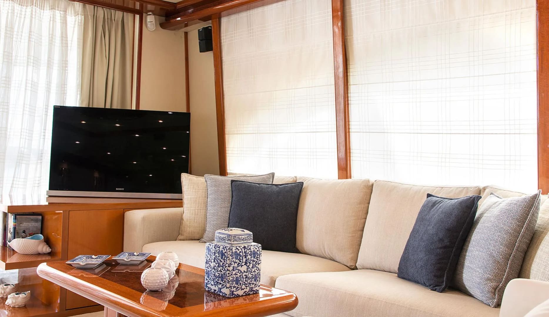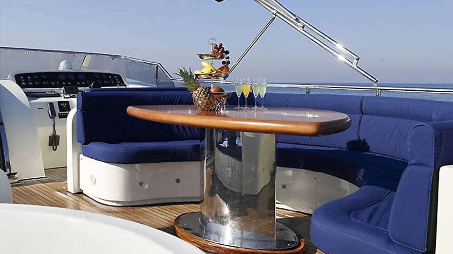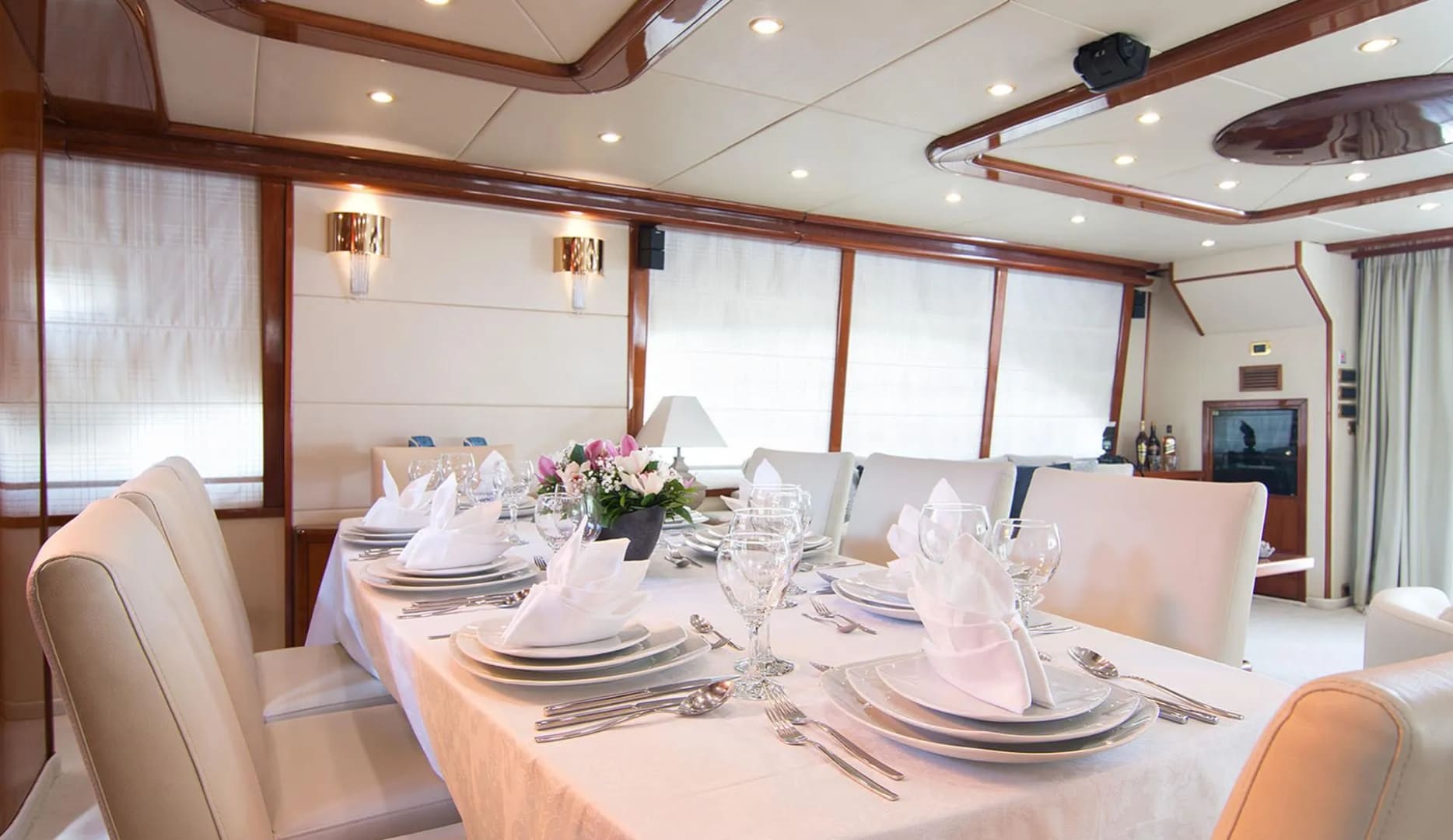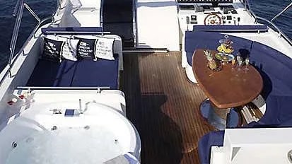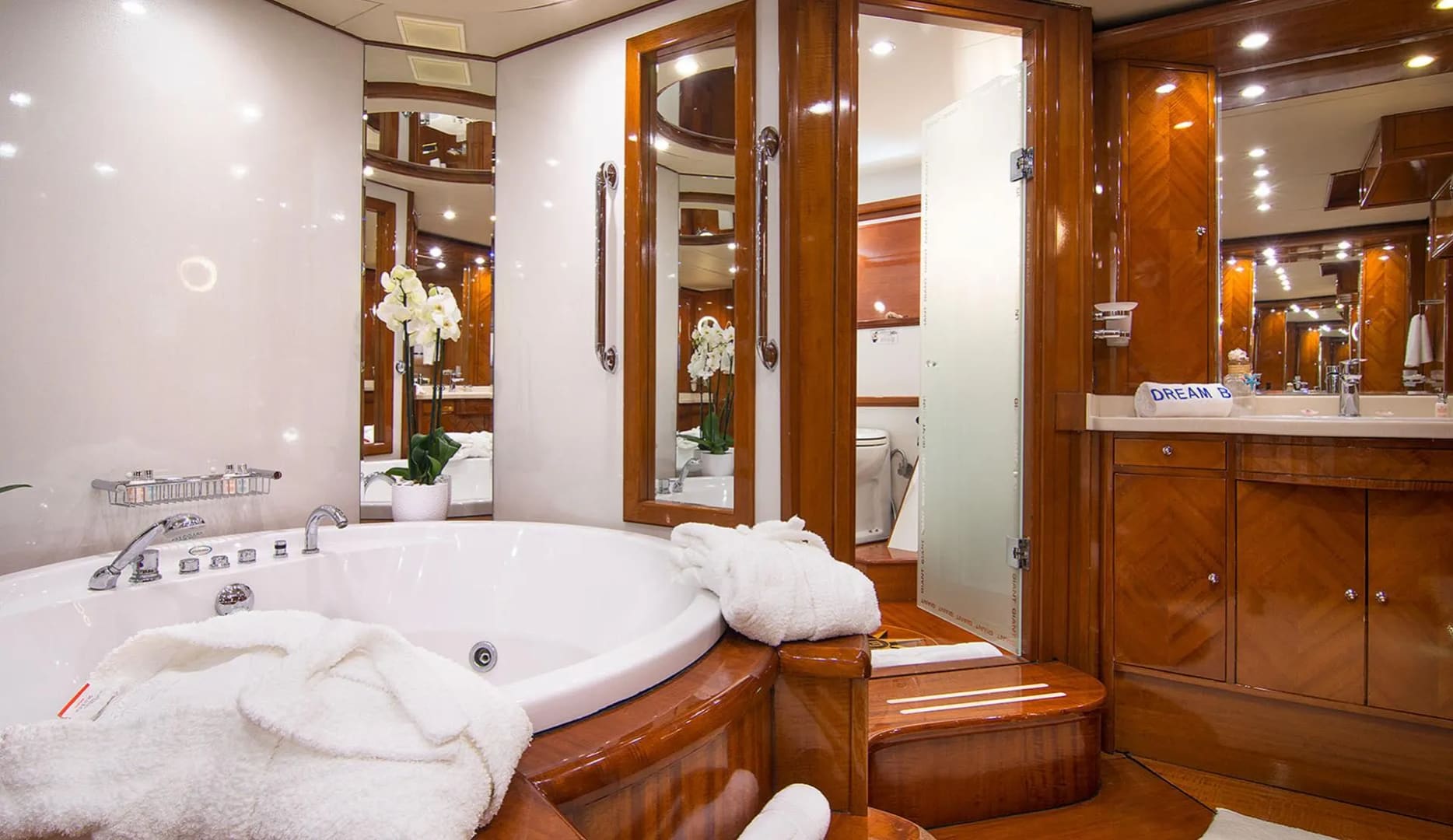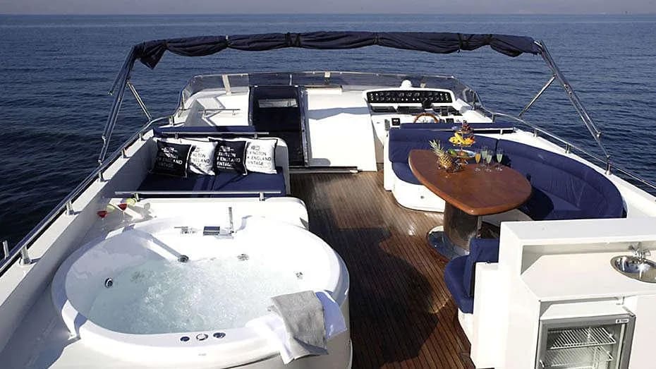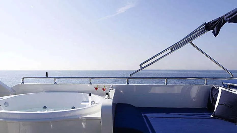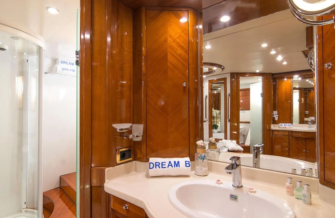 Life aboard Dream B is a symphony of comfort and style. Picture yourself lounging in the warm embrace of the deck jacuzzi, a refreshing drink in hand, while the sun dips below the horizon. Stay connected with Wi-Fi as you unwind with a film on the satellite TV or enjoy a curated playlist from the iPod docking station. Air conditioning ensures a climate of perfect bliss, whether you’re savoring a quiet moment in the salon or hosting an intimate gathering under the star-studded sky.