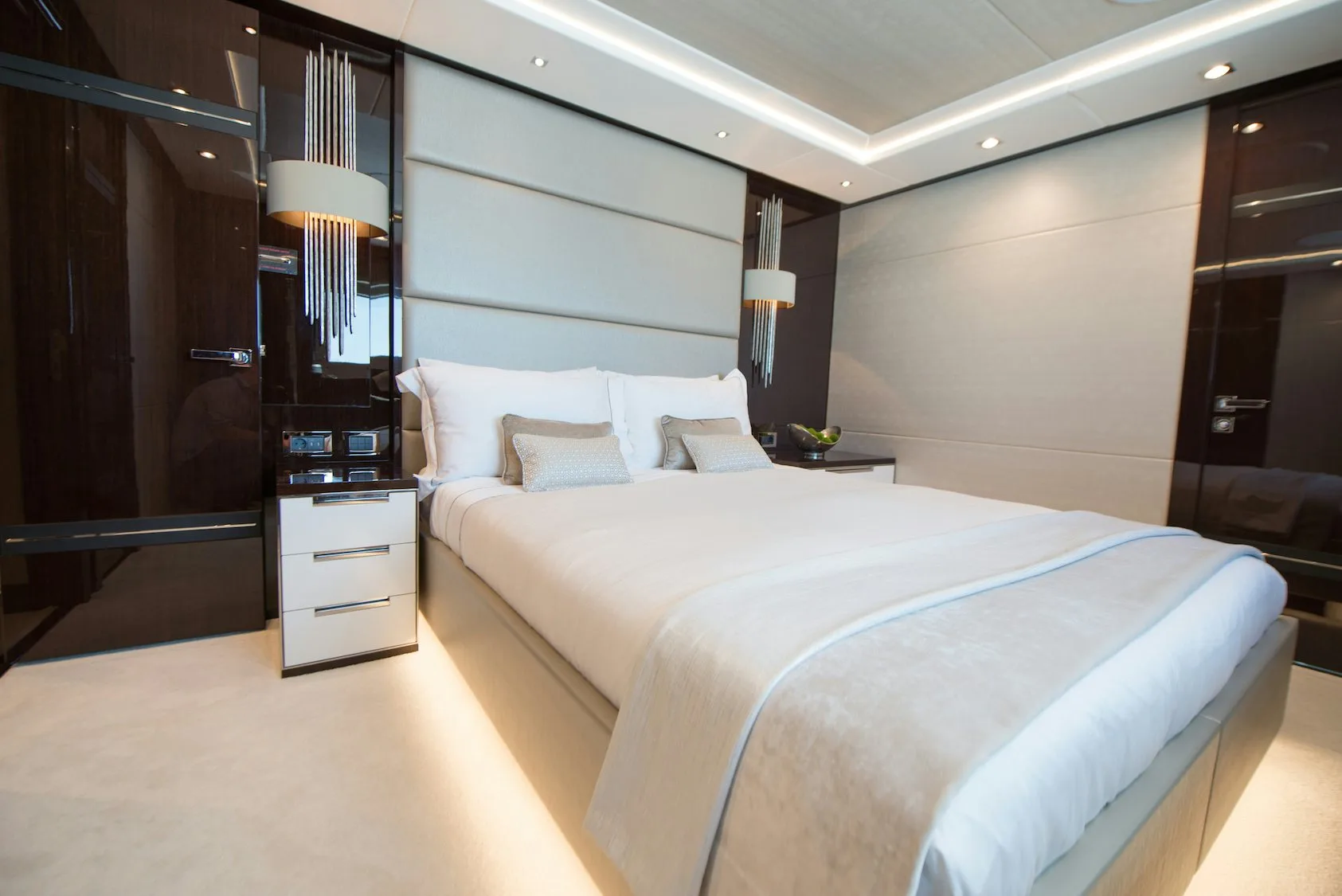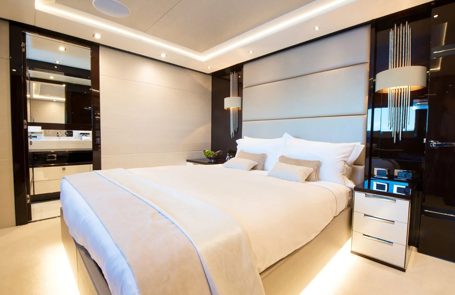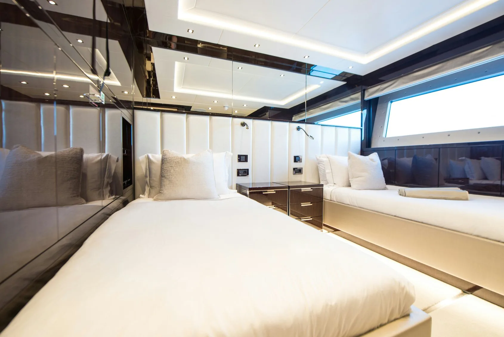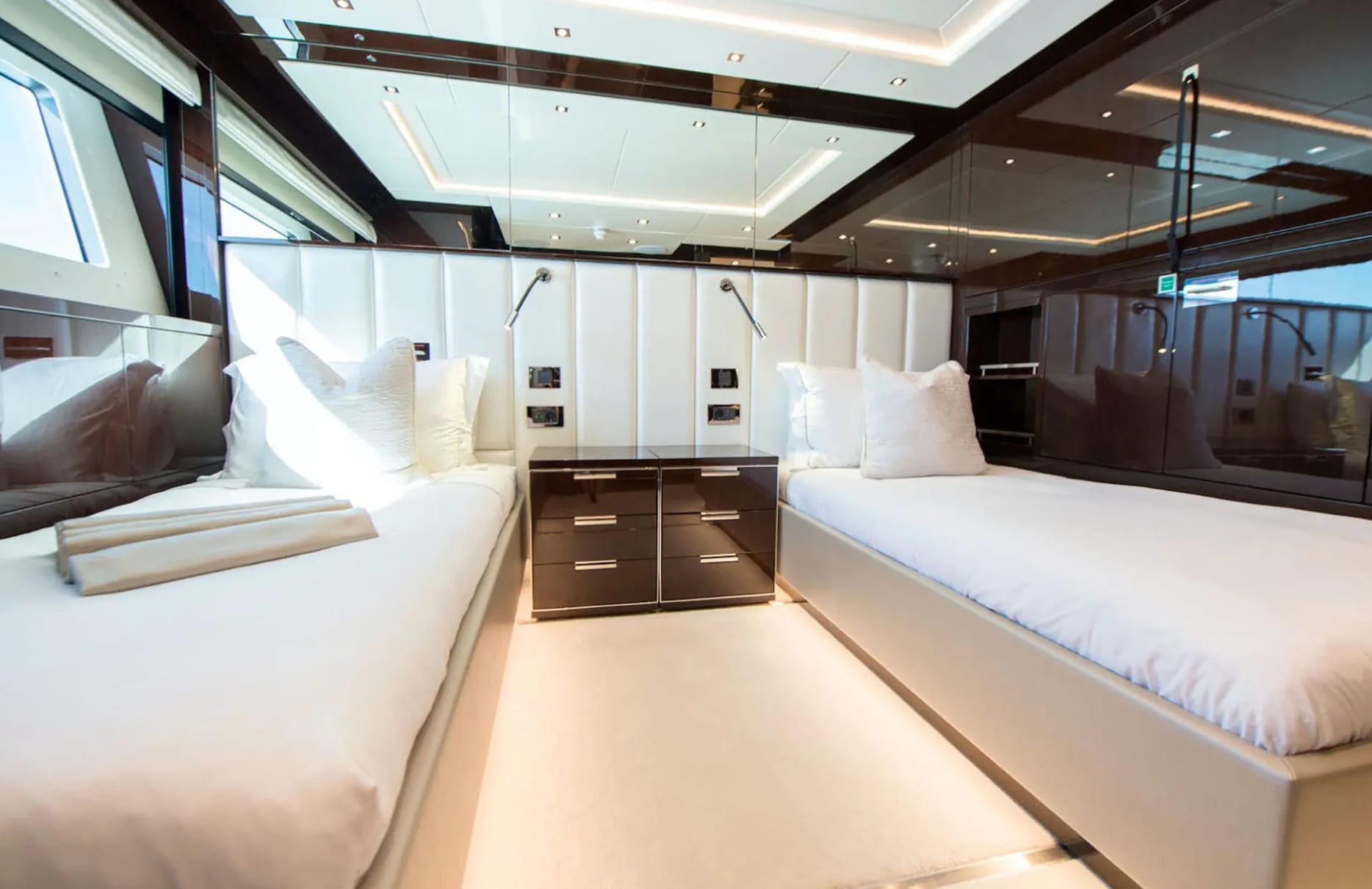 E-Motion offers accommodations for up to 10 guests, ensuring a personal haven for each. The full-beam master suite is a sanctuary of tranquility, complete with a his and her bathroom for unparalleled privacy. Two double cabins and two twin cabins, each convertible, provide flexible arrangements that suit families and friends alike. Wake up to the gentle lull of the waves and let the day unfold from the comfort of your elegantly appointed cabin, where every moment is enveloped in understated sophistication.