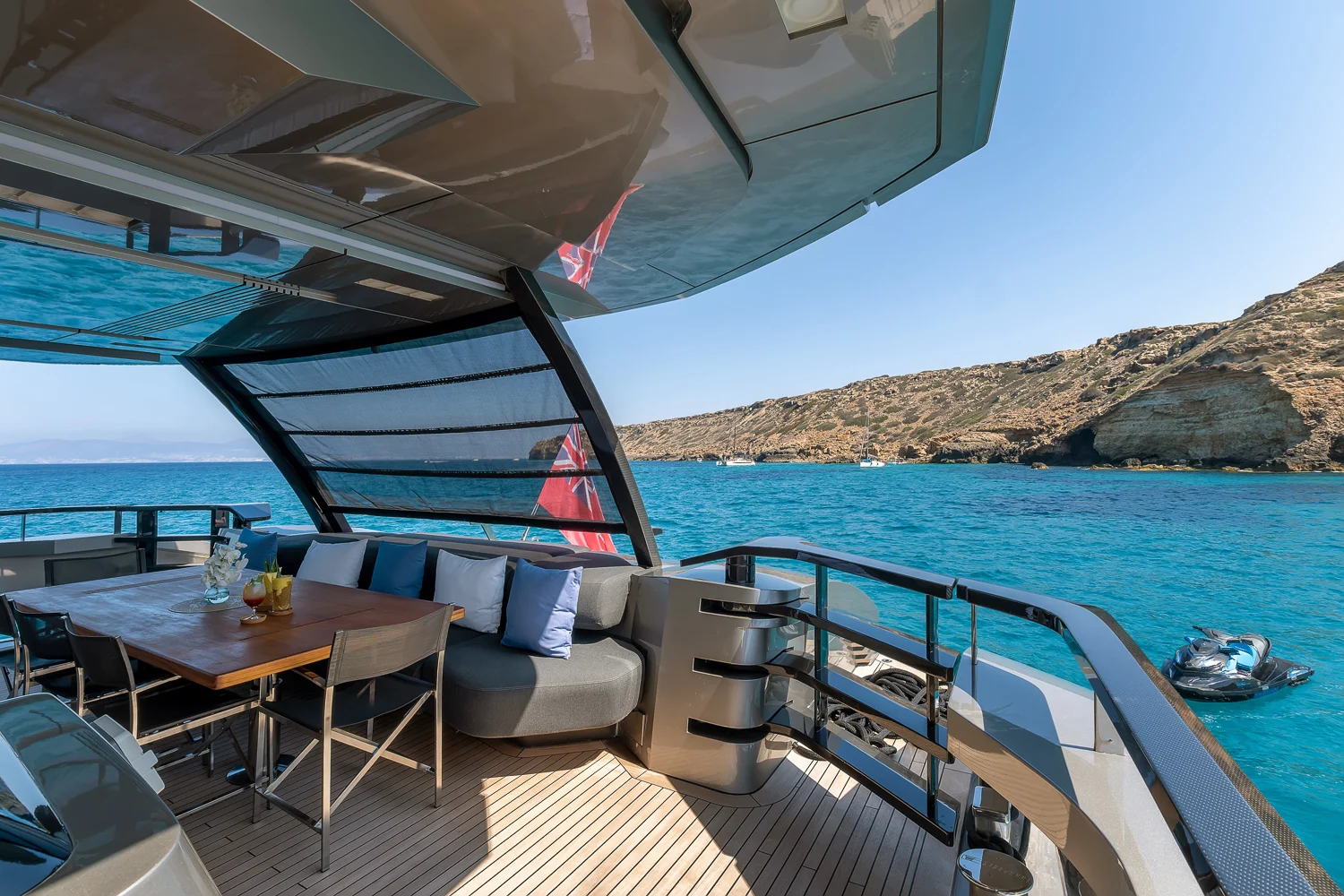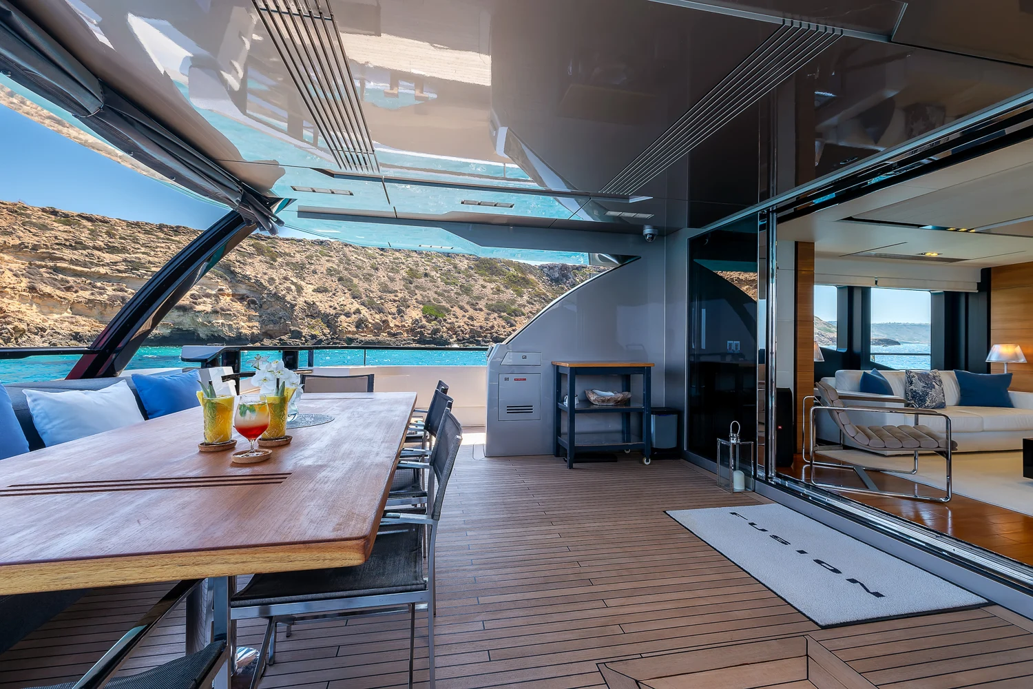 On Fusion, each day unfolds with new possibilities for relaxation and enjoyment. Begin your mornings on the sun-drenched decks, where sunpads invite you to bask in the warmth of the day. As the afternoon sun reaches its peak, retreat to the refreshing embrace of the deck jacuzzi, where the soothing bubbles and breathtaking views create an oasis of tranquility. Evenings are a time for social gatherings in the tastefully appointed indoor spaces, where the ambiance is both inviting and sophisticated. Stay connected with seamless Wi-Fi access, or disconnect entirely, as the stabilizers ensure smooth sailing whether you’re at anchor or underway. The climate-controlled interiors provide an ideal retreat after a day of sun and sea.