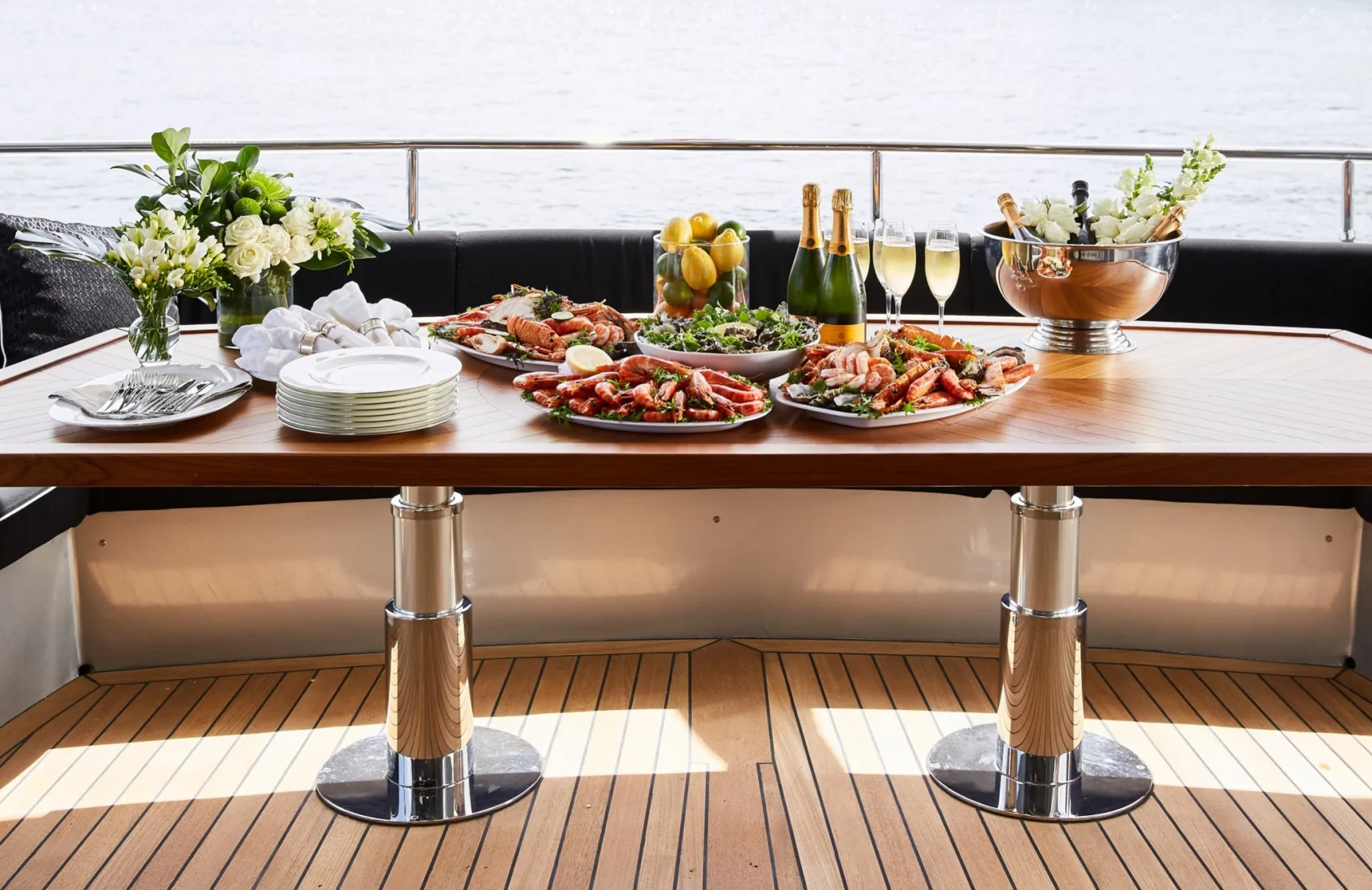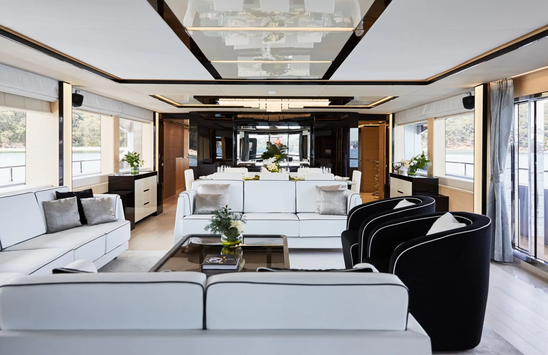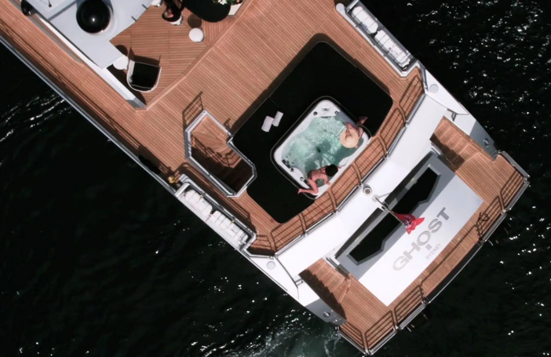 Aboard the ‘Ghost II,’ every detail has been considered to enhance your journey. As the sun sets, unwind in the Jacuzzi with a perfect cocktail in hand, or enjoy a movie night under the stars with the ambient glow of underwater lights. Seamless connectivity with Wi-Fi ensures that you can share your adventures or simply disconnect and indulge in the moment. The onboard air conditioning guarantees a refreshing atmosphere, creating an inviting space to relax after a day of exploration. Whether hosting a gathering or enjoying a quiet evening, the yacht’s social spaces provide the perfect backdrop for any occasion.