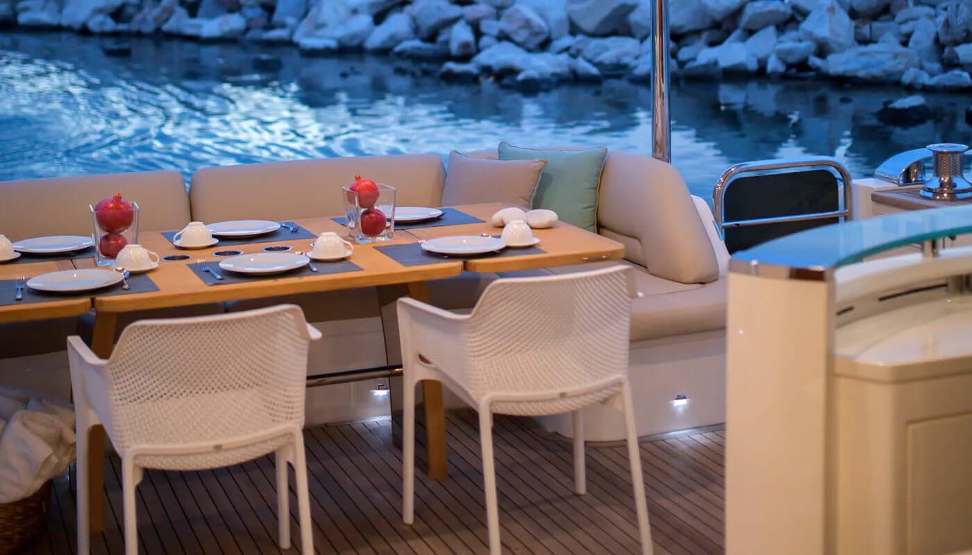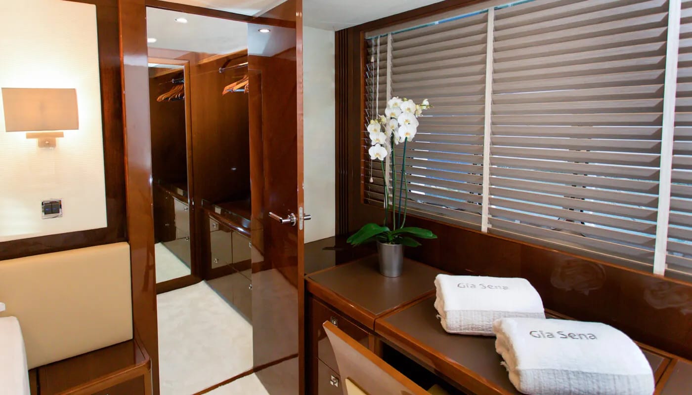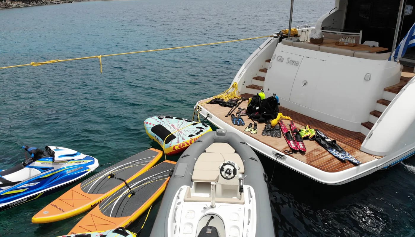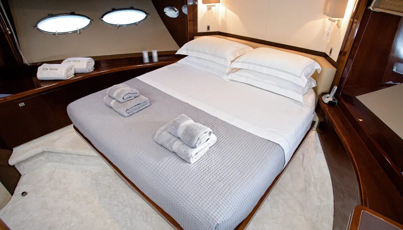 Aboard Gia Sena, each day unfolds like a dream. Her foredeck offers an inviting space with seating and a table, perfect for sunset gatherings or midday relaxation. As the sun sets, retreat to the elegant salon, where air conditioning ensures comfort while you enjoy a film or lively conversation. The expansive swim platform offers a gateway to the sea, inviting spontaneous dips into the crystal-clear waters or lounging with a good book as the gentle waves lap the hull.