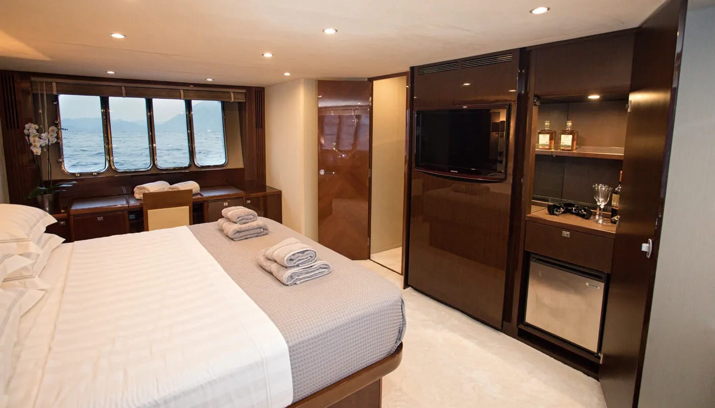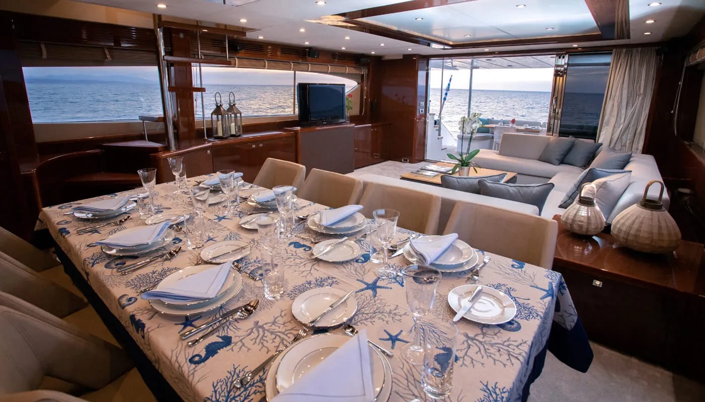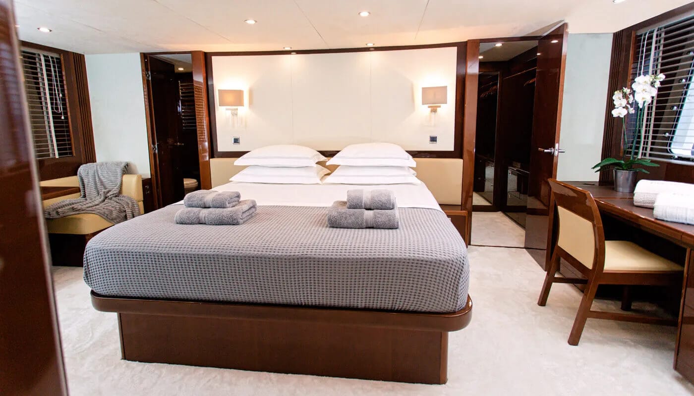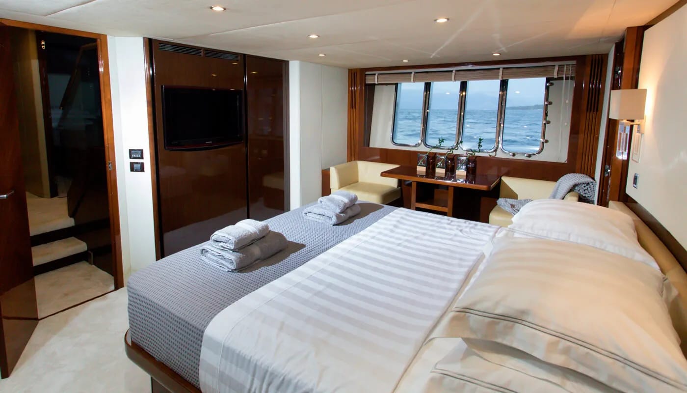 Aboard Gia Sena, each day unfolds like a dream. Her foredeck offers an inviting space with seating and a table, perfect for sunset gatherings or midday relaxation. As the sun sets, retreat to the elegant salon, where air conditioning ensures comfort while you enjoy a film or lively conversation. The expansive swim platform offers a gateway to the sea, inviting spontaneous dips into the crystal-clear waters or lounging with a good book as the gentle waves lap the hull.