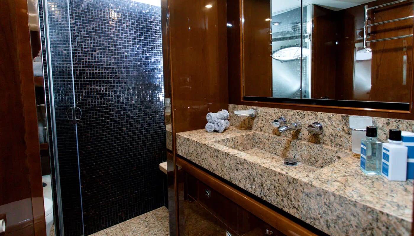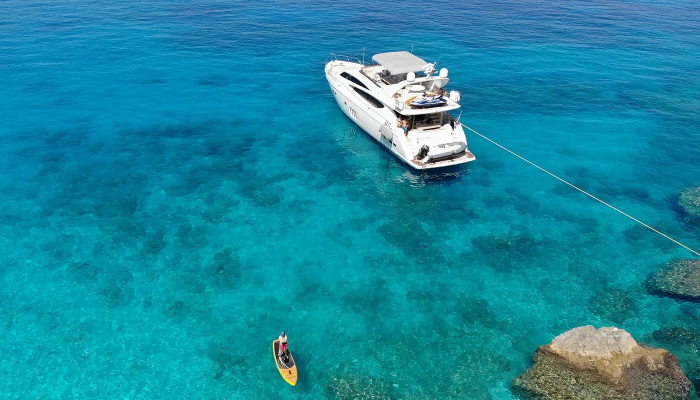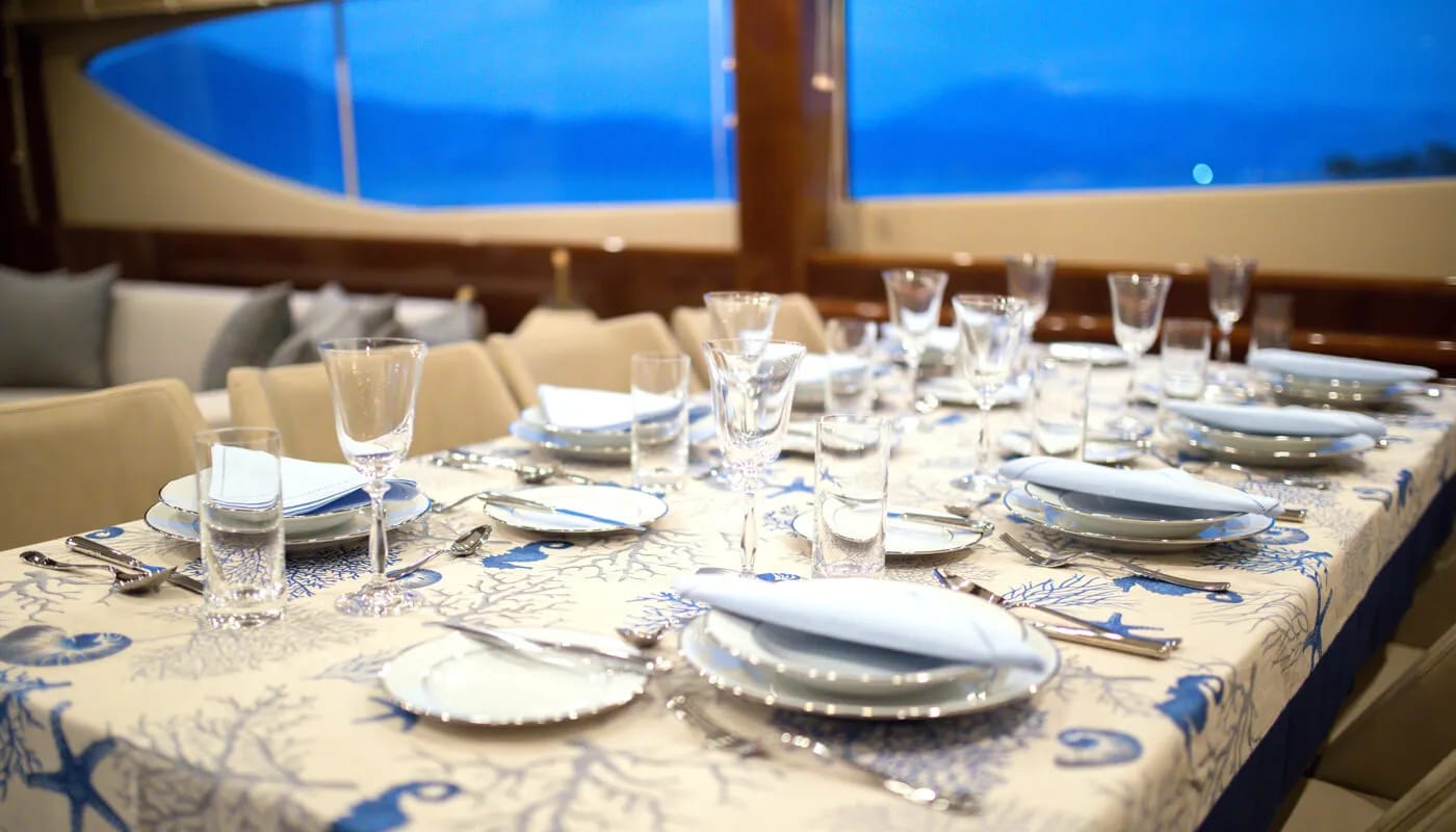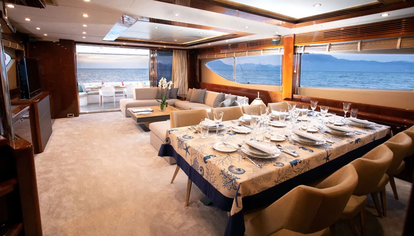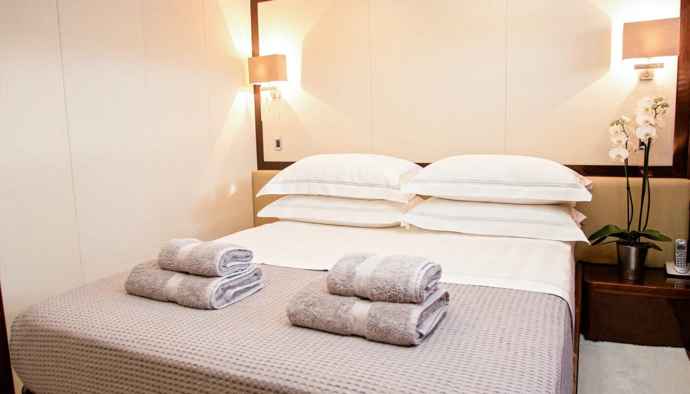 Aboard Gia Sena, each day unfolds like a dream. Her foredeck offers an inviting space with seating and a table, perfect for sunset gatherings or midday relaxation. As the sun sets, retreat to the elegant salon, where air conditioning ensures comfort while you enjoy a film or lively conversation. The expansive swim platform offers a gateway to the sea, inviting spontaneous dips into the crystal-clear waters or lounging with a good book as the gentle waves lap the hull.