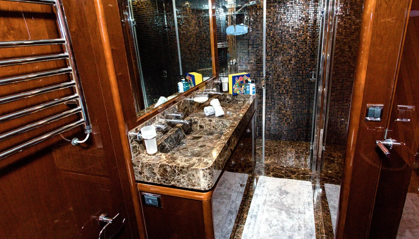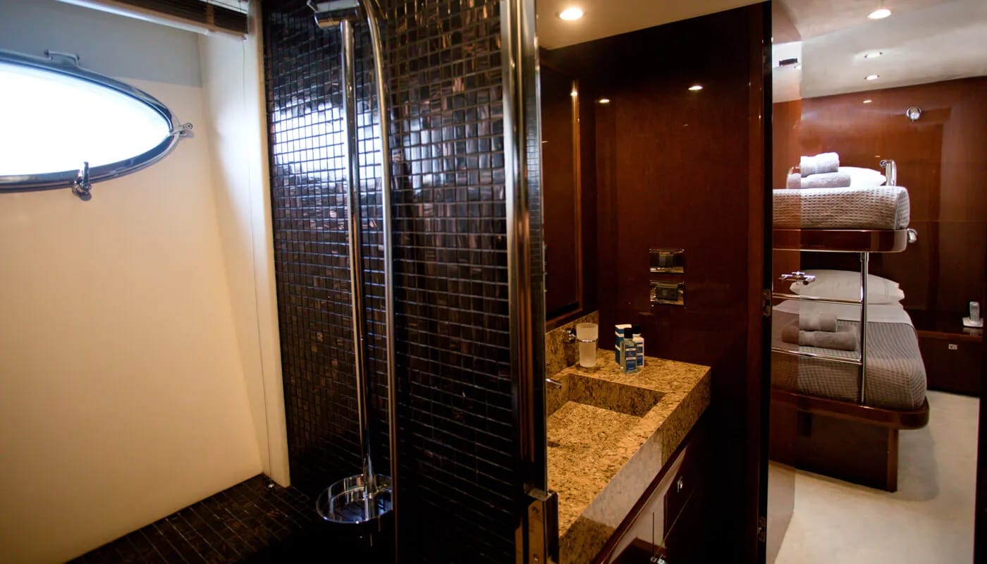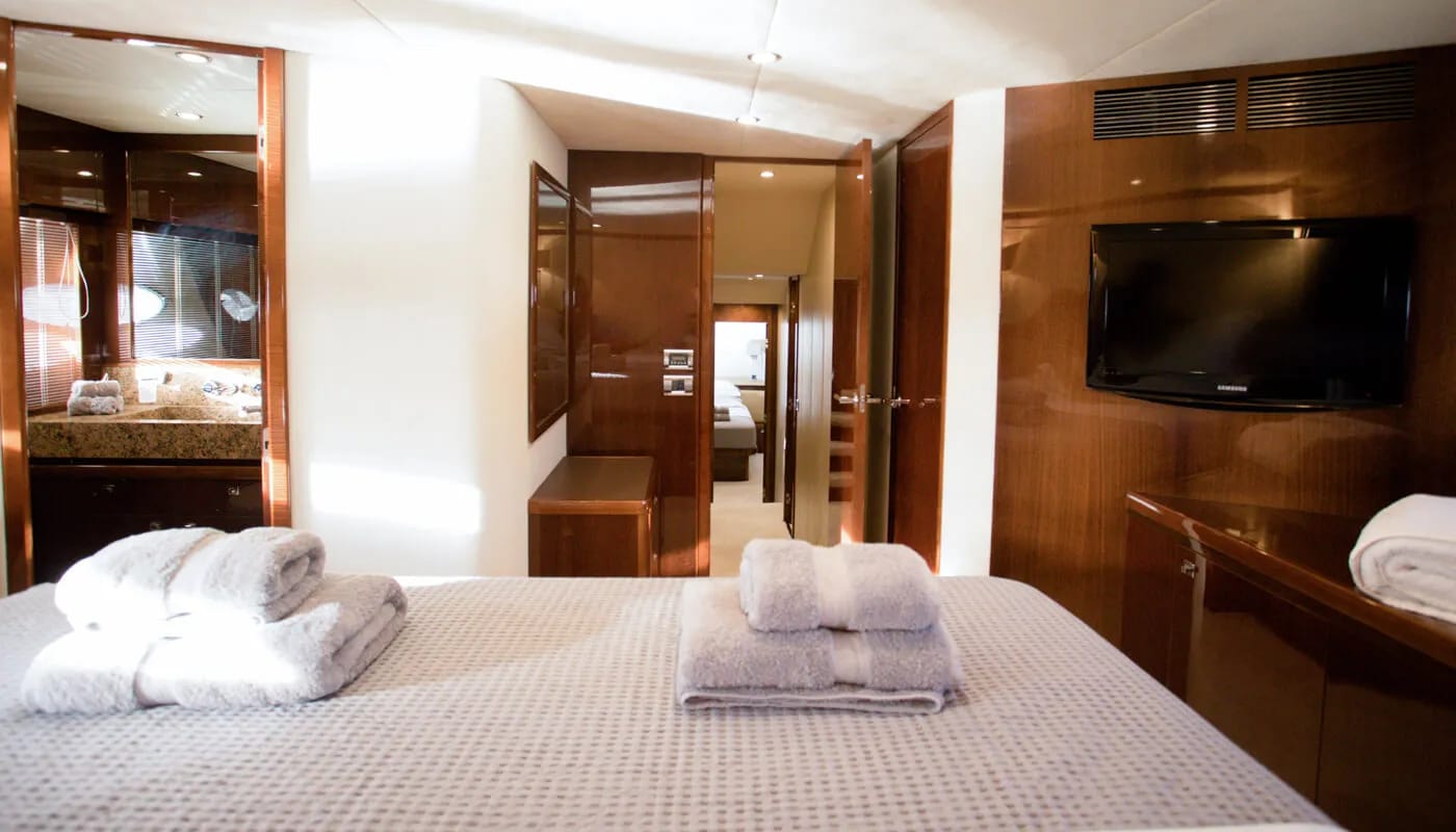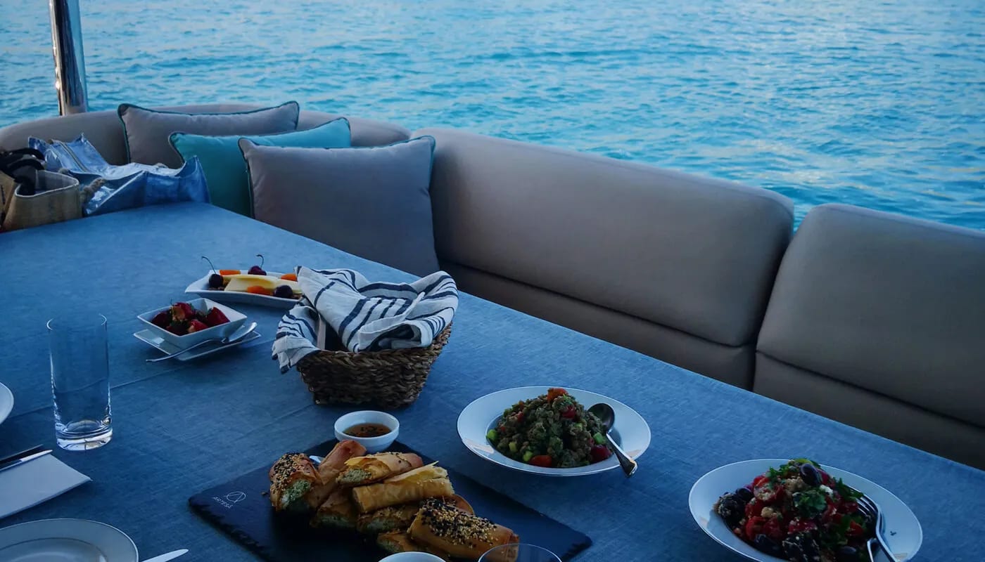 Aboard Gia Sena, each day unfolds like a dream. Her foredeck offers an inviting space with seating and a table, perfect for sunset gatherings or midday relaxation. As the sun sets, retreat to the elegant salon, where air conditioning ensures comfort while you enjoy a film or lively conversation. The expansive swim platform offers a gateway to the sea, inviting spontaneous dips into the crystal-clear waters or lounging with a good book as the gentle waves lap the hull.