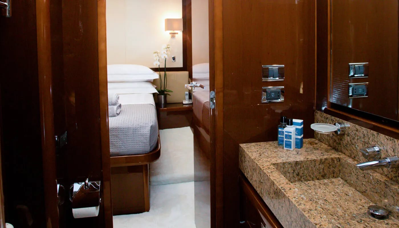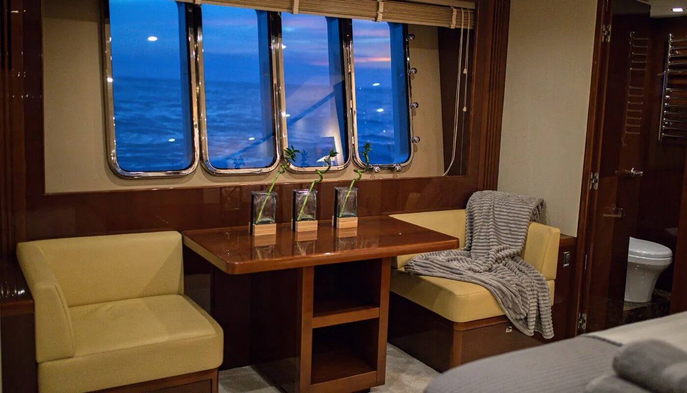 Gia Sena accommodates up to eight guests in four beautifully appointed cabins, each a sanctuary of tranquility. The master suite promises a restful night with its plush king-size bed, while the VIP cabin offers an equally inviting queen-size retreat. A double cabin and a twin cabin, each thoughtfully designed, ensure every guest enjoys serene slumbers and the gentle lull of the ocean. As dawn breaks, the promise of another exquisite day on the water awaits.