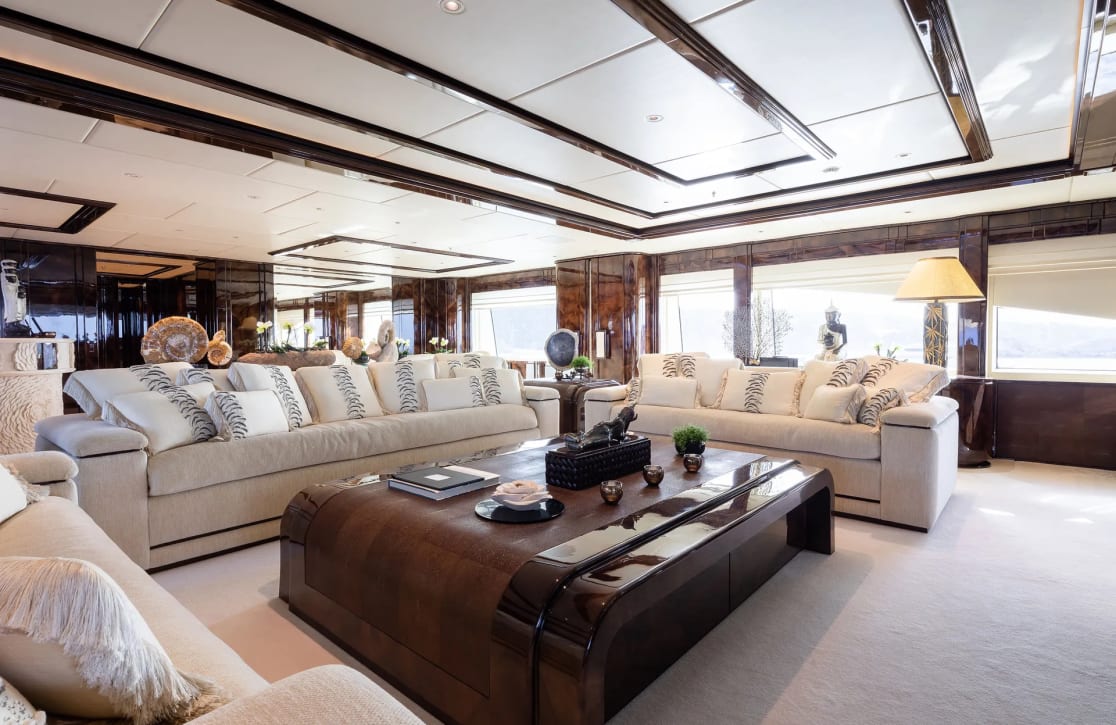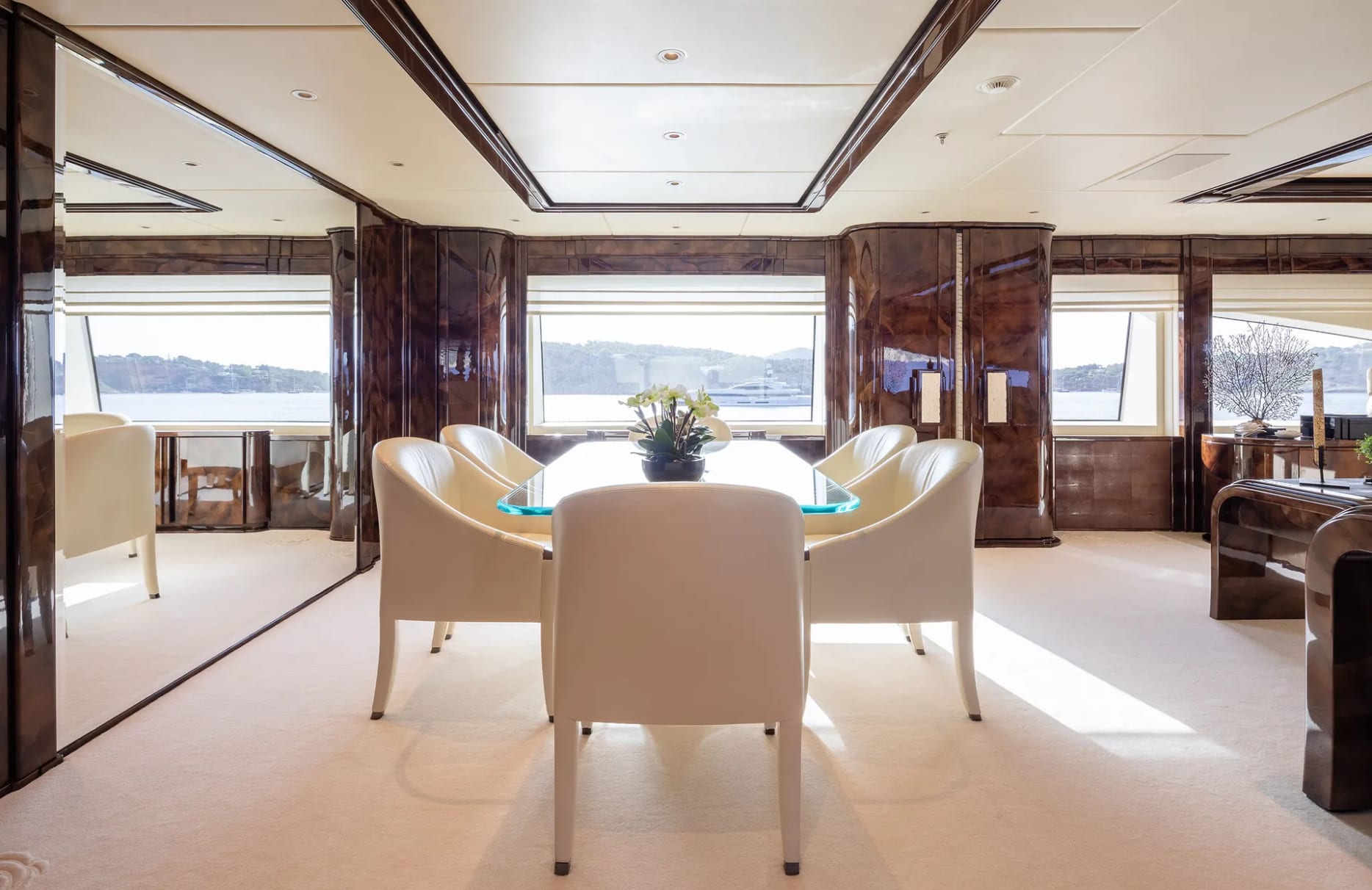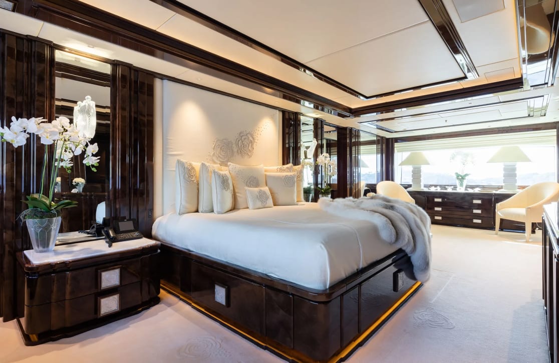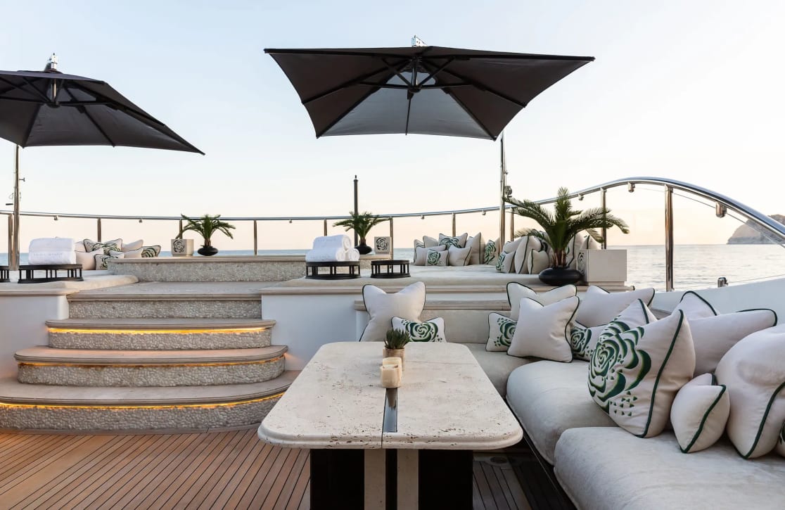 Awaken each morning to the gentle sway of the sea in Illusion V’s sumptuous accommodations. Hosting up to 12 guests across six exquisitely appointed cabins, the yacht ensures comfort and privacy. The full-beam master suite exudes sophistication, featuring a dressing room and a luxurious his-and-her bathroom. Each space, from the inviting VIP cabin to the elegantly designed twin cabins, offers a restful refuge, where the soft whispers of the ocean lull you into serene slumber.