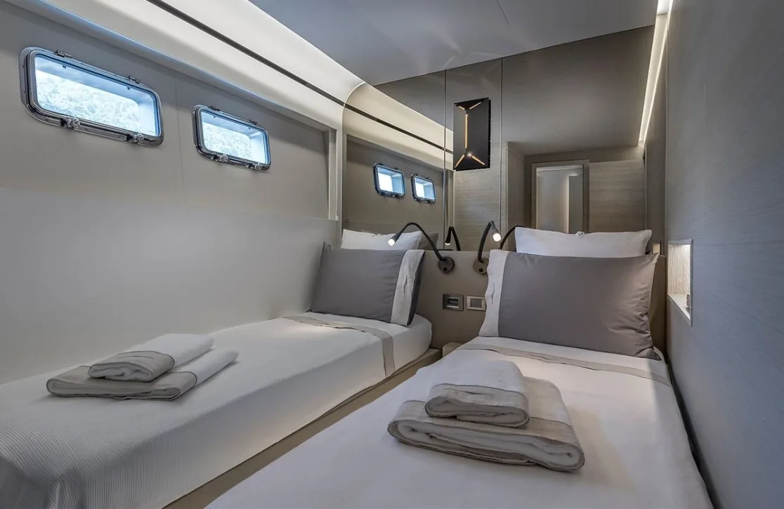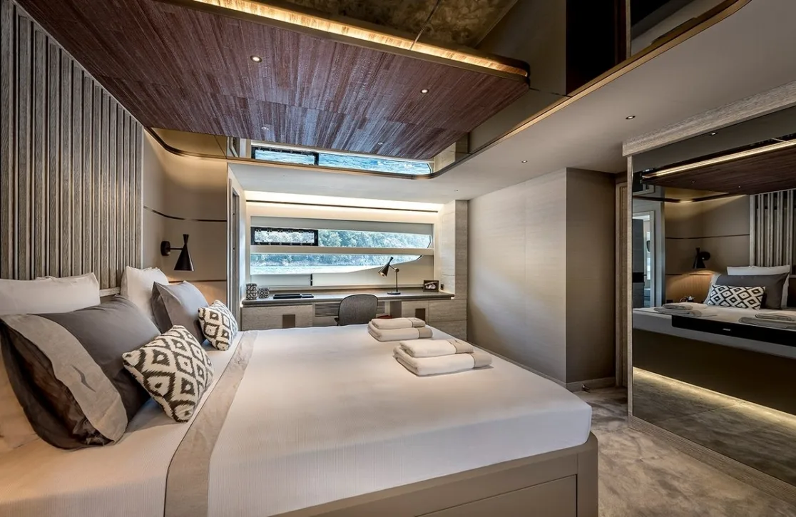 Kamoka accommodates up to eight guests across four exquisitely designed cabins where each space is a retreat unto itself. The full-beam master suite is a haven of privacy, complete with its own study and dressing room, ensuring your every need is anticipated. The gentle lull of the ocean provides a soothing soundtrack as you awaken in these sanctuaries, ready to embrace another day of exploration. Each cabin is a testament to modern elegance, offering a restful atmosphere that enhances the tranquility of life aboard.