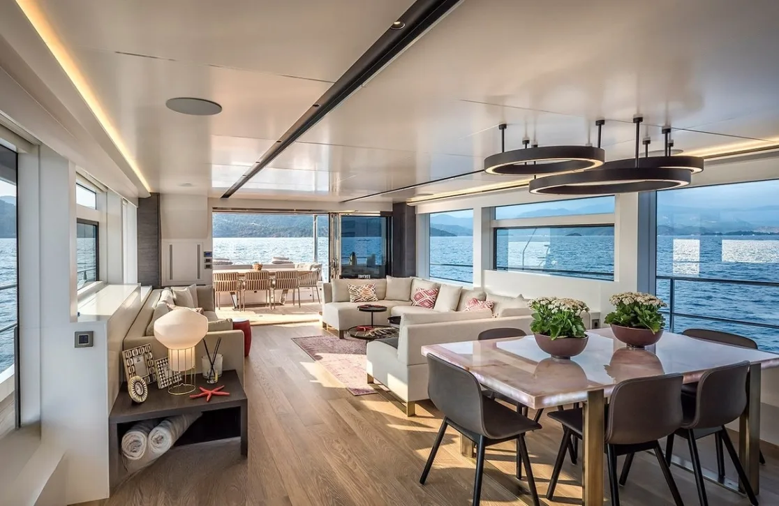 Aboard Kamoka, every day is imbued with possibilities. Begin your mornings with a workout using the gym equipment on the sun deck, where panoramic views inspire your routine. As the day unfolds, find solace in the shaded lounges, or indulge in moments of serenity at the swimming platform, where the sea beckons invitingly. The state-of-the-art air conditioning ensures a refreshing ambiance regardless of the sun’s intensity, while high-speed Wi-Fi keeps you connected as you wish. Evenings transform into enchanting affairs on the sunpads, where the sky’s changing hues paint a perfect backdrop for conversation or contemplation.