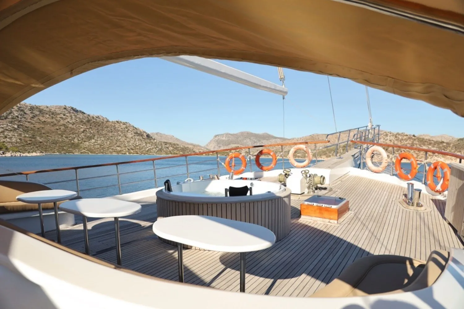 Onboard the Kocaoglan 1, each moment is crafted for your pleasure and relaxation. Bask in the sun on plush sunpads or unwind in the deck jacuzzi, drink in hand, as you soak up the panoramic views. High-speed Wi-Fi keeps you connected to the world beyond, while the cool, air-conditioned interiors offer a serene retreat from the heat of the day. Whether you’re savoring a quiet morning coffee or an evening under the stars, the yacht’s spaces invite you to create memories that linger.