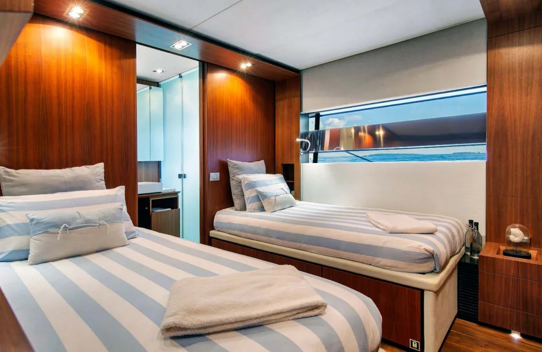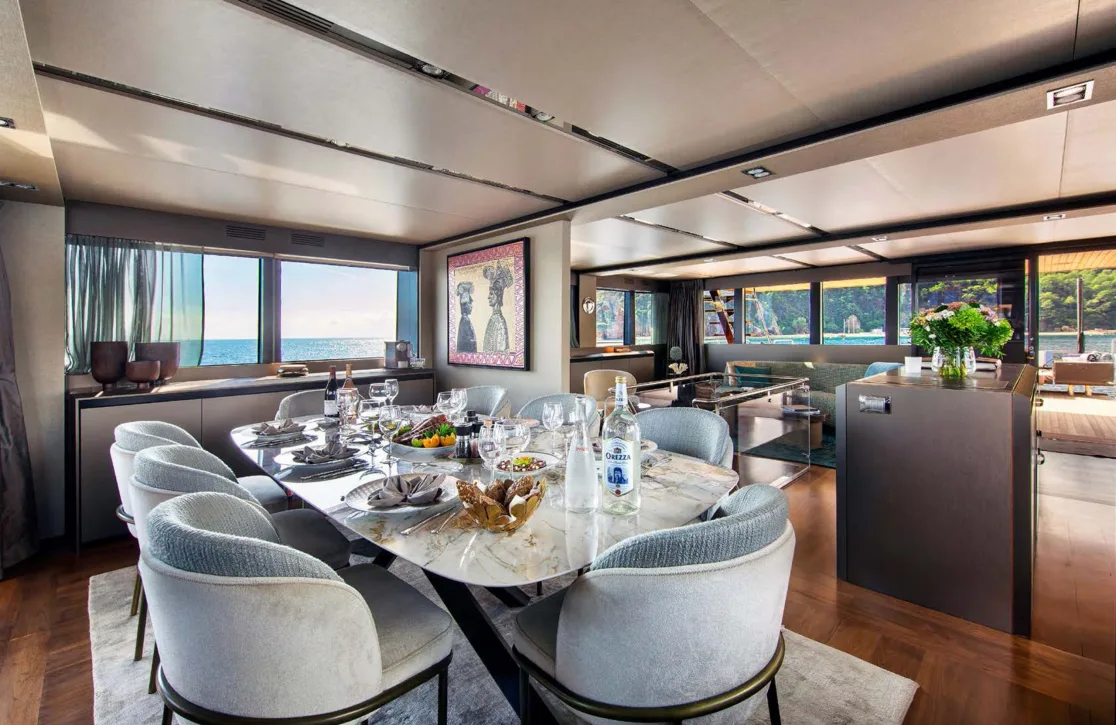 Kokonut’s Wally welcomes up to 10 guests into her elegantly designed quarters, where each of the four cabins is a sanctuary of rest and rejuvenation. Drift into slumber in the master suite or the VIP cabin, each offering sumptuous bedding that promises serene nights at sea. Two twin cabins provide flexibility for families and friends, with additional pullman berths ensuring comfort for all. As dawn breaks, awaken to the gentle lapping of waves and the soft glow of morning light filtering through your window, a prelude to another day of discovery and delight.