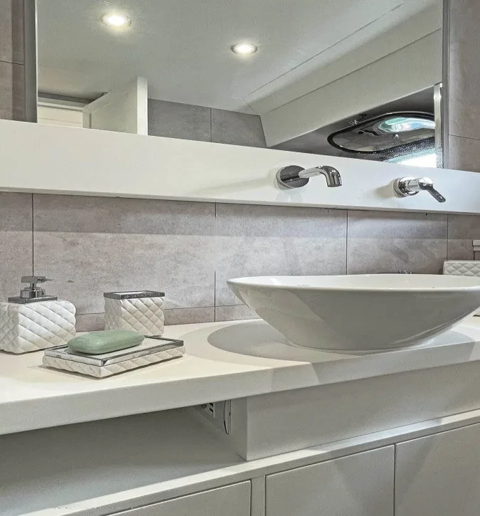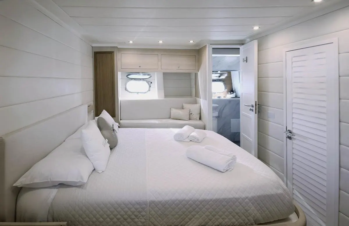 La Chicca graciously accommodates up to eight guests in four well-appointed cabins, each offering a serene haven after a day of exploration. The master suite provides a sanctuary of privacy and comfort, while the VIP and double cabins ensure guests awake refreshed to the gentle sound of the sea. The twin cabin offers versatility for families or friends traveling together. Each room is a blend of comfort and style, ensuring that every morning begins with the soft light of the sun filtering through your window, inviting you to another day of adventure.