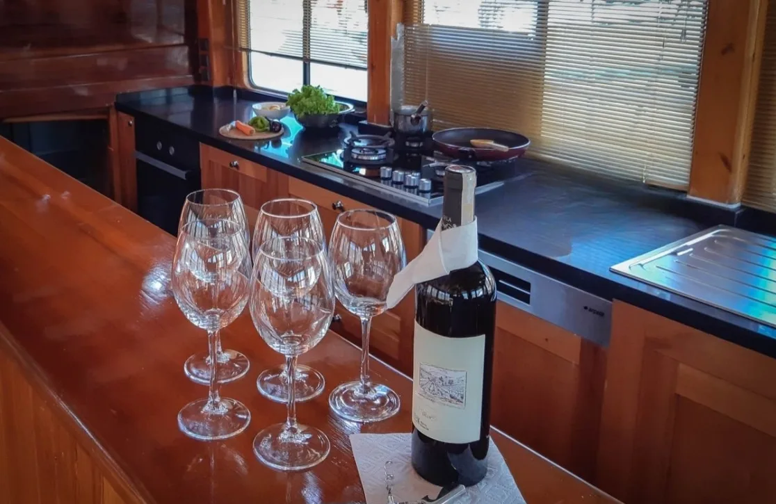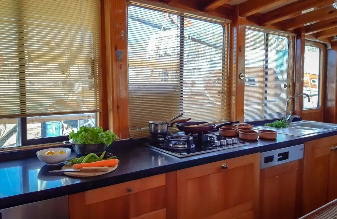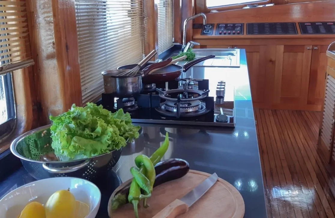 La Reine offers an inviting retreat with its six well-appointed cabins, including a master suite, a VIP cabin, and four twin cabins. With space for up to 12 guests, each cabin is a sanctuary of comfort, where you can wake up to the gentle lapping of the sea against the hull. The layout provides both privacy and communal areas, allowing guests to choose their level of interaction and solitude as the mood takes them. Every morning aboard feels like the start of a new adventure, with the promise of the day’s explorations ahead.