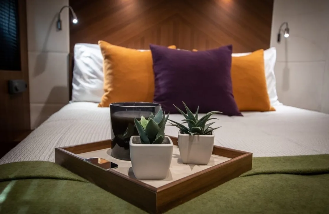 With accommodations for up to eight guests across four beautifully appointed cabins, Lady Isabella provides a sanctuary of tranquility. The master suite offers a haven of privacy, while the VIP, double, and twin cabins ensure every guest enjoys a restful retreat. Wake up to the gentle sway of the yacht, as sunlight filters through your window, casting a warm glow over the elegant interiors. Each cabin blends comfort with refined elegance, offering the perfect setting for relaxation after a day of adventure.
