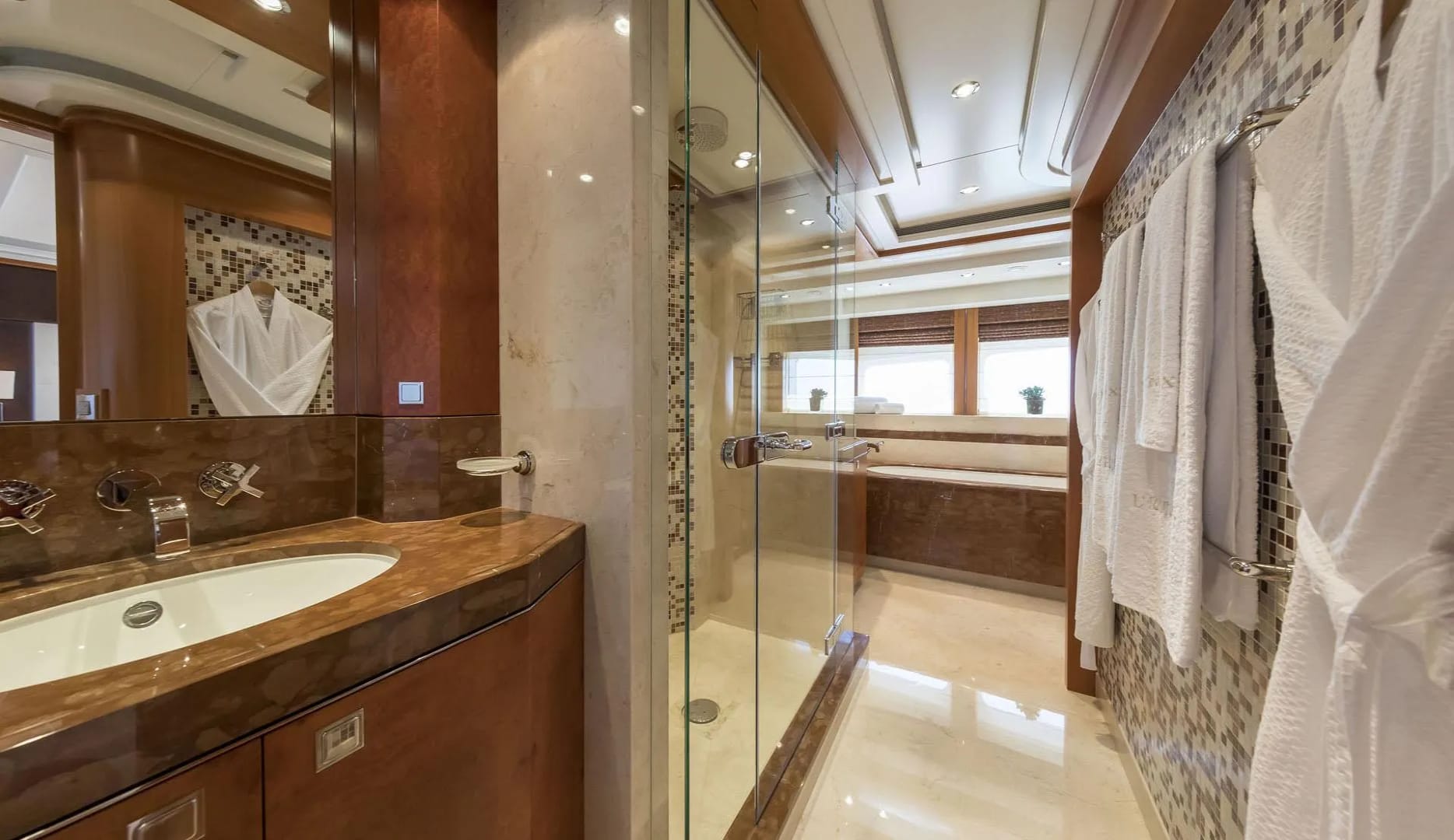 L’Equinox invites up to 12 guests into a realm of comfort and elegance, with five exquisitely appointed cabins. Awaken to the gentle sway of the sea in the master suite, where a king bed promises restful nights. Three sumptuous VIP cabins and a twin cabin, thoughtfully designed, cater to every preference. Each space is a private sanctuary, offering a harmonious blend of style and luxury. As the sun casts its golden light through your window, mornings aboard promise a serene start to days filled with discovery and relaxation.