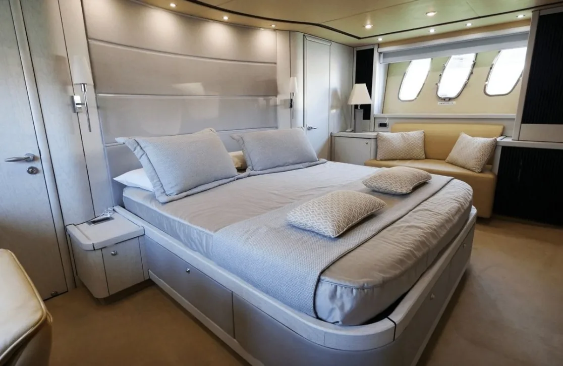 Light Blue offers a sanctuary for up to eight guests across four beautifully appointed cabins. The master suite, VIP cabin, and two twin cabins provide a restful haven where the gentle sway of the sea lulls guests into a peaceful slumber. Each room is a blend of elegance and comfort, ensuring that waking up aboard is as delightful as the adventures that await. With thoughtful details and a meticulous design, the accommodations provide an intimate retreat after a day of exploration.