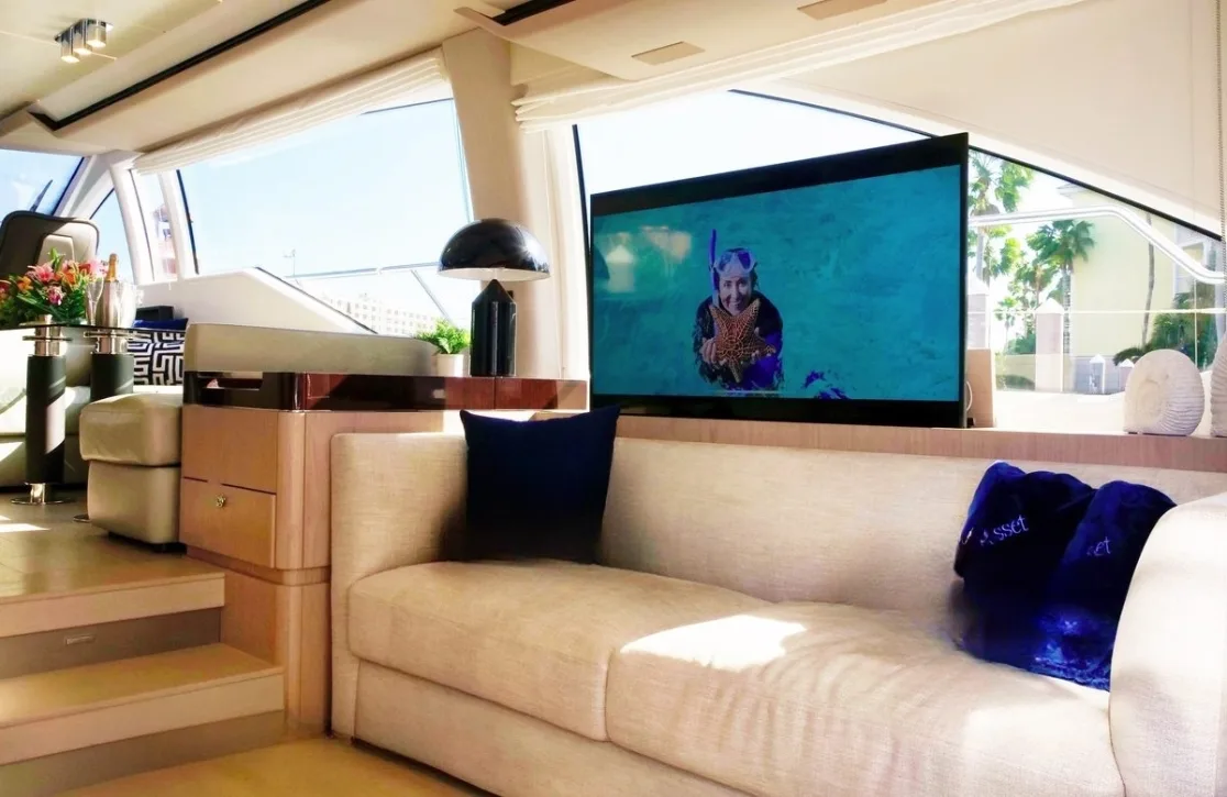 Aboard Liquid Asset, you will find spaces designed to enhance your voyage with comfort and style. The yacht’s air-conditioned interiors provide a haven from the midday sun, while expansive sunpads invite you to bask in the warmth of the day. High-speed Wi-Fi keeps you connected to the world at your leisure, allowing you to share your journey or simply unwind with a favorite pastime. As the sun sets, the spacious deck transforms into a perfect setting for intimate gatherings or quiet reflection under a starlit sky.