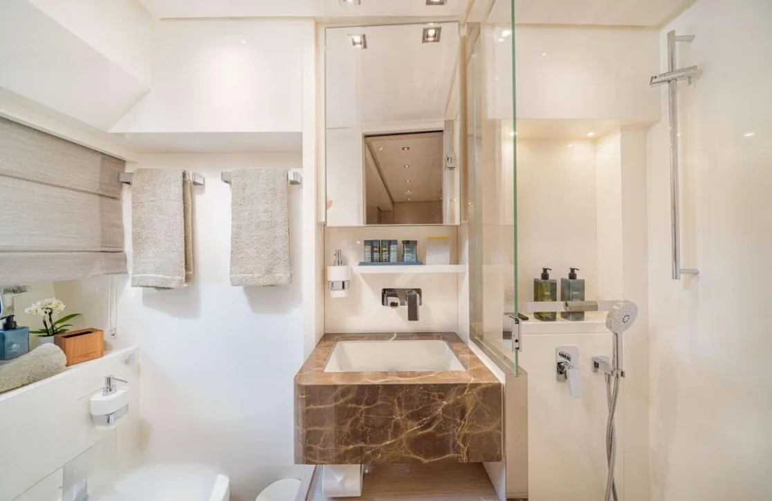 Lucky graciously accommodates up to eight guests across four well-appointed cabins, including a master suite, a VIP stateroom, and two twin cabins. Each room is a haven of relaxation, where the gentle lapping of the waves serves as a soothing lullaby. Waking up aboard is a delight, with sunlight spilling through expansive windows, promising another day of discovery. The thoughtful design of each space ensures privacy and comfort, offering a retreat after a day of exploration and indulgence.