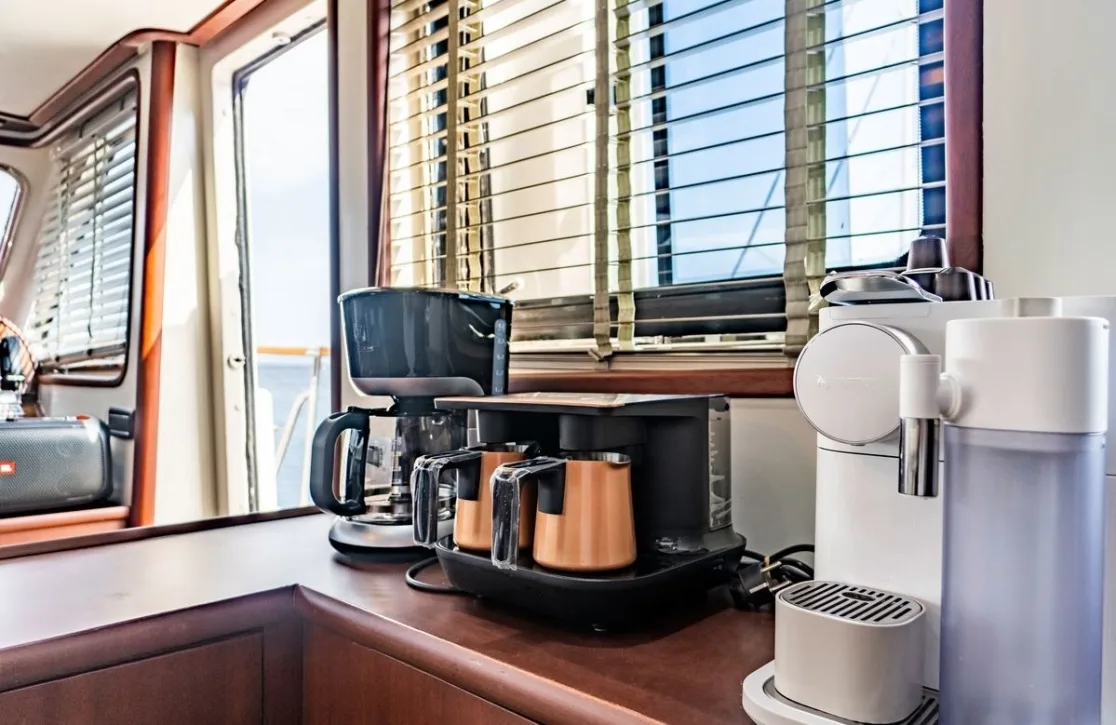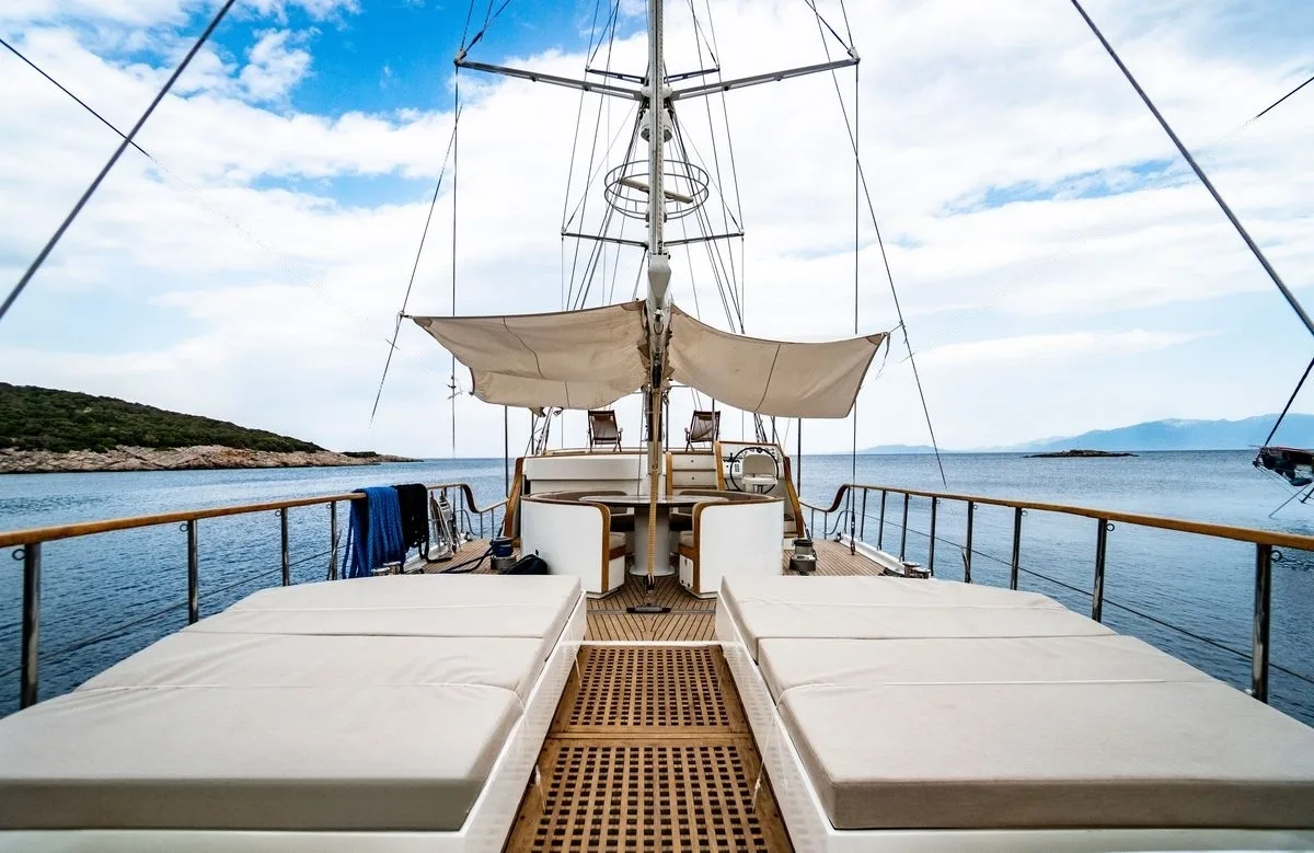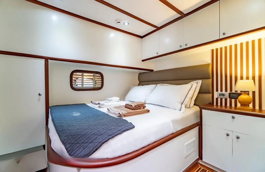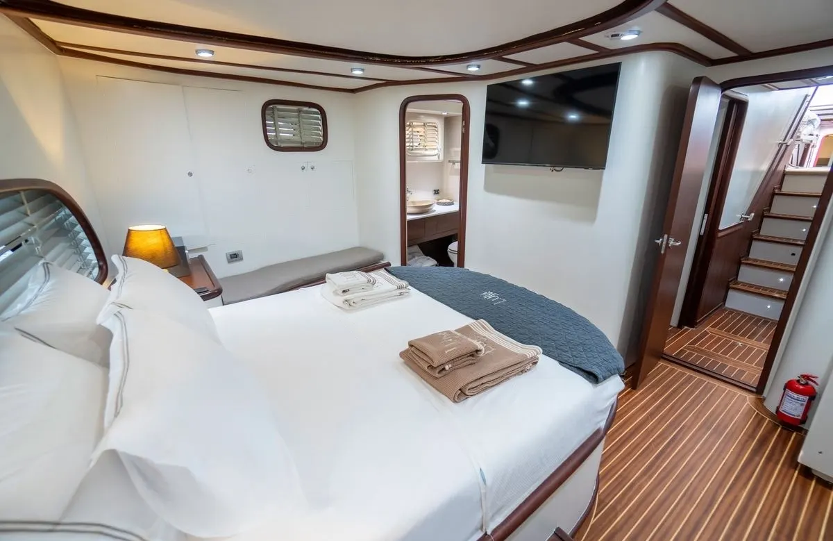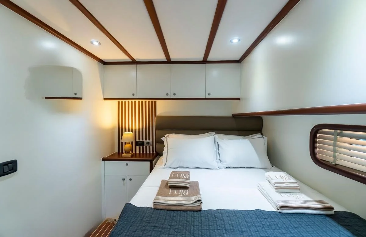 Life aboard Luja is one of serene indulgence, where each detail is crafted for your utmost comfort and delight. Feel the gentle breeze on the sun-drenched deck as you recline on plush sunpads, or retreat to the cool comfort of the air-conditioned interior spaces. Stay connected with the world, if you choose, through the yacht’s integrated Wi-Fi, or disconnect entirely to immerse yourself in the rhythmic lull of the ocean. The swimming platform offers the perfect gateway for a refreshing dip in azure waters, ensuring that leisure is always within arm’s reach.