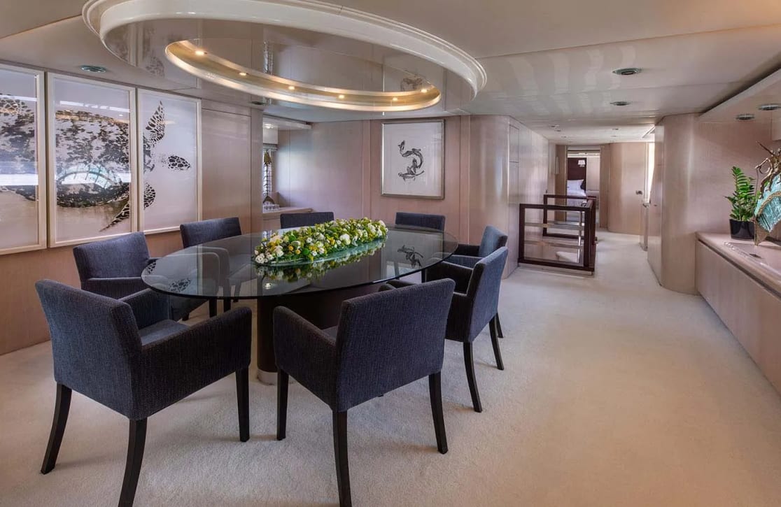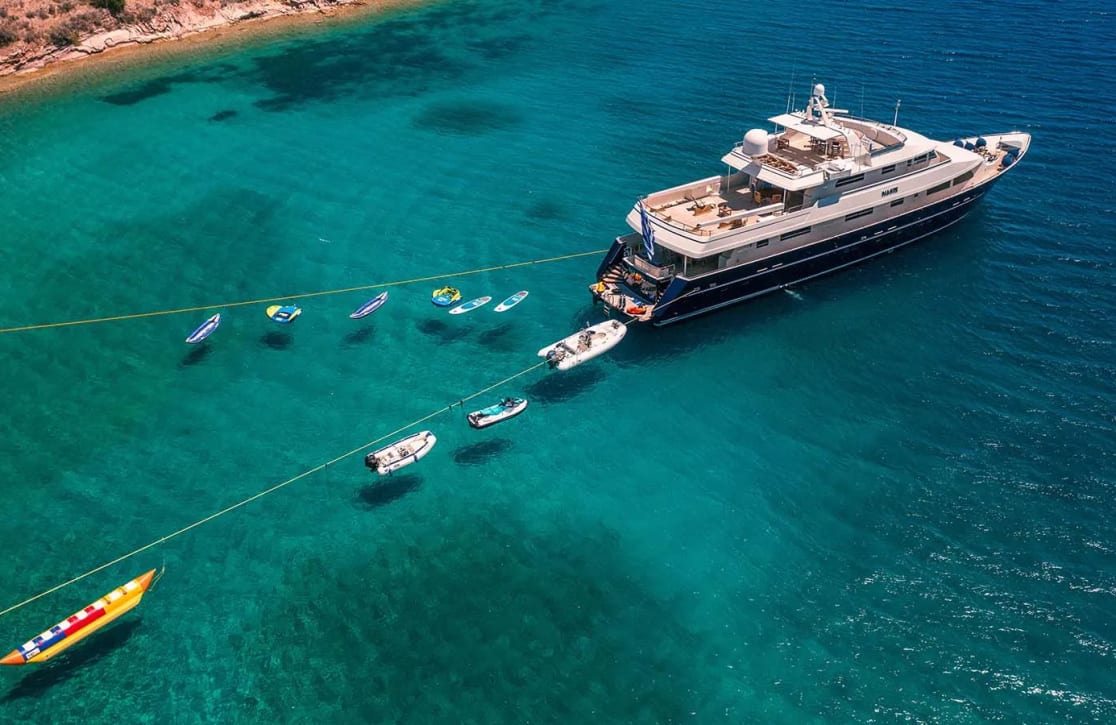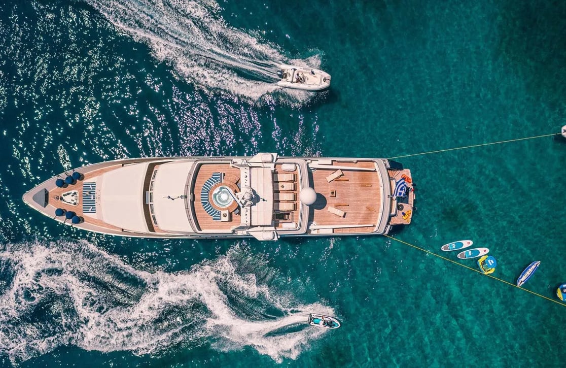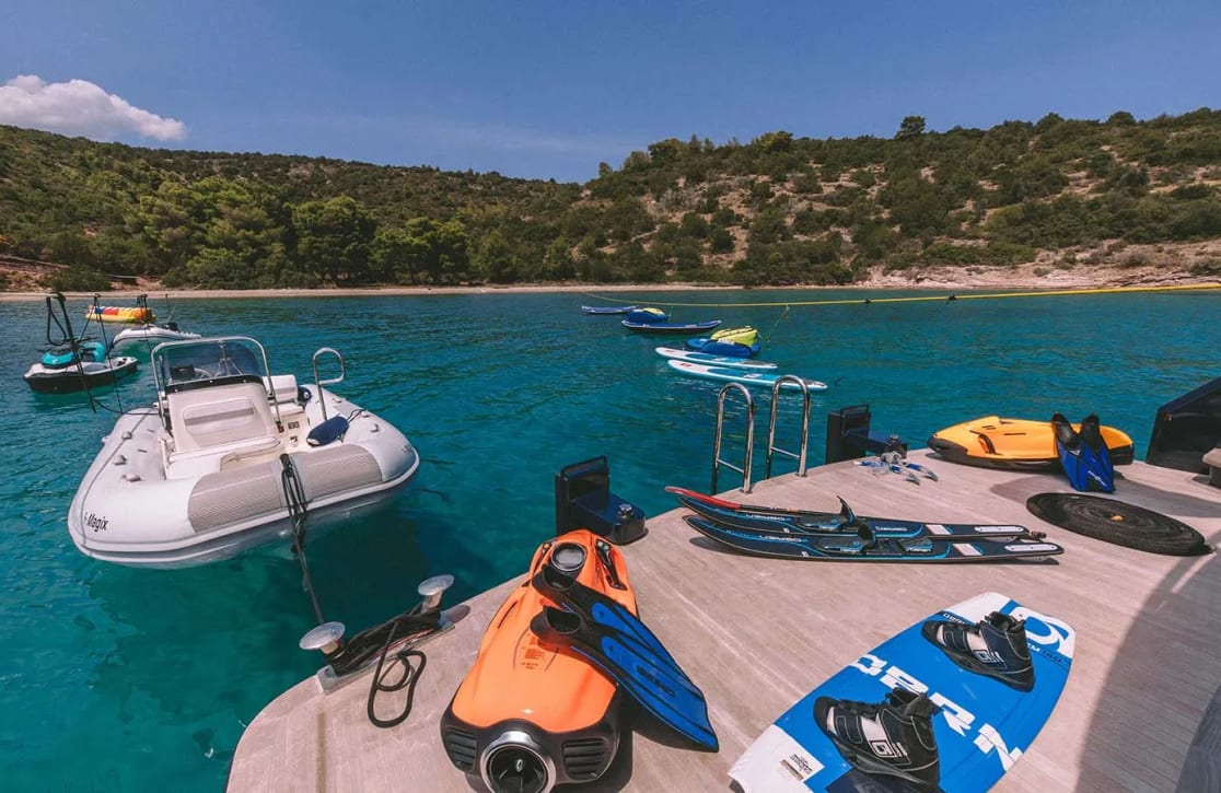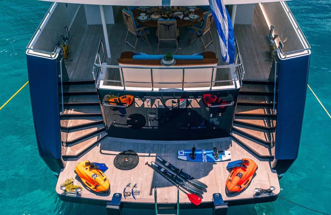 Aboard Magix, each day unfolds with possibility. Picture yourself spending sun-soaked afternoons lounging in the deck jacuzzi, where panoramic vistas stretch as far as the eye can see. As evening descends, the yacht transforms into a haven of tranquility, offering intimate spaces for gathering with family or friends, or simply enjoying a reflective moment under the stars. With a dedicated crew of seven attending to every detail, the experience aboard Magix is as seamless as it is enchanting, ensuring your journey is not just a vacation, but an unforgettable escape.