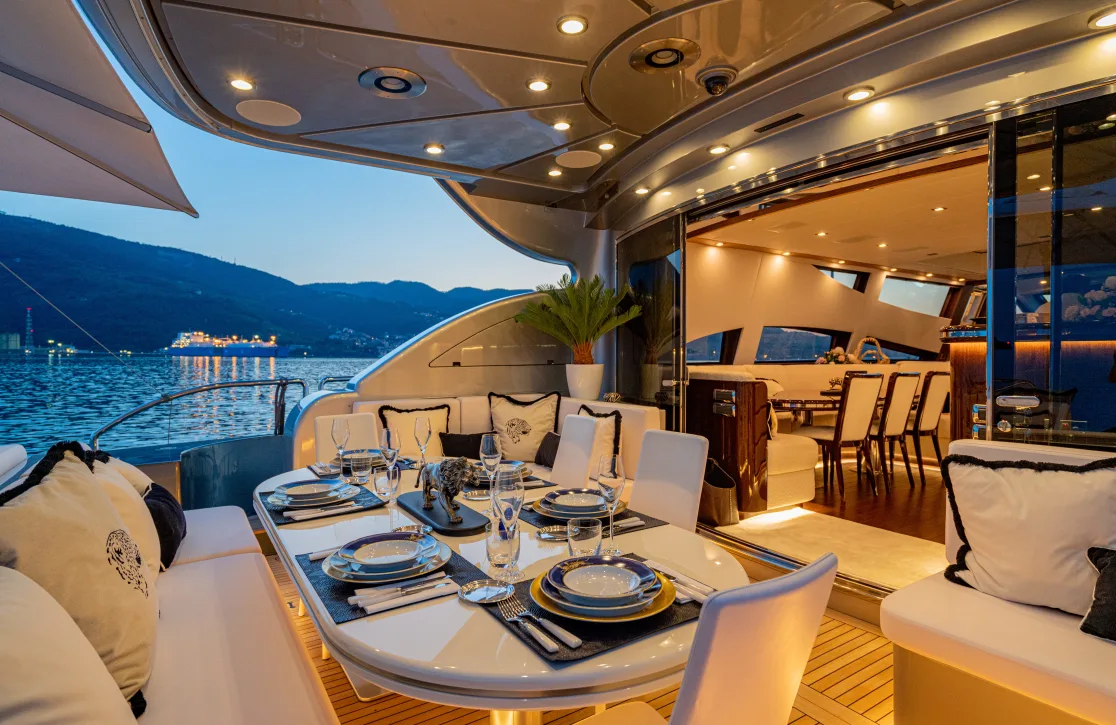 Aboard the Manu V, every detail is crafted to enhance your journey. Sun-drenched afternoons can be spent reclining on plush sunpads, where the gentle sea breeze and warm rays create a perfect sanctuary for relaxation. As evening descends, the yacht transforms into a haven of entertainment and comfort, with seamless Wi-Fi connectivity allowing you to share your adventures with the world or simply stream your favorite tunes under the stars. The advanced air conditioning system ensures that the climate within remains perfect, no matter what the weather brings outside. Meanwhile, the swimming platform offers easy access to the water, inviting you for a refreshing dip or to launch your next aquatic adventure.