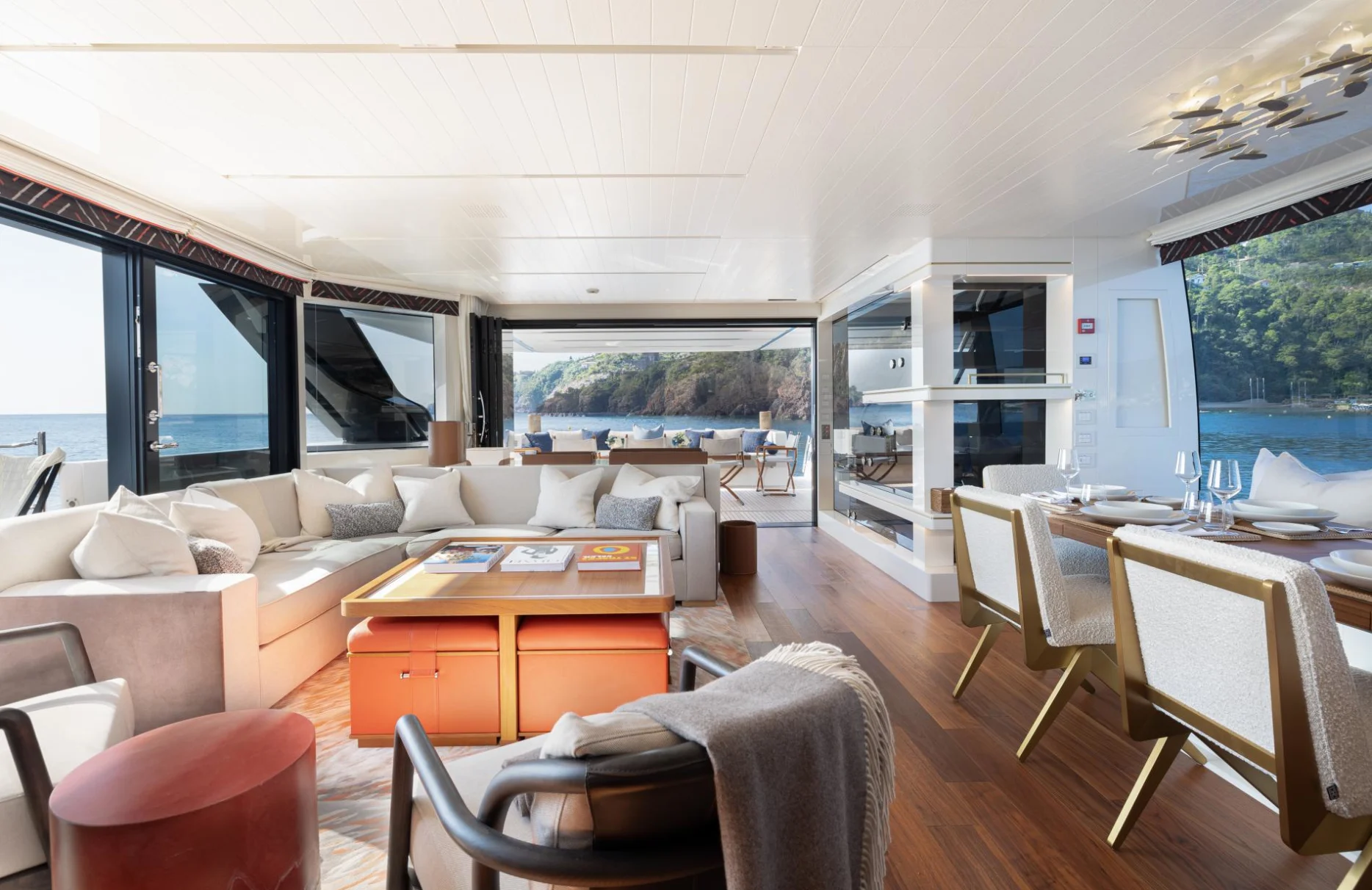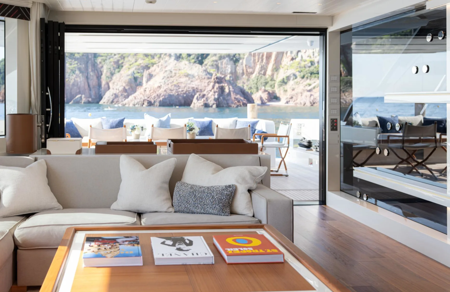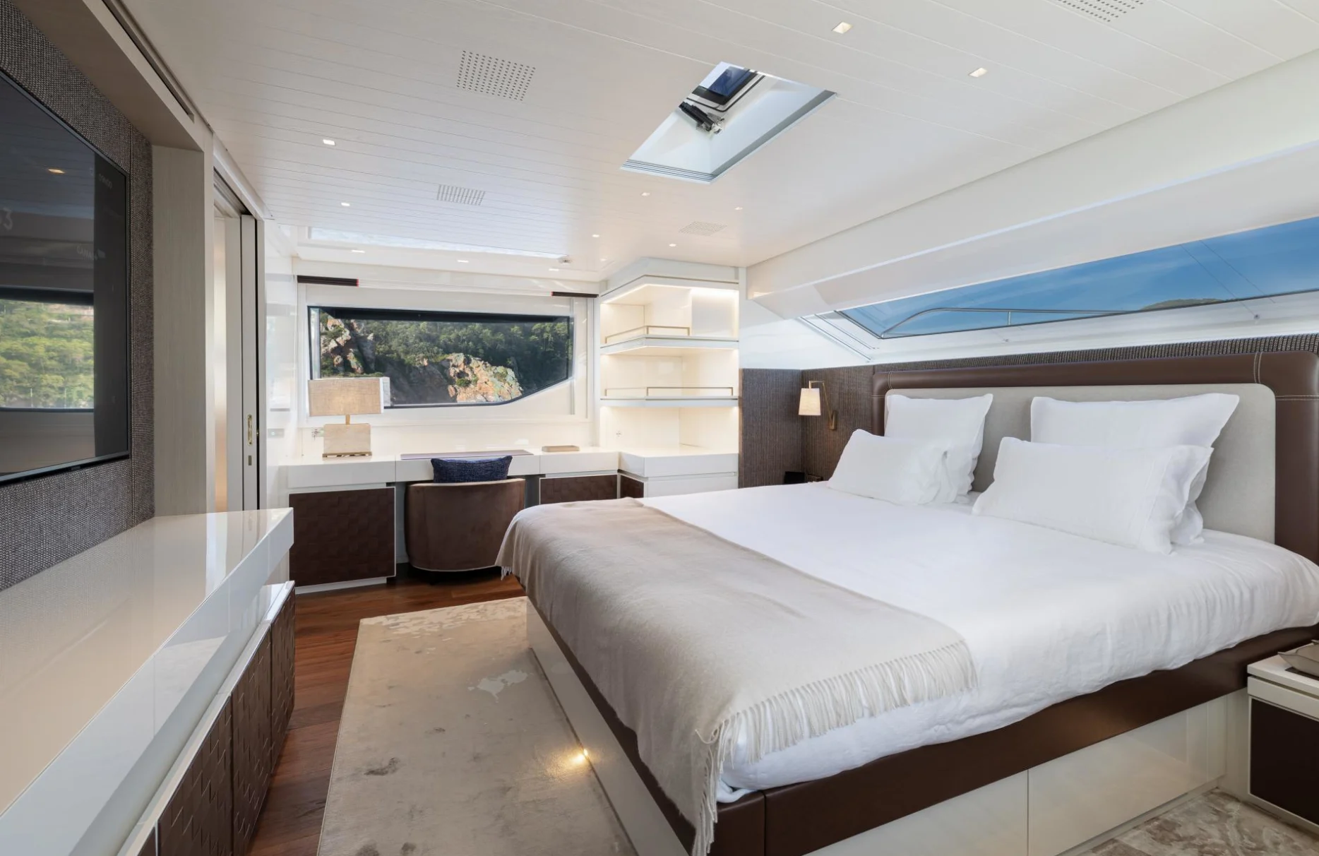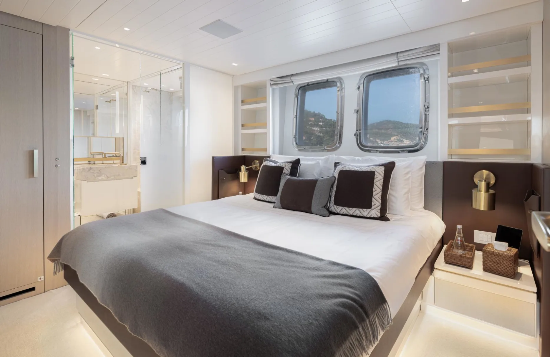 Accommodating up to ten guests, Monte-Cristo provides a sanctuary of privacy and comfort with its five elegantly appointed cabins. The full-beam master suite, complete with a spacious dressing room, offers a serene retreat. Two VIP cabins, along with a double and a single cabin, ensure every guest enjoys a restful night’s sleep, waking up refreshed to the gentle sway of the sea. Each room is a testament to sophisticated design and meticulous attention to detail, inviting you to unwind in style.