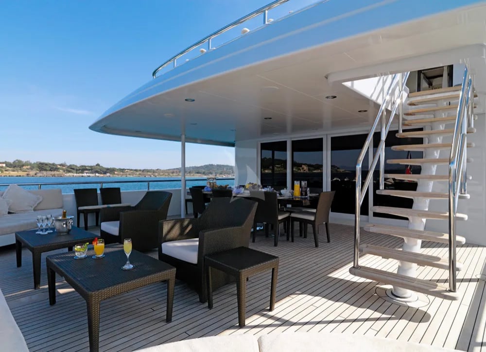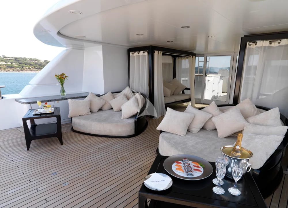 Life aboard My Little Violet is a symphony of comfort and style. Begin your morning with a refreshing dip in the deck jacuzzi, surrounded by panoramic views of the sea. Inside, the climate-controlled interiors offer a seamless escape from the midday sun, while high-speed Wi-Fi keeps you connected to the world at your leisure. As evening falls, gather with friends and family in the elegant salon, where conversation flows as effortlessly as the fine wines served. The yacht’s advanced stabilization system ensures that every moment, whether anchored or underway, is one of pure tranquility.