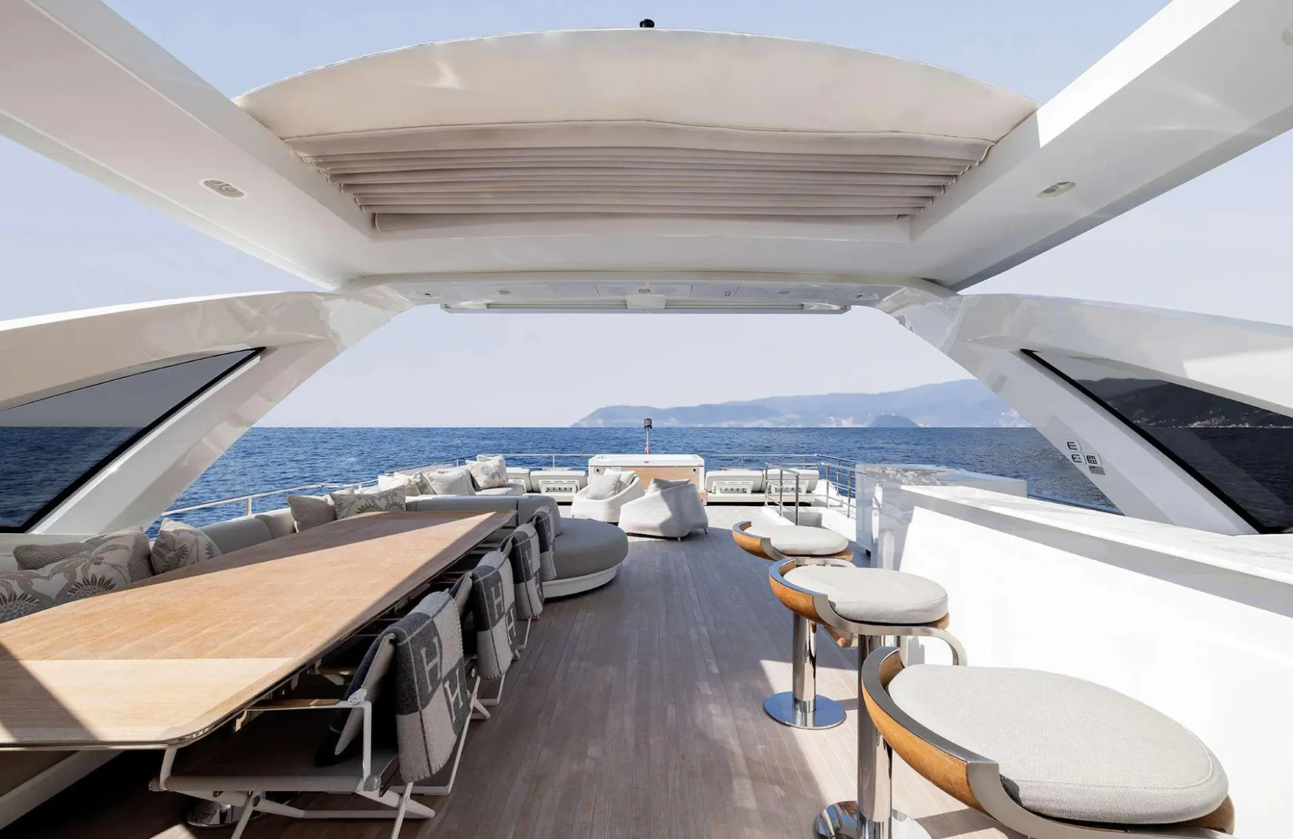 Imagine a week aboard the distinguished Nemesis, a 32-meter masterpiece from Azimut, designed by the creative minds at Salvagni Architetti. Built in 2021, Nemesis is an invitation to explore both the open seas and hidden gems ashore with grace and style. Her sleek profile, enhanced by a GRP hull and carbon fiber superstructure, allows her to glide effortlessly at a cruising speed of 21 knots, promising smooth transitions between breathtaking locales. With a range of up to 1,000 nautical miles, your adventures know no bounds, whether you seek the serene beauty of secluded coves or the vibrant allure of bustling harbors.