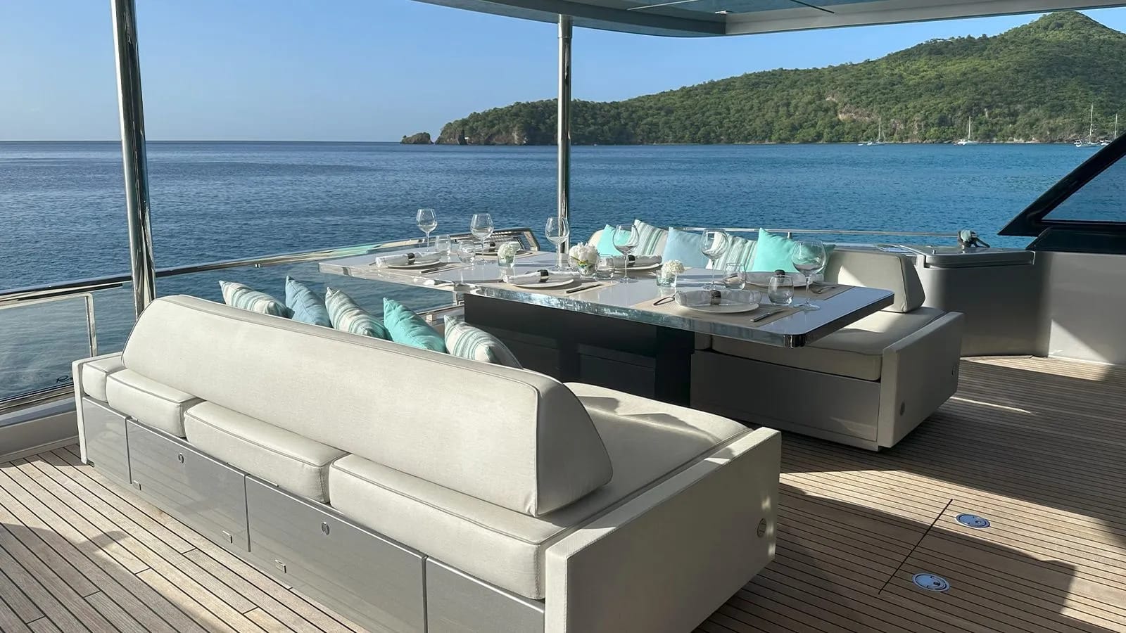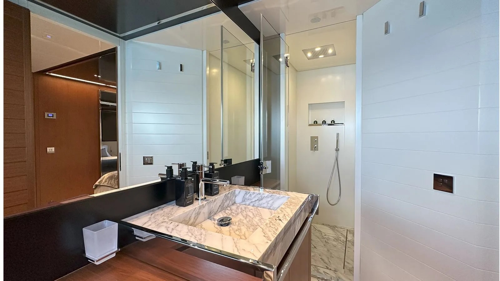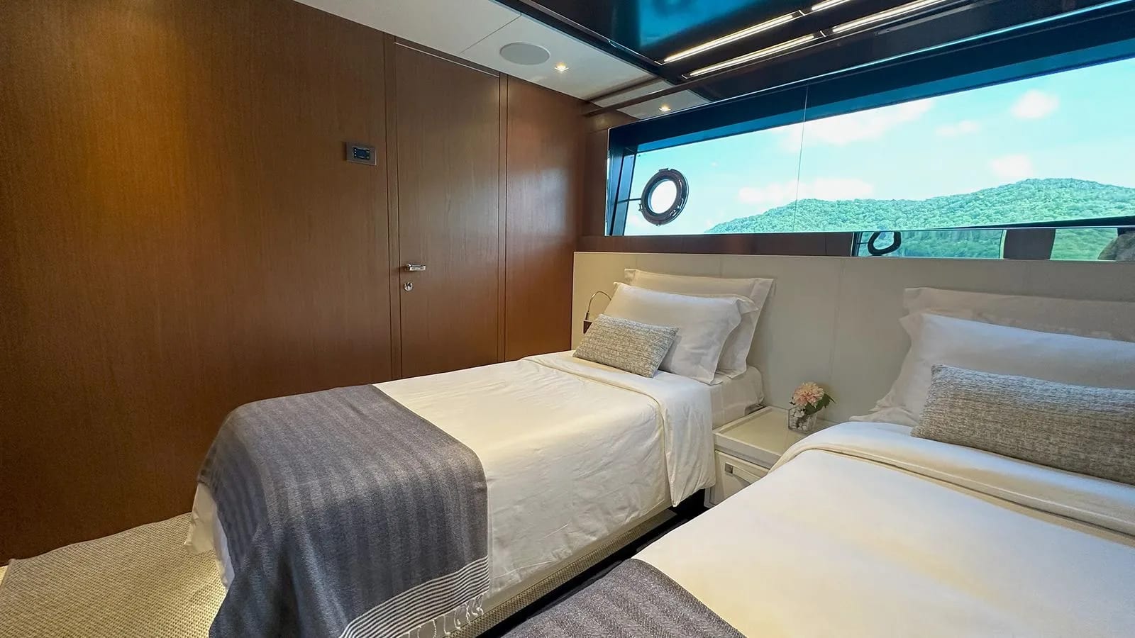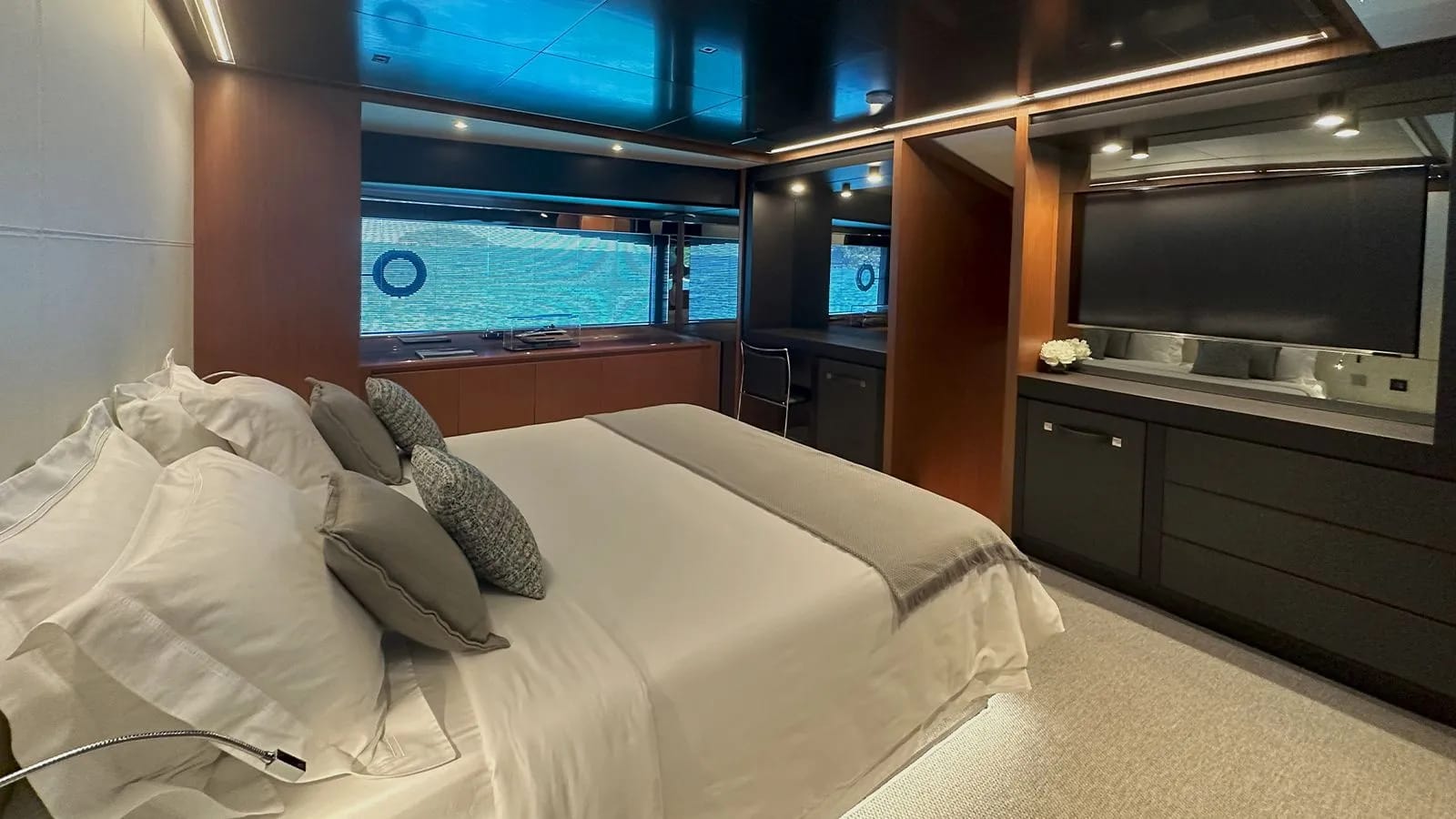 With accommodation for up to eight guests, ‘NOI’ offers a sanctuary of tranquility and elegance. The master suite, situated on the main deck, opens to breathtaking sea views, promising mornings filled with gentle sunlight. A VIP cabin, a double room, and a versatile cabin that converts from twin to double ensure a tailored experience for all. Each stateroom is a haven of plush comfort, where waking to the sound of the sea is a cherished delight. Thoughtful design and meticulous attention to detail ensure every night’s rest is as luxurious as the day.