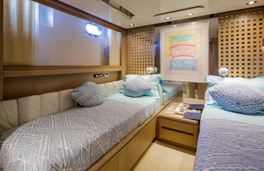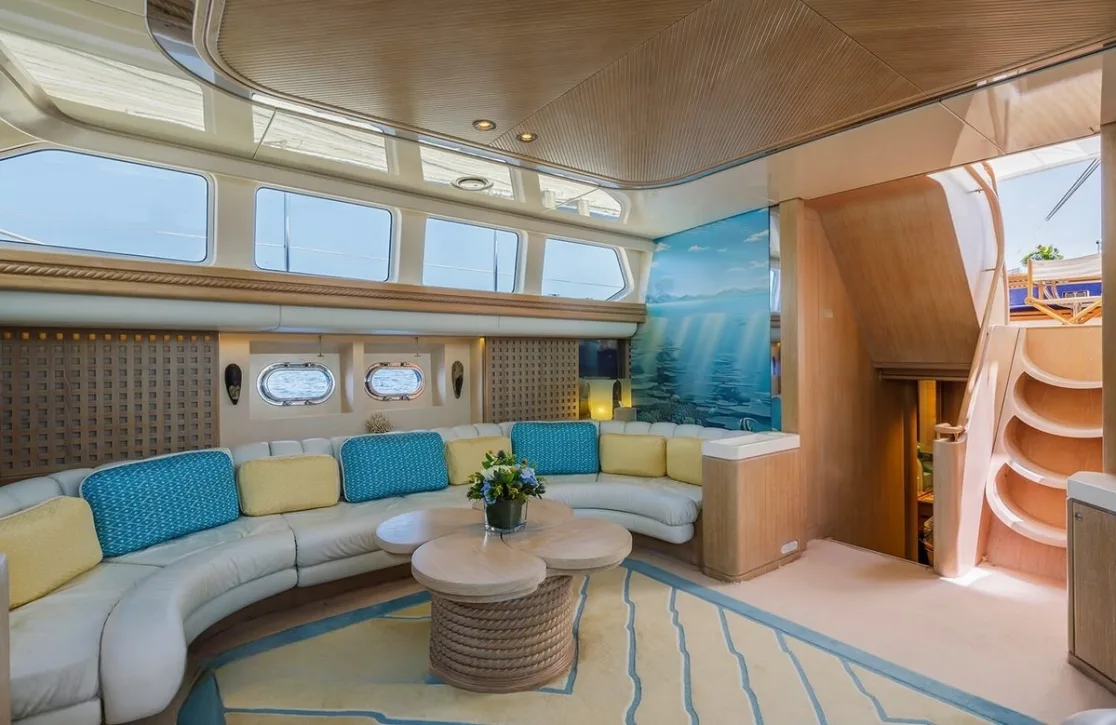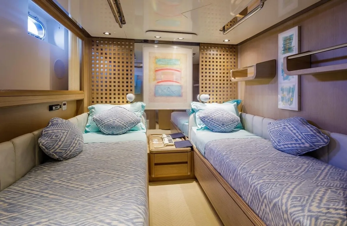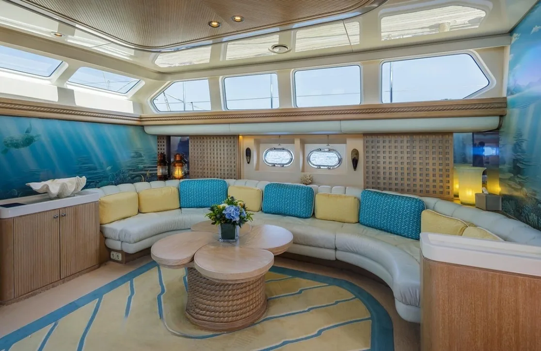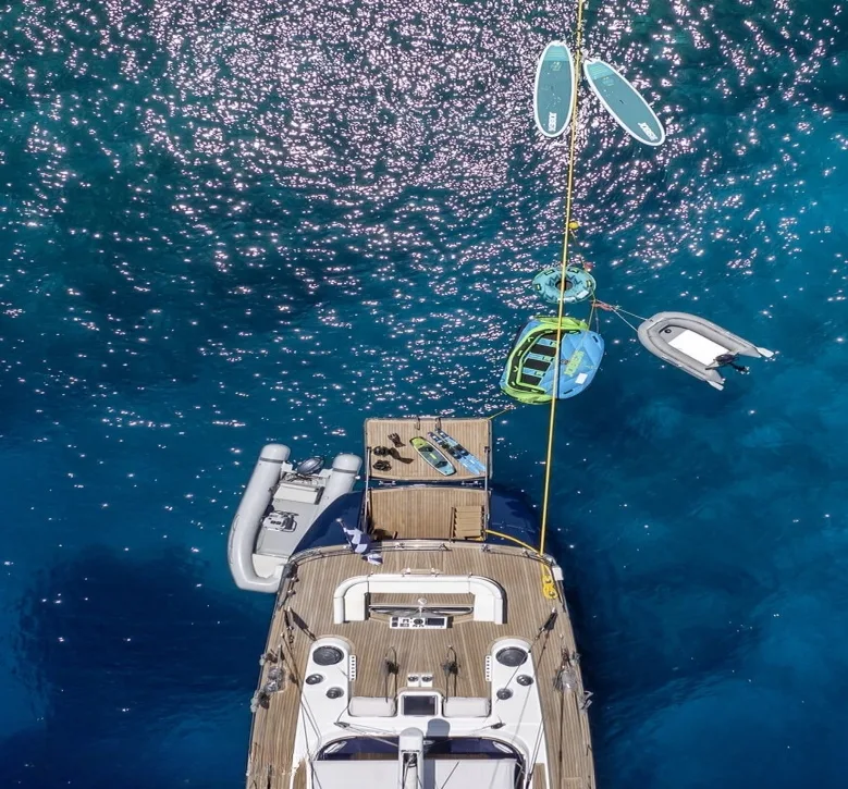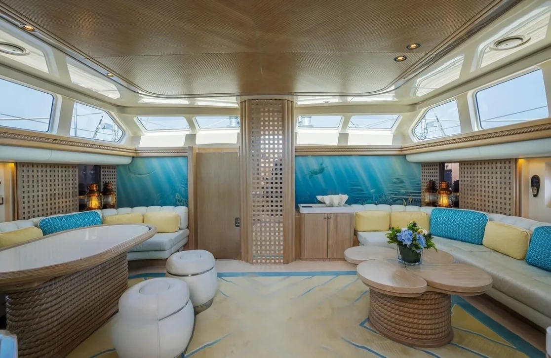 Nommo’s interior spaces, designed by Terence Disdale, envelop you in a world of understated elegance, where British sophistication meets cutting-edge comfort. As you unwind in the main salon, the gentle hum of the ocean serves as the perfect backdrop to your conversations. The yacht’s air conditioning ensures that each room offers a sanctuary from the sun, while high-speed Wi-Fi keeps you connected with the world beyond the horizon. Whether enjoying an al fresco dinner under the stars or a quiet moment on the sun-drenched deck, every aspect of Nommo is designed for your ultimate relaxation and enjoyment.