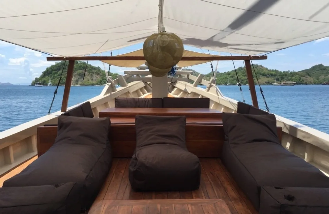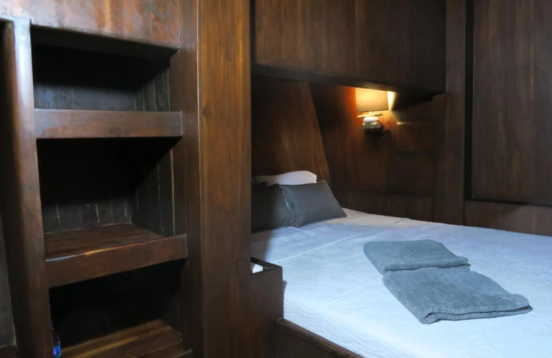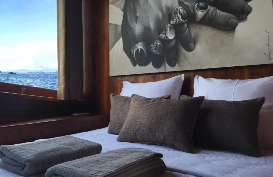 Accommodations on the Nyaman Boat are designed to offer a sanctuary of tranquility, with four beautifully appointed cabins that can host up to 12 guests. The master suite is a haven of serenity, complete with a king bed, while two double cabins and a twin cabin offer plush comfort with queen and single beds. Waking up to the gentle sway of the sea and the promise of another day of adventure is a luxury in itself, with each cabin offering a unique blend of privacy and style that ensures restful nights and rejuvenated mornings.