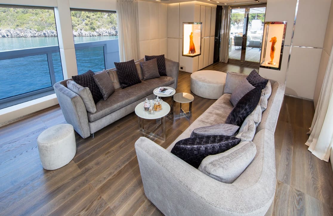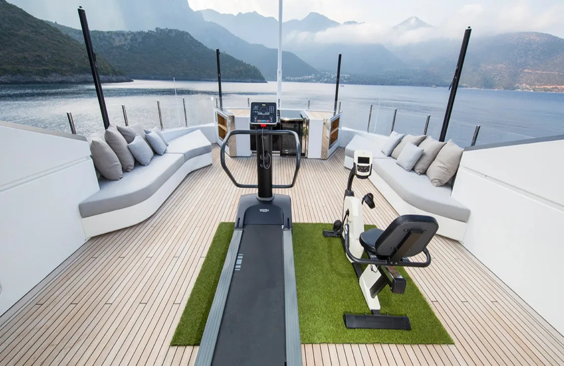 Life aboard Ouranos is a symphony of elegance and leisure, where every detail is curated for your enjoyment. The soothing embrace of the deck jacuzzi offers a perfect spot to unwind with a glass of champagne, while the state-of-the-art gym caters to those seeking to maintain their wellness routine at sea. As the sun sets, retreat to the serene beach club at the water’s edge, where tranquility reigns supreme. Connectivity is seamless with onboard Wi-Fi, and the elevator ensures effortless access to all levels of this floating haven. Throughout your voyage, the impeccable air conditioning system guarantees optimal comfort, allowing you to enjoy every moment in complete relaxation.