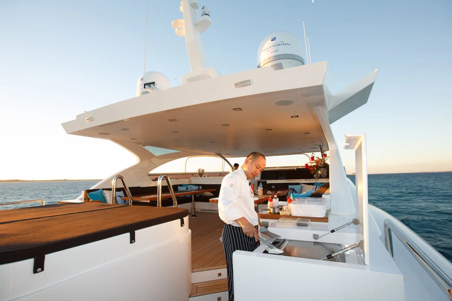 Aboard Paradise, every moment is crafted for your utmost enjoyment. Imagine spending sun-drenched afternoons in the inviting deck jacuzzi, surrounded by panoramic ocean views, or retreating to the cool interiors where Wi-Fi connectivity keeps you effortlessly in touch with the world, should you choose. The yacht’s air conditioning ensures a perfect climate, enhancing your comfort as you unwind. By evening, gather with friends and family in the spacious social areas where laughter and conversation flow as freely as the sea breeze.