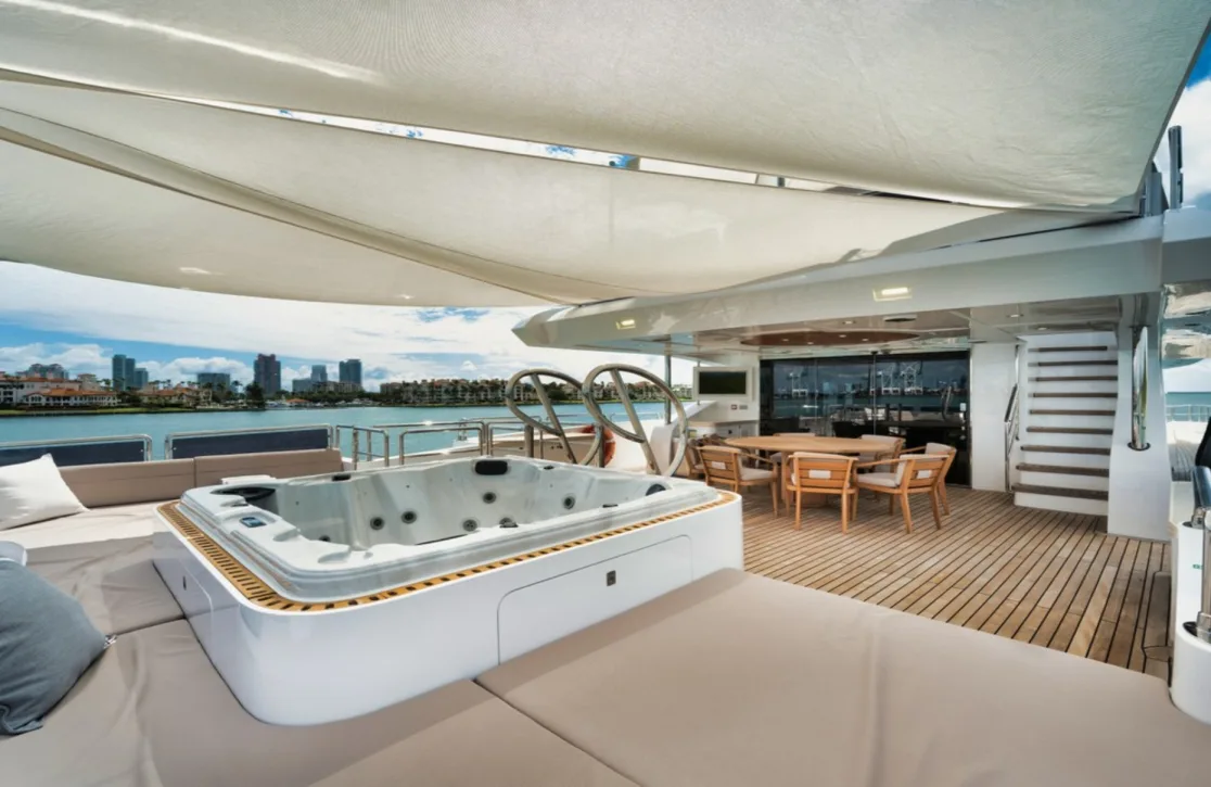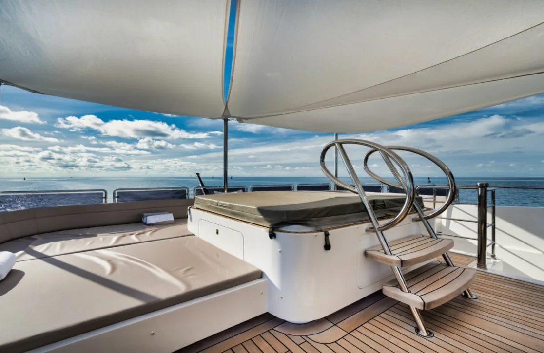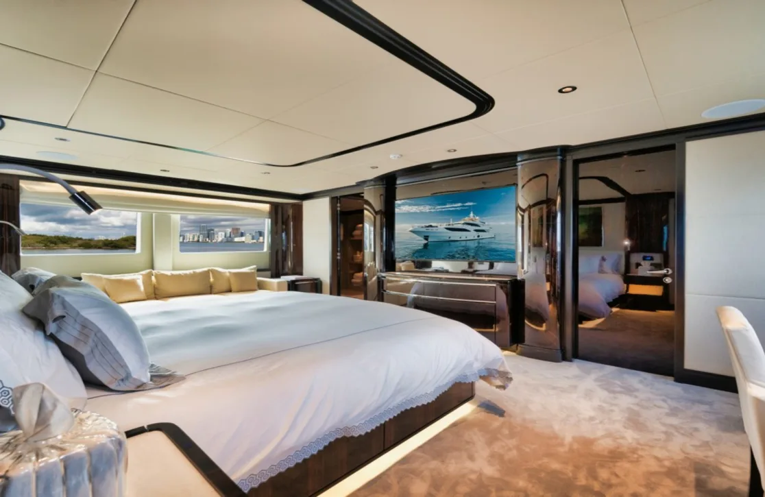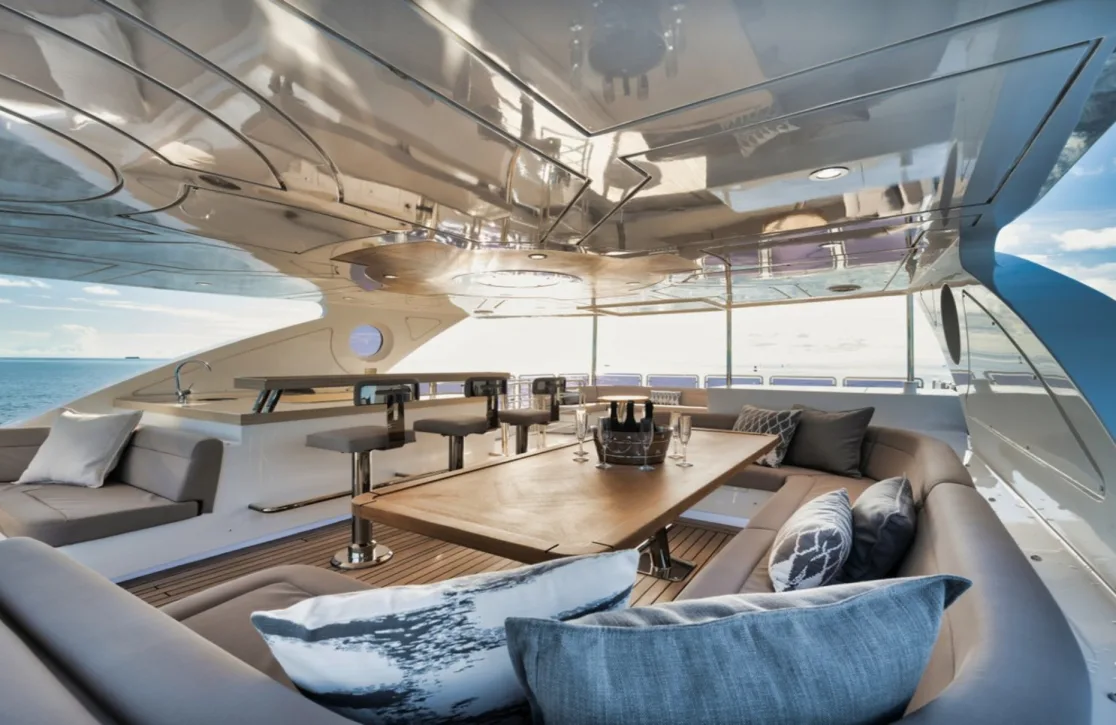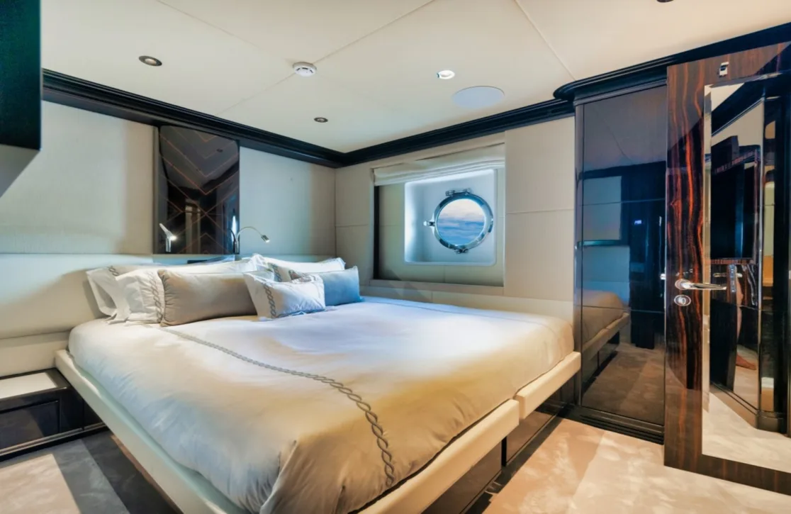 Step into a world where every desire is met with grace and elegance aboard ‘Persistence.’ Relaxation comes naturally as you soak in the deck jacuzzi, a chilled drink in hand, while the horizon stretches infinitely before you. The sun deck, adorned with sunpads, offers a sanctuary for sunbathing or stargazing, complete with an exterior bar for refreshing cocktail moments. Her sleek swimming platform beckons you for invigorating dips in the azure sea, and an outdoor shower awaits to refresh you. Inside, the climate-controlled interiors provide a retreat after a day in the sun, with Wi-Fi keeping you connected to the outside world, if you so choose.