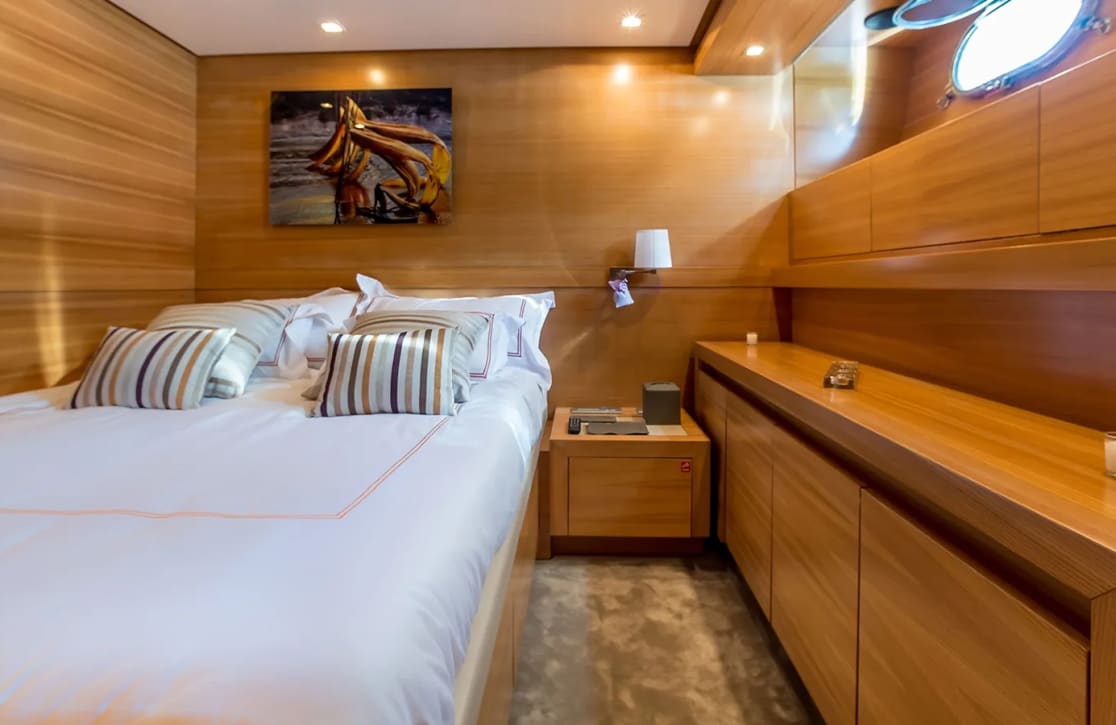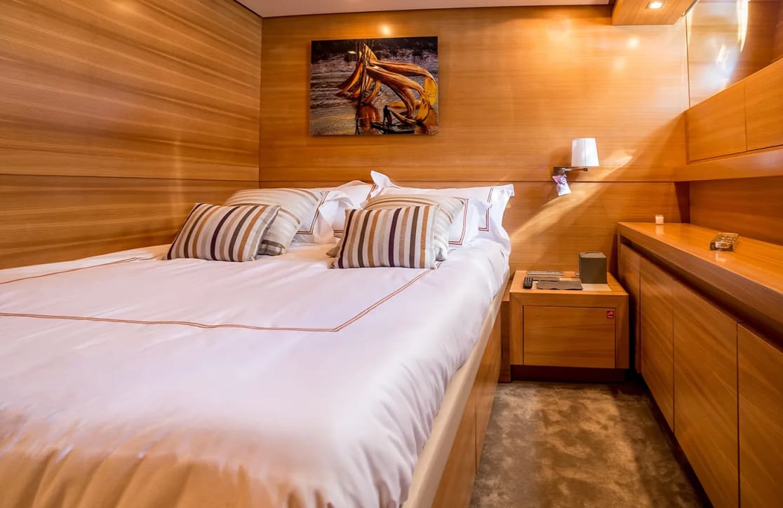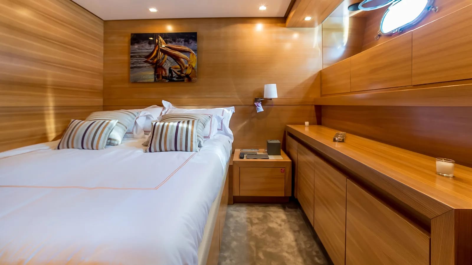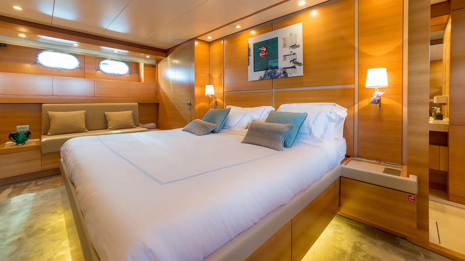 Pertula’s accommodations are a testament to refined comfort, hosting up to eight guests in four beautifully appointed cabins. Each morning, wake to the gentle sound of the sea in the sumptuous master suite, featuring a king-sized bed and panoramic views. The VIP, double, and twin cabins offer equally inviting sanctuaries, each meticulously designed to ensure a restful night’s sleep. With a dedicated crew of five attending to every detail, your stay aboard promises a seamless blend of privacy and attentive service.