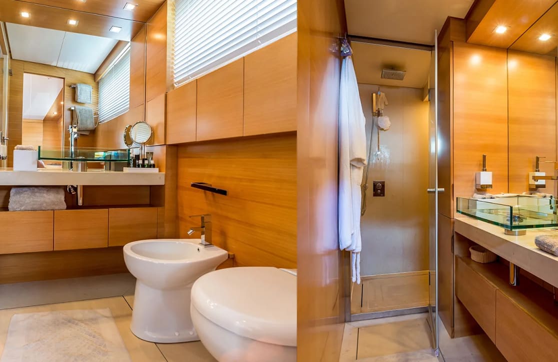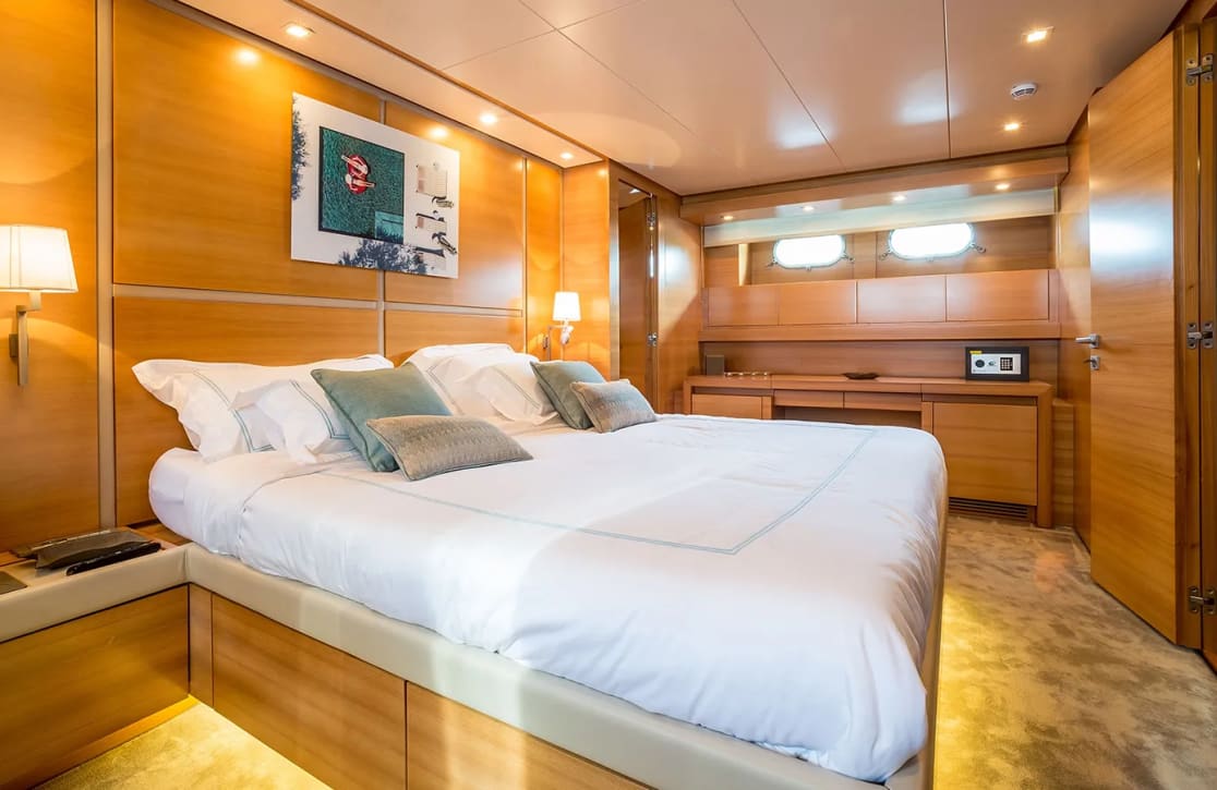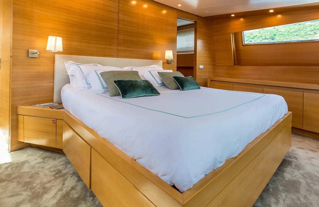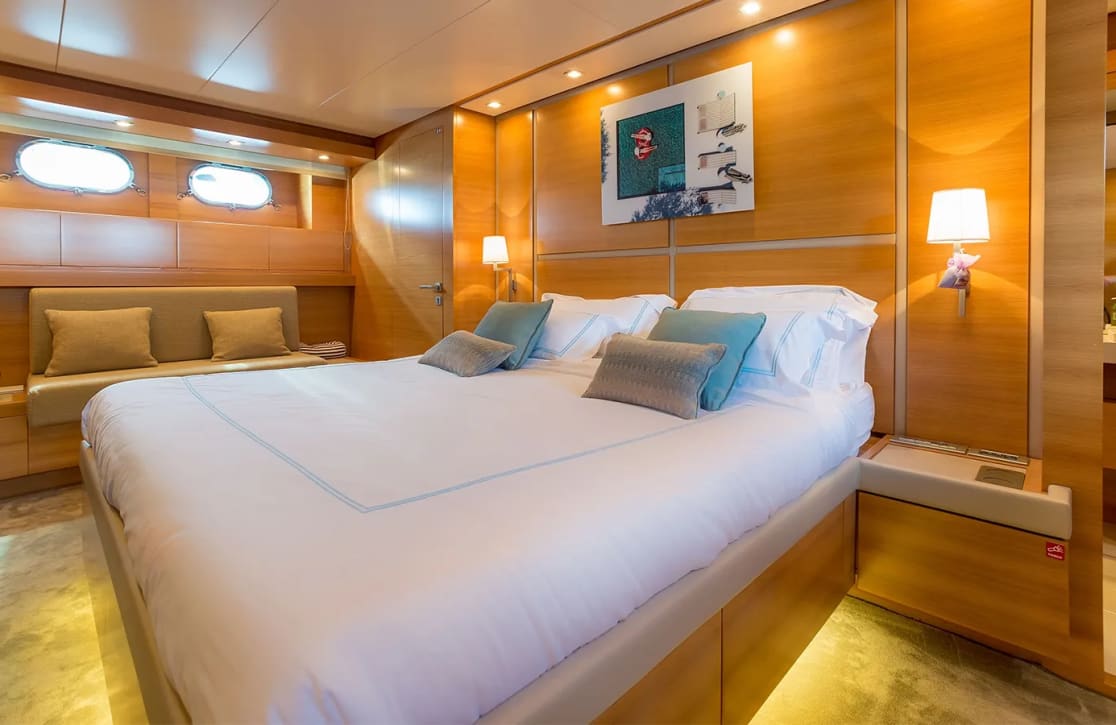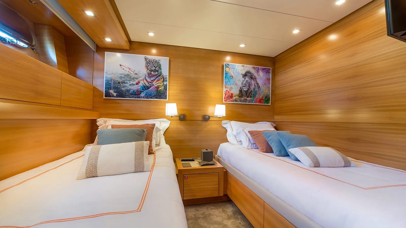 Pertula’s accommodations are a testament to refined comfort, hosting up to eight guests in four beautifully appointed cabins. Each morning, wake to the gentle sound of the sea in the sumptuous master suite, featuring a king-sized bed and panoramic views. The VIP, double, and twin cabins offer equally inviting sanctuaries, each meticulously designed to ensure a restful night’s sleep. With a dedicated crew of five attending to every detail, your stay aboard promises a seamless blend of privacy and attentive service.
