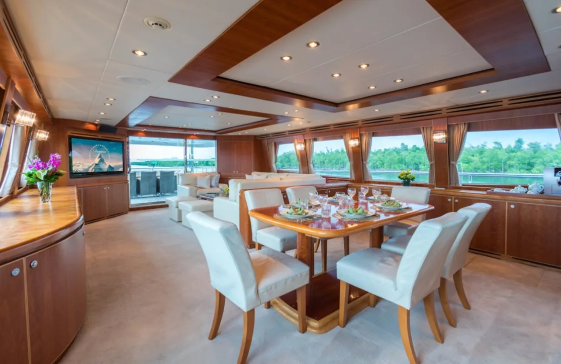 Picnic offers sanctuary to up to eight guests in four beautifully appointed cabins, each promising a restful escape. The master suite is a testament to grandeur with its plush furnishings, while the VIP cabin exudes a sense of elegance and privacy. Additional double and twin cabins provide versatility for family and friends. Awake to the gentle rocking of the sea and start your day with a view that is nothing short of spectacular. The thoughtful design ensures that every guest experiences the tranquility and comfort of a five-star retreat, making each night aboard a dream.