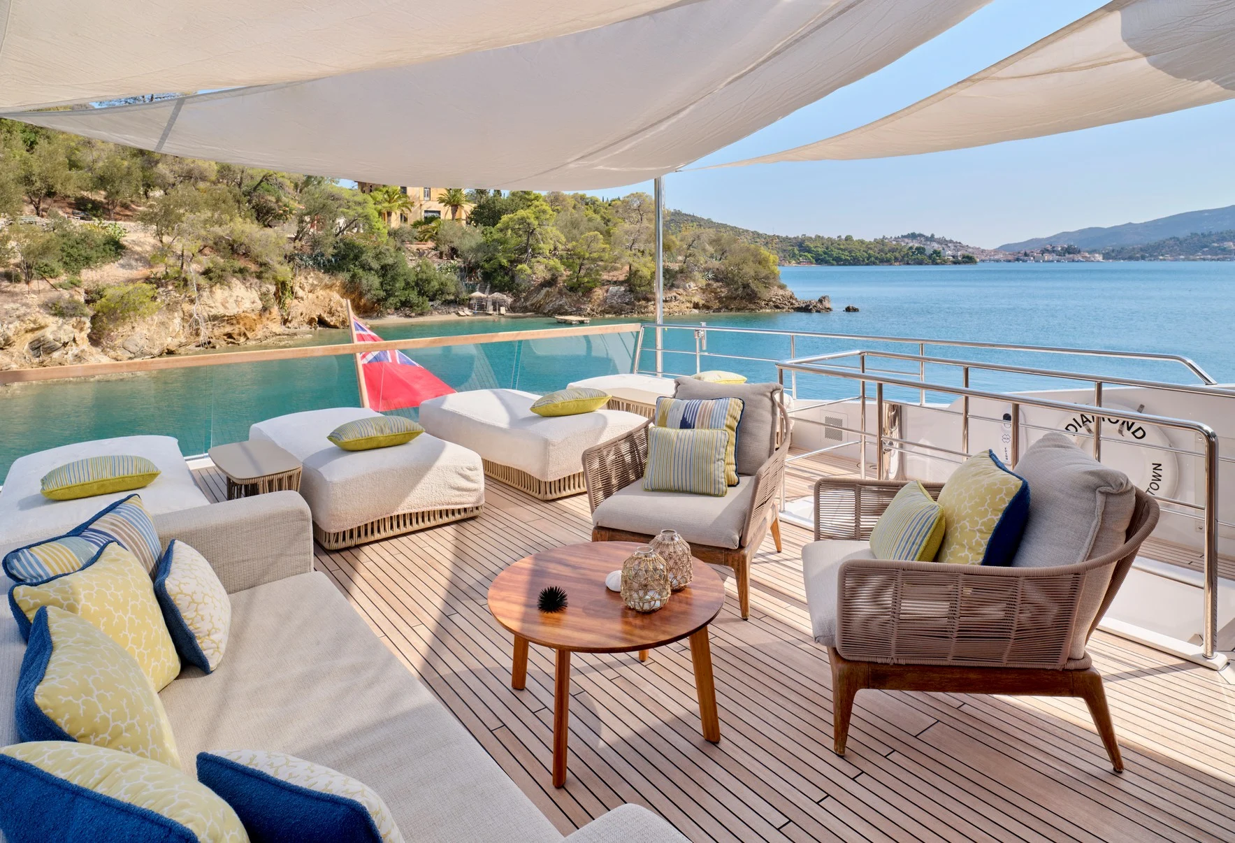 Aboard Rare Diamond, life unfolds with seamless elegance and comfort, designed for both tranquil retreats and lively gatherings. The sun deck serves as a haven for sun worshippers, while an exterior bar offers a chic setting for sunset cocktails. Inside, the yacht is equipped with state-of-the-art amenities including Wi-Fi, satellite TV, and air conditioning, ensuring you remain connected and comfortable. The hydraulic swim platform invites refreshing dips into the sea, and the stabilizers both at anchor and underway guarantee a smooth and restful voyage, no matter where your travels take you.