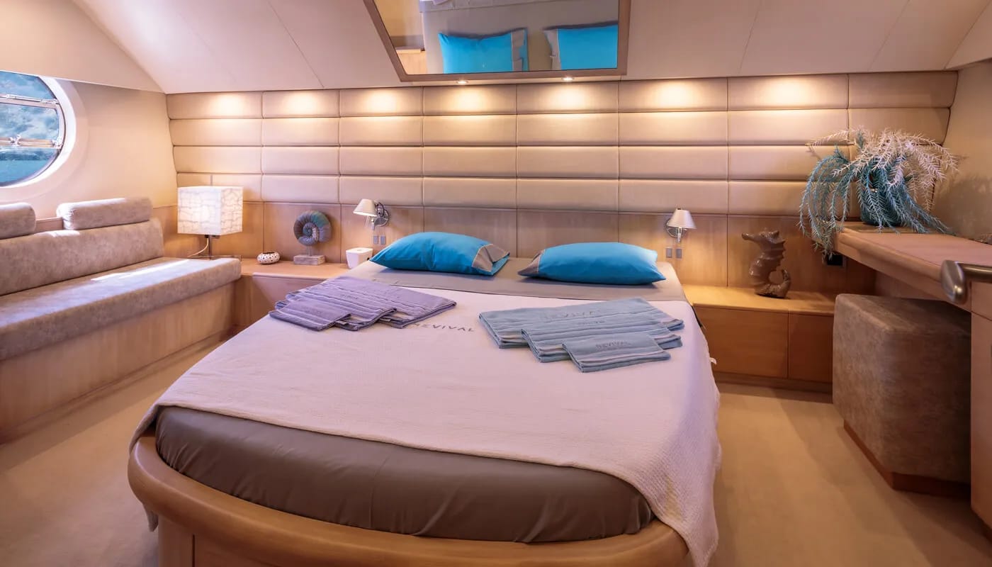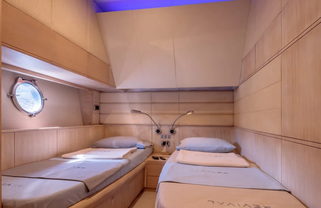 Revival offers accommodations for up to eight discerning guests across four beautifully appointed cabins, ensuring each guest experiences the utmost comfort and privacy. The master suite, a sanctuary of elegance, and the VIP cabin, exuding understated charm, both promise restful nights and rejuvenating mornings. Two additional twin cabins provide ample space for relaxation and unwinding. Each morning, wake to the gentle sounds of the sea and the promise of new adventures, as the yacht glides smoothly to your next destination.