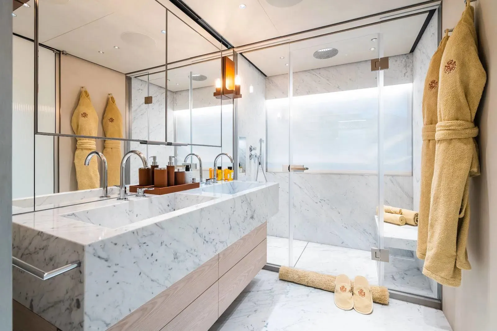 The accommodations aboard RMF are a testament to refined comfort and thoughtful design, housing up to ten guests across five luxurious cabins. Each morning, awaken in a space bathed in natural light, with long windows framing the endless sea. The master suite is a haven of tranquility, complemented by two double and two twin suites, each offering a unique blend of privacy and elegance. The attentive nine-member crew ensures that every detail is meticulously managed, allowing you to fully immerse in the serene pleasures of the yachting lifestyle.