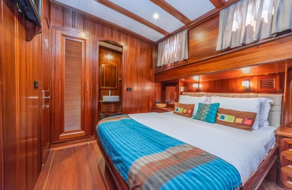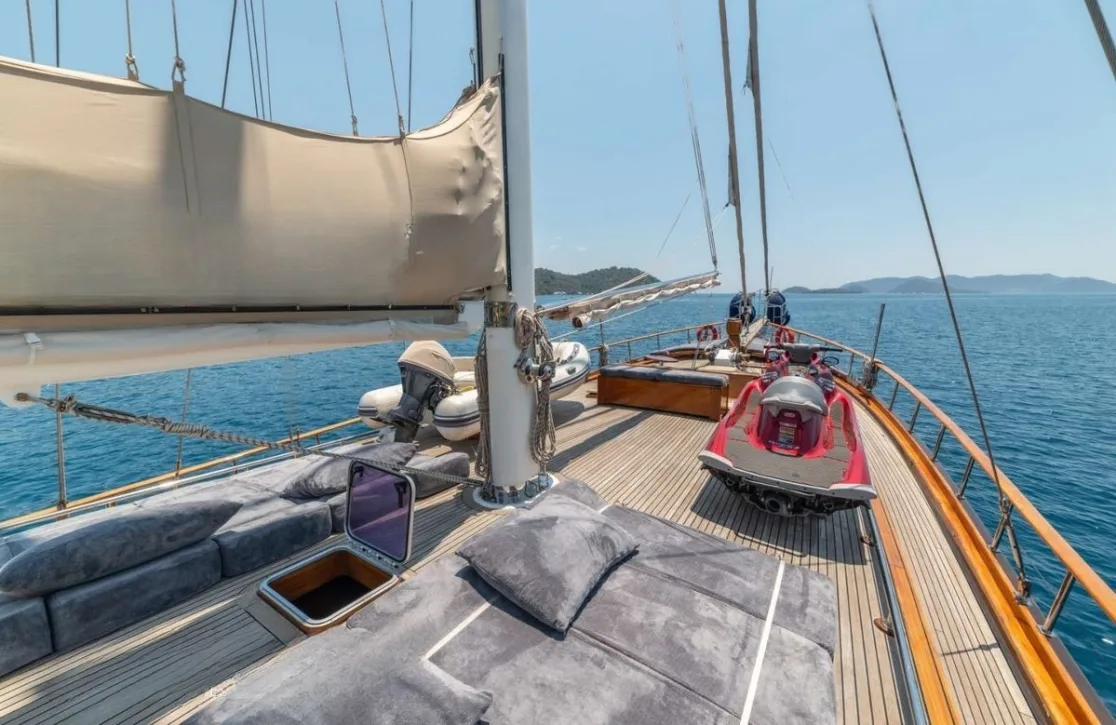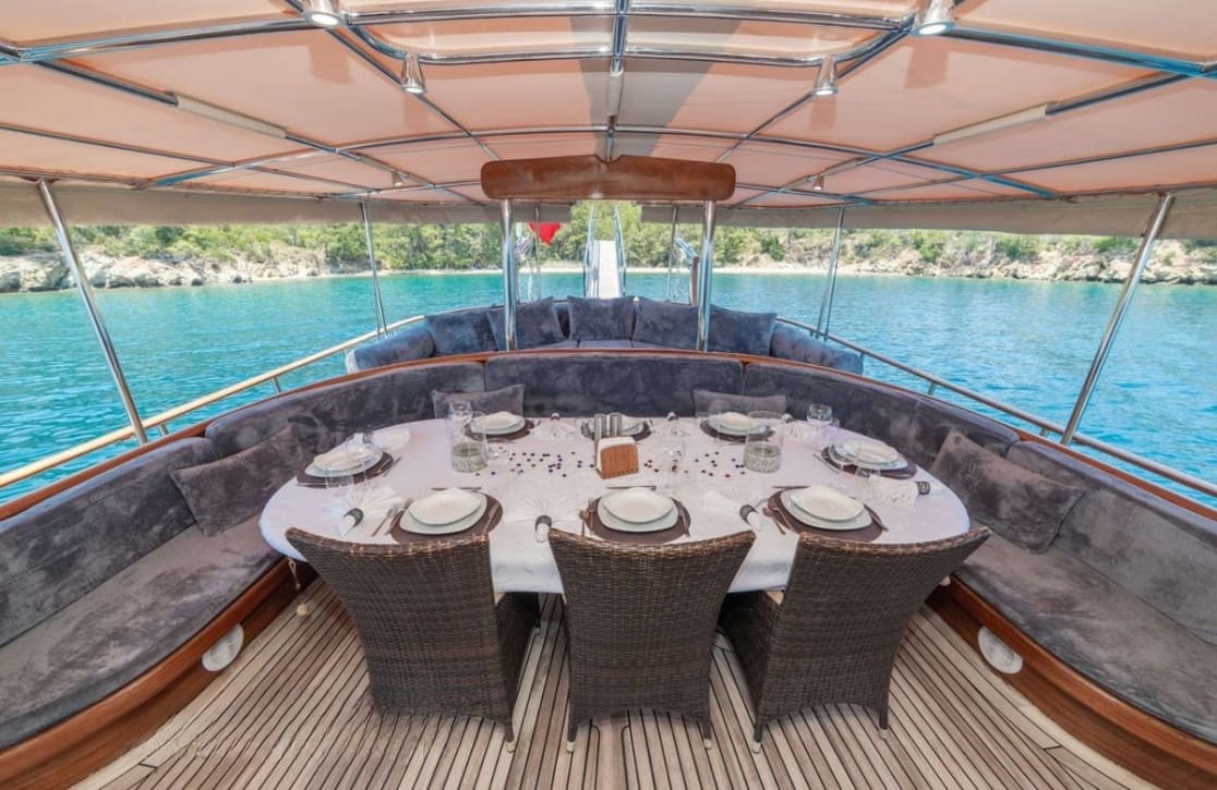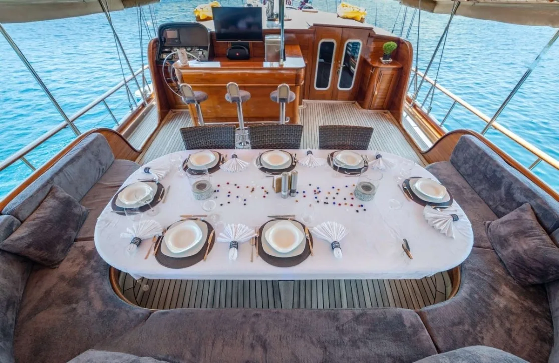 Sema Tuana’s interiors are a haven of tranquility, where air conditioning ensures a cool respite from the sun-drenched days. As evening descends, the yacht transforms into a vibrant social hub, with alfresco dining under the starlit sky offering a sublime culinary experience. Her decks are spacious enough for both intimate gatherings and quiet moments of reflection, promising an exquisite balance of relaxation and entertainment.