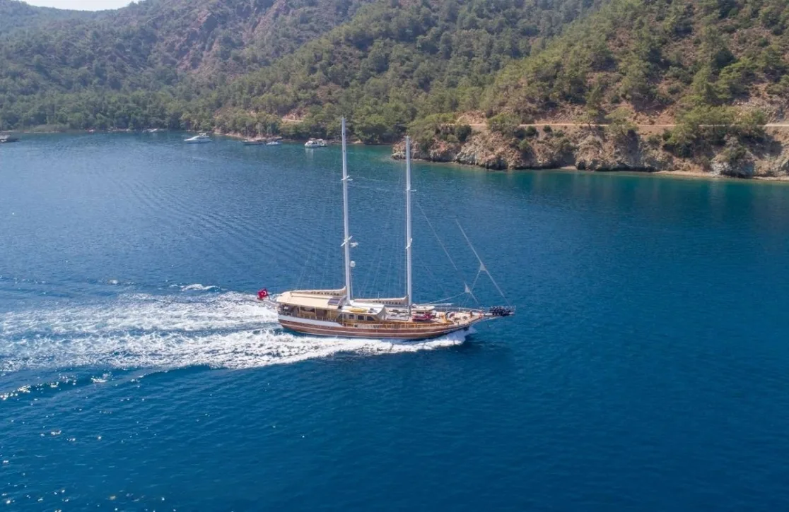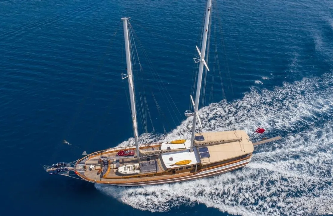 Envision a week aboard Sema Tuana, a 105-foot gulet yacht crafted by the Custom shipyard, where every sunrise and sunset becomes a cherished memory on the Mediterranean. With its graceful lines and expansive decks, Sema Tuana invites you to explore both the azure waters and picturesque coastal towns in unparalleled comfort. Her shallow draft allows access to secluded beaches and hidden coves, ensuring each day presents a new adventure. With a cruising speed of 10 knots, you will glide effortlessly from one enchanting destination to the next, as the professional crew of six anticipates your every need.