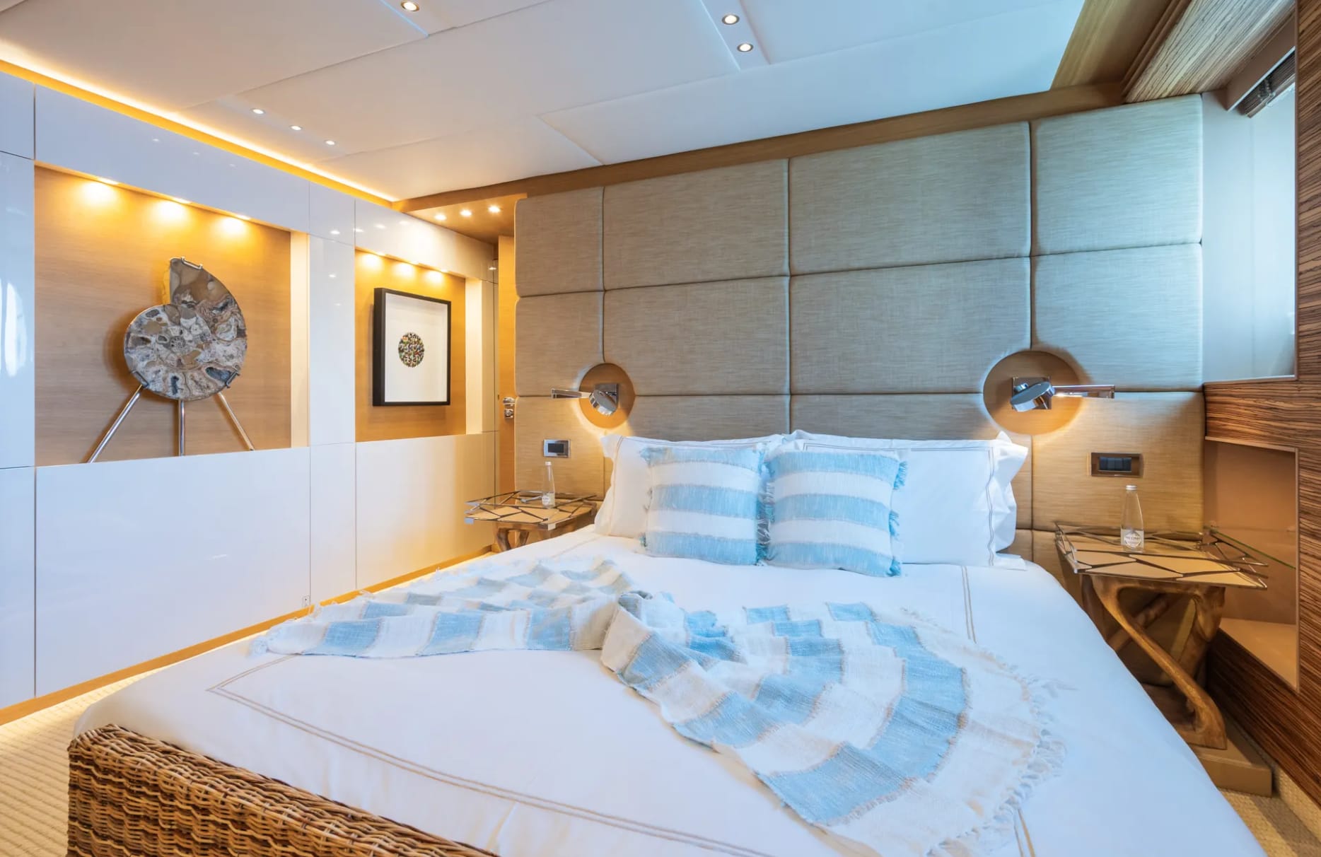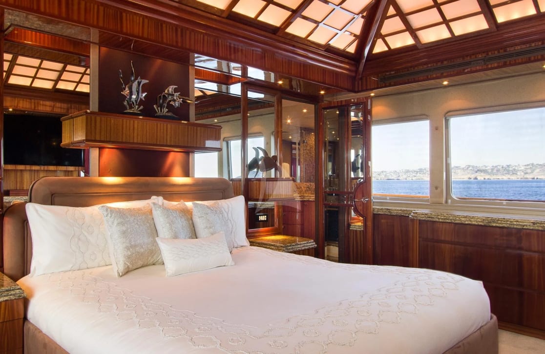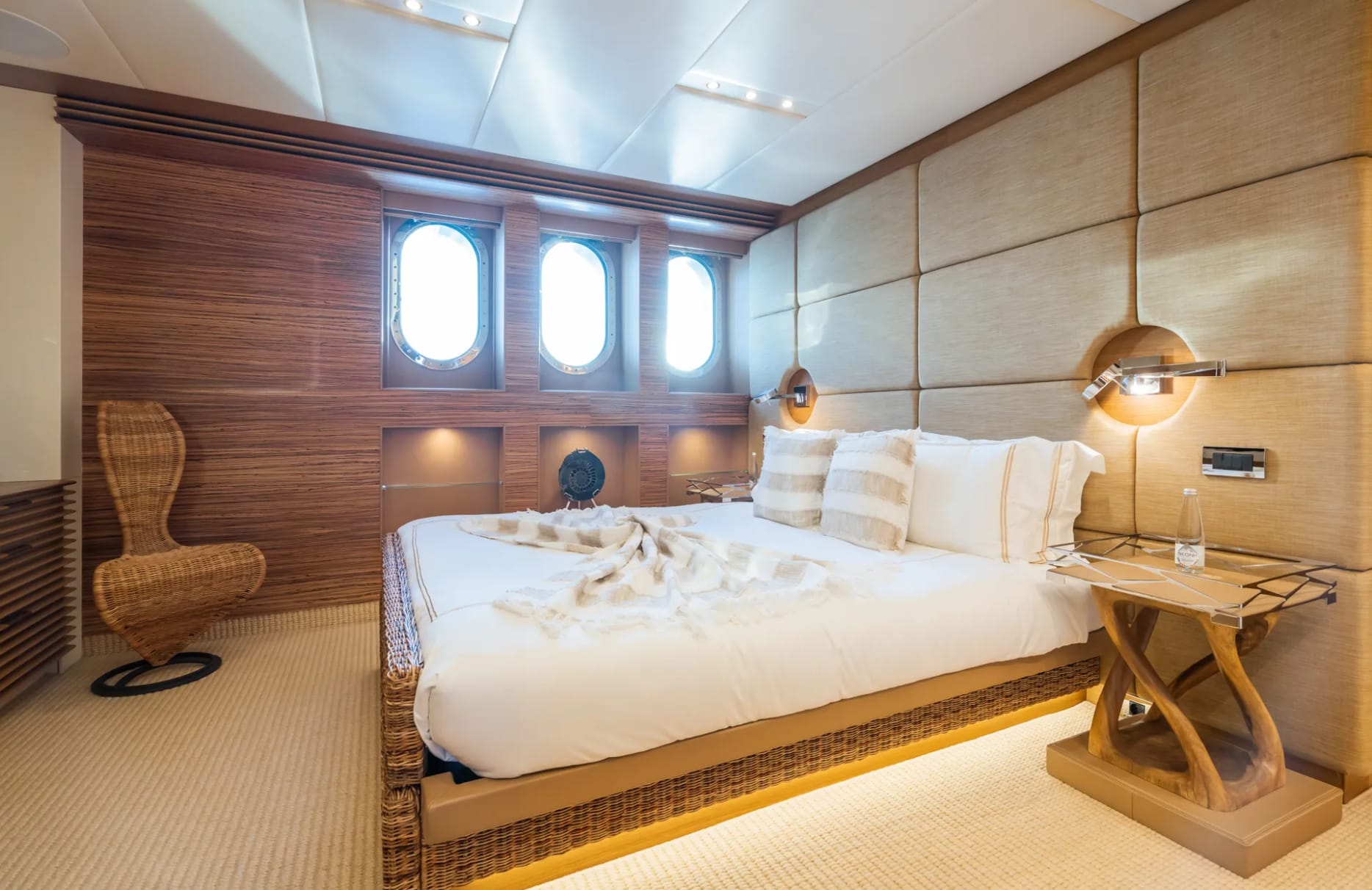 Serenity’s guest accommodations offer an intimate retreat for up to eight guests across four beautifully appointed suites. Each room, featuring a king-sized bed, promises serene mornings as the sun dances across the water, gently rousing you for another day of adventure. The master suite and three additional double cabins provide a haven of comfort and style, where restful nights and rejuvenating mornings are a given. Your experience is further enhanced by the attentive care of a dedicated six-member crew, ensuring your stay is nothing short of exceptional.