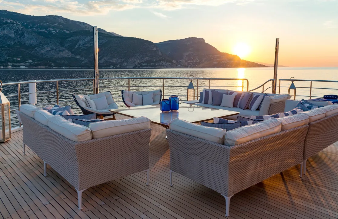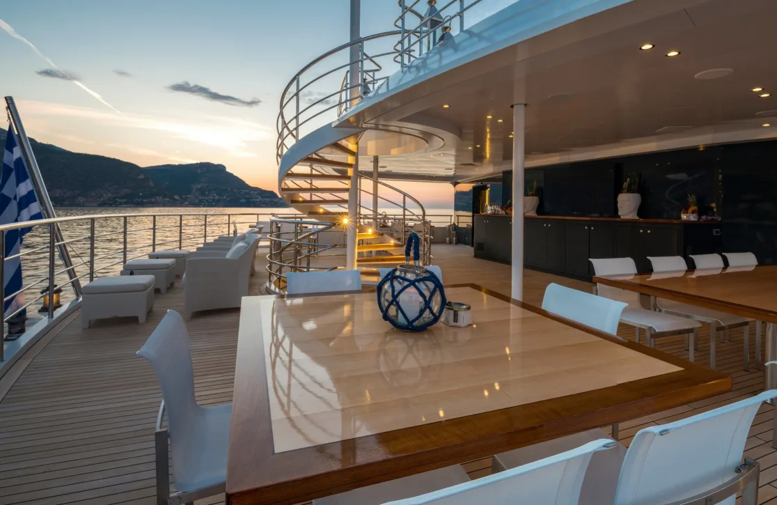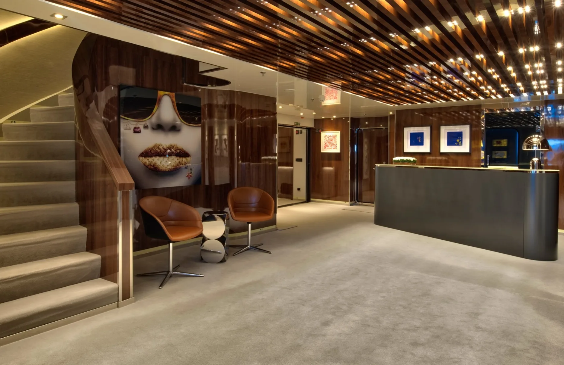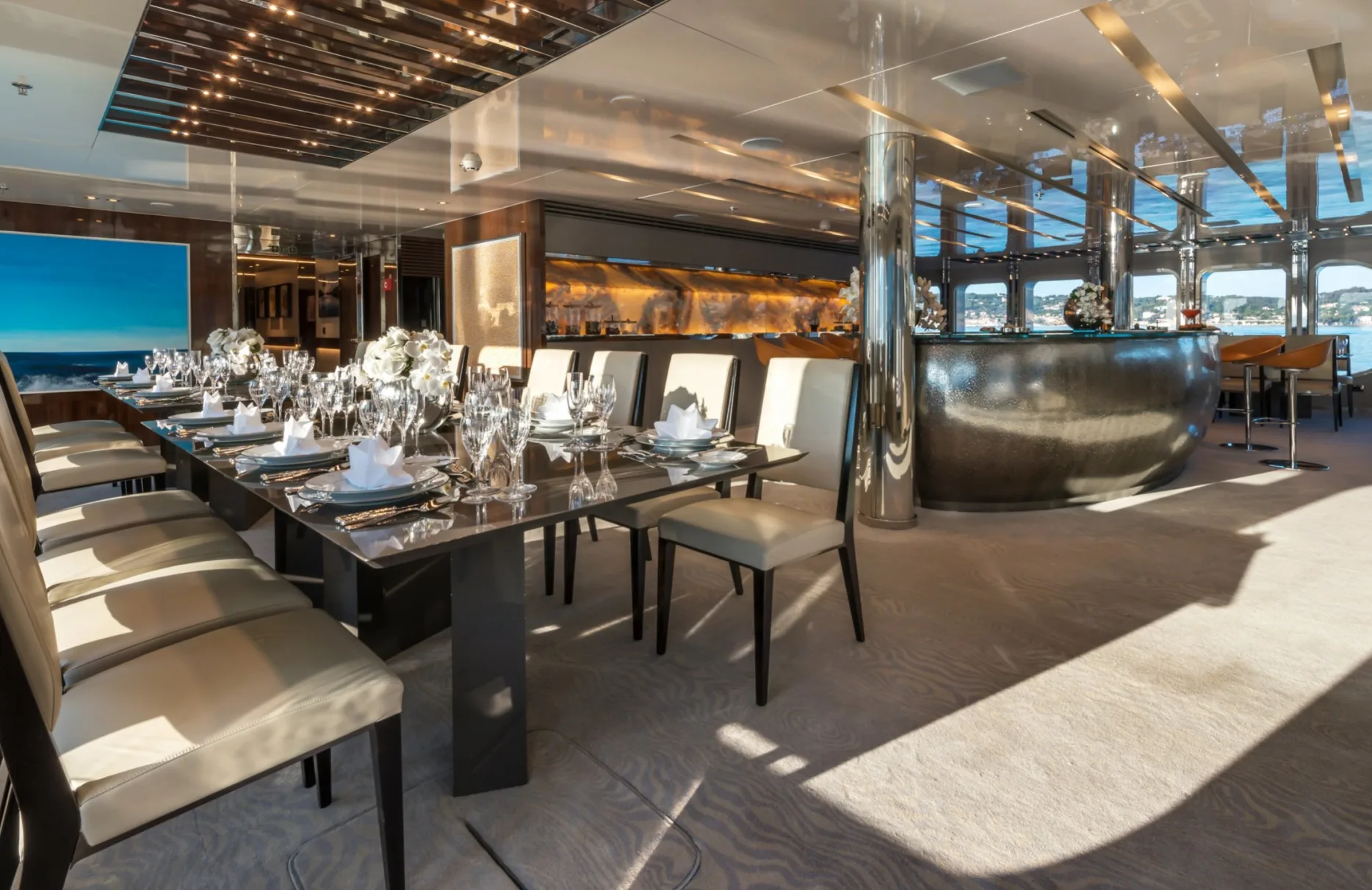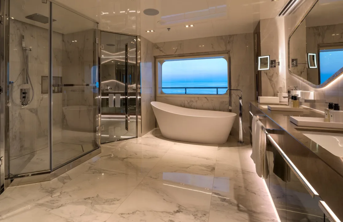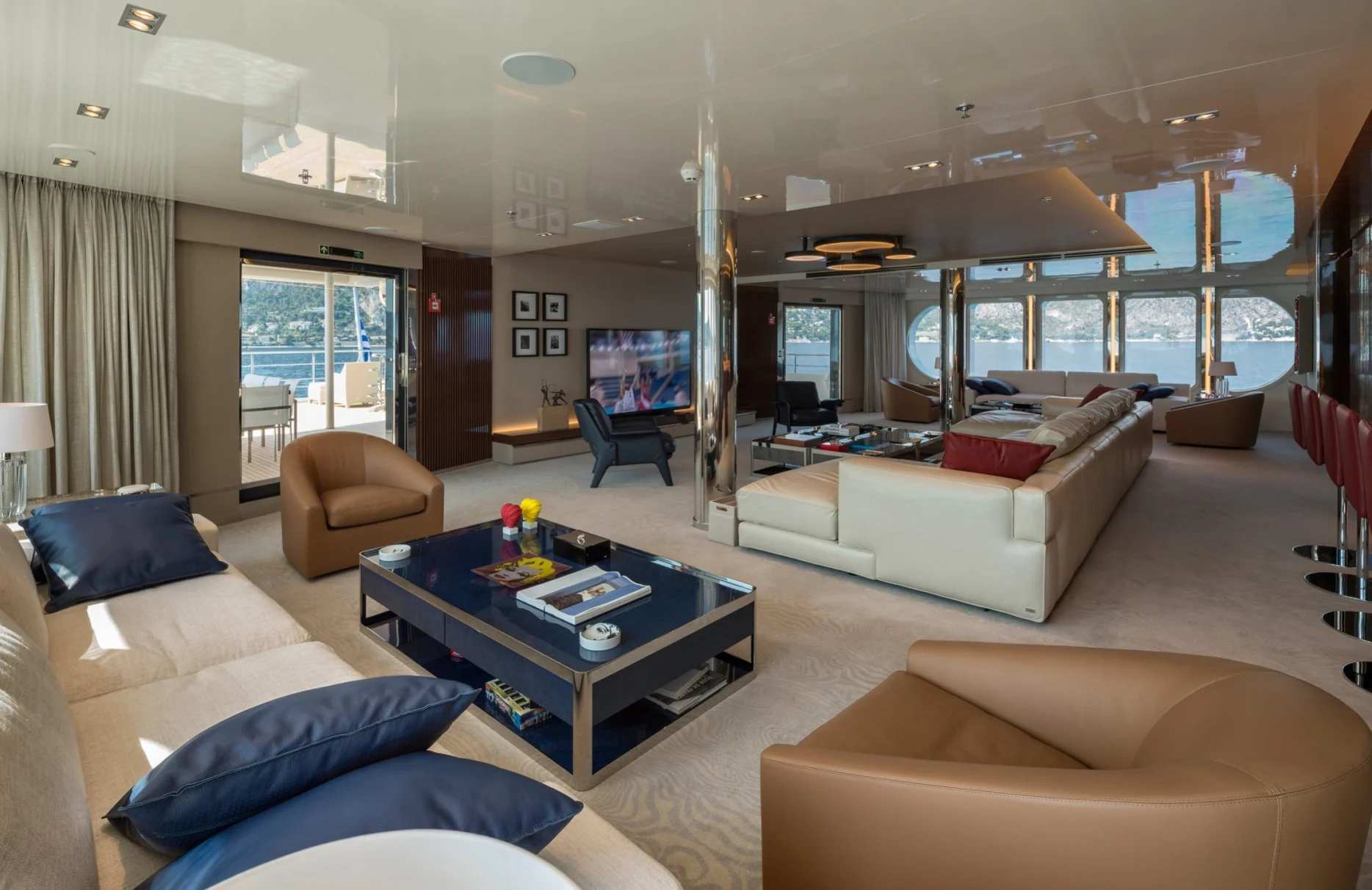 Aboard Serenity, every moment is crafted to perfection with spaces that invite both relaxation and engagement. Begin your day with a refreshing swim in the inviting pool or maintain your wellness routine in the state-of-the-art gym. As the day unfolds, find solace in the deck jacuzzi, surrounded by panoramic views, or stay connected with high-speed Wi-Fi as you lounge in the sophisticated interior spaces. The air-conditioned comfort ensures an unsurpassed experience, whether enjoying a quiet afternoon or hosting an evening under the stars.